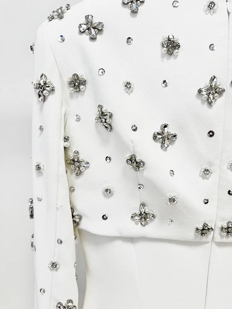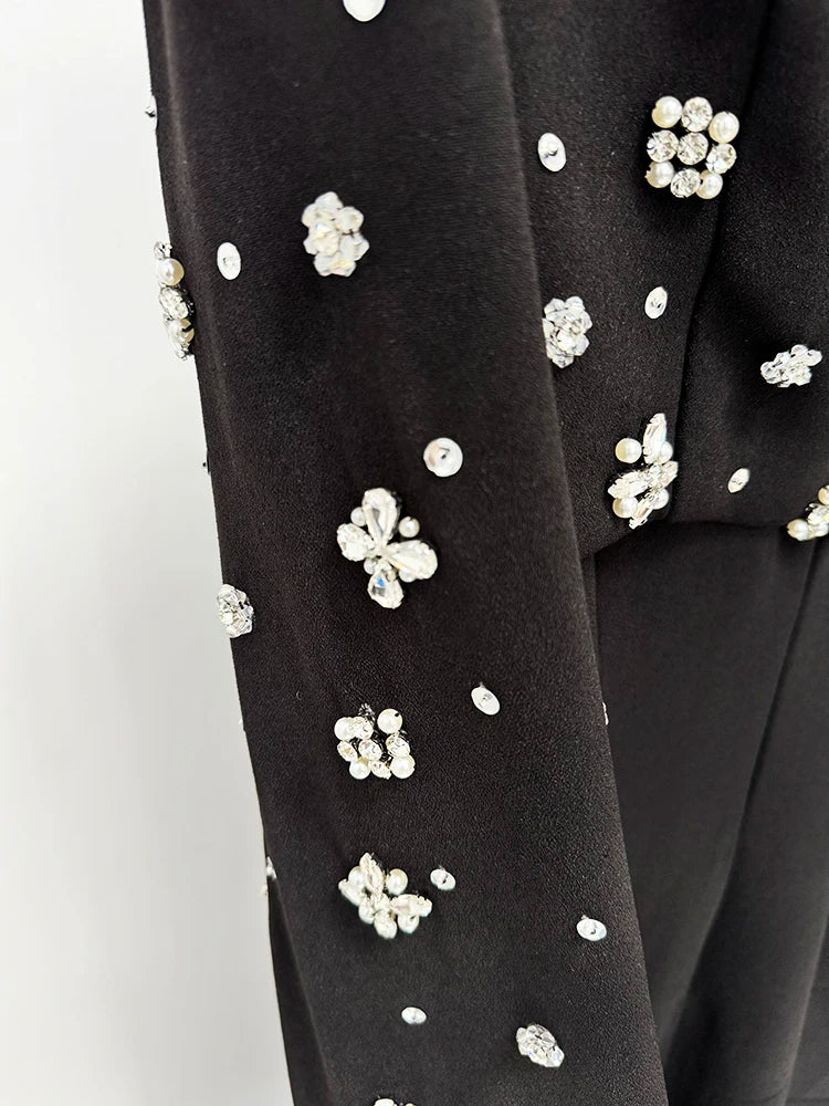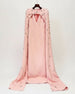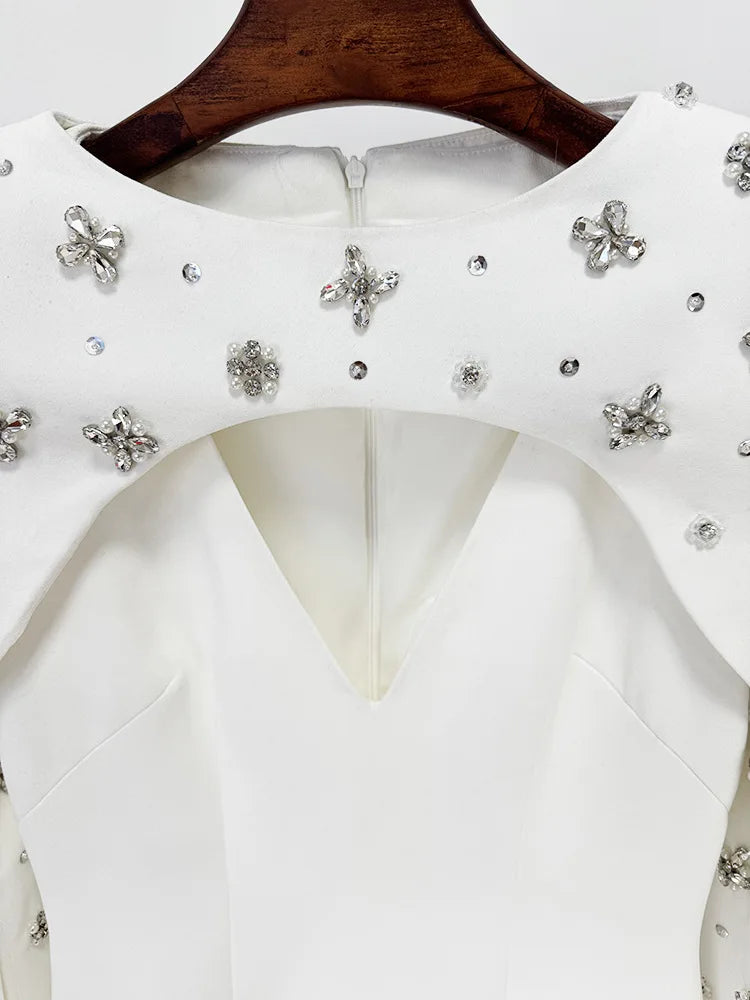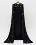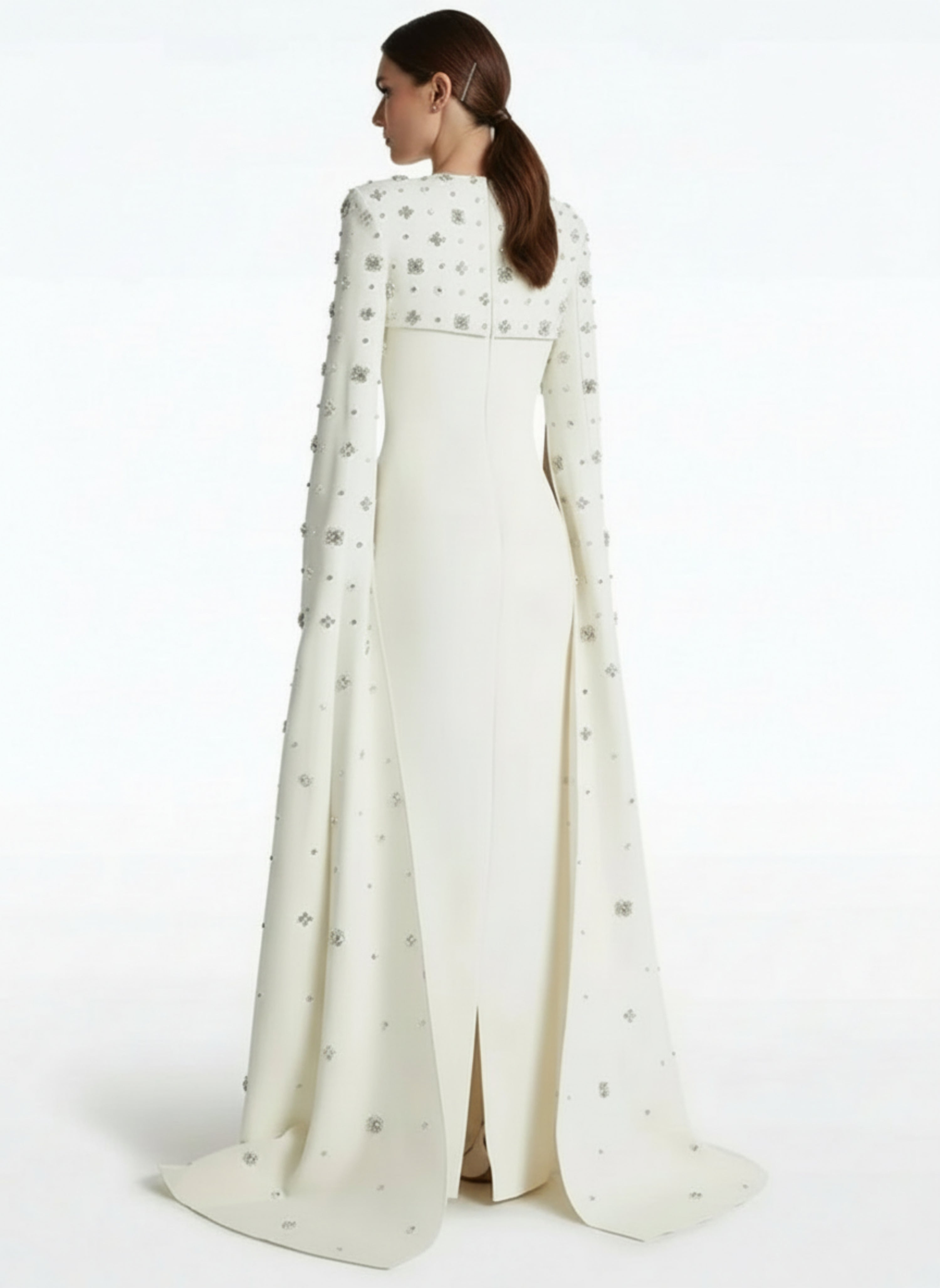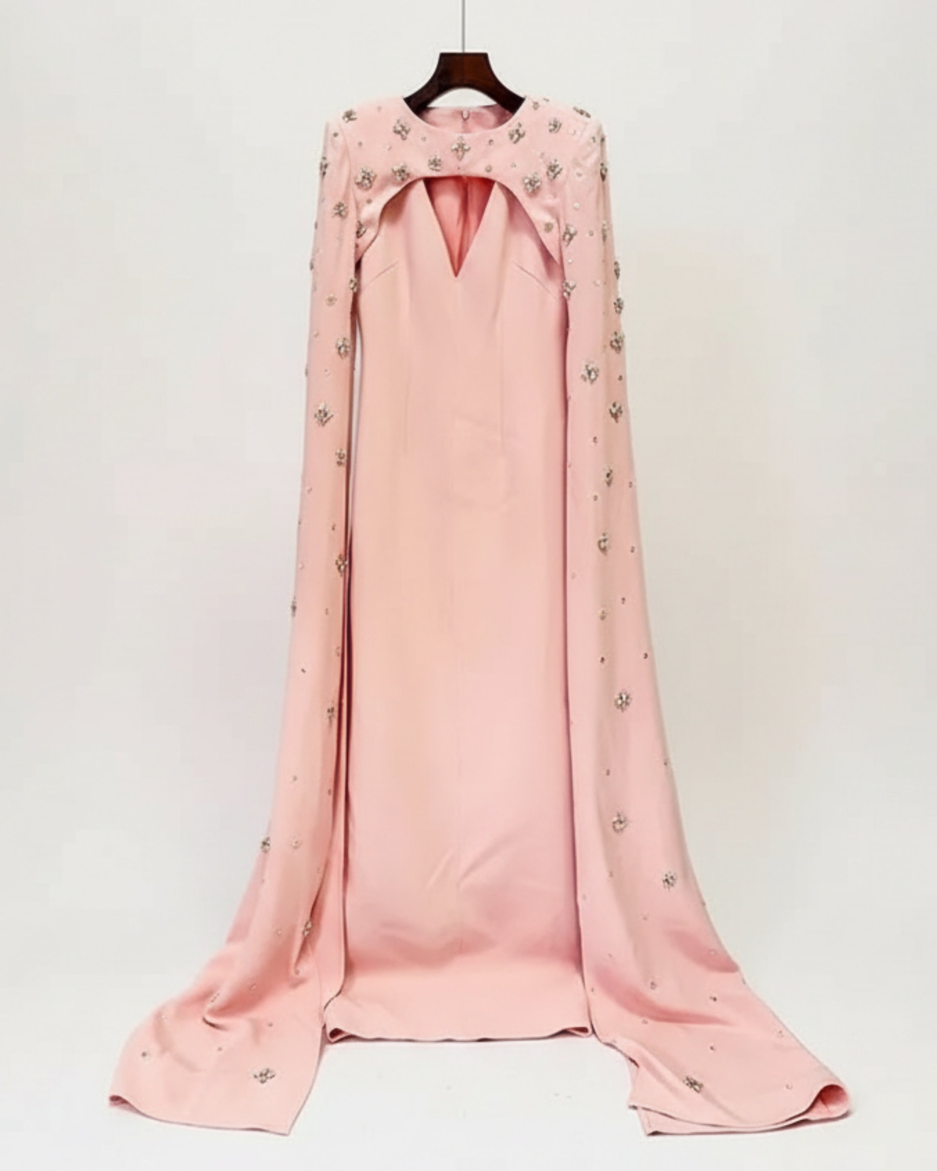 Dramatic cape sleeves sweep to the ground, highlighting the delicate crystal embellishments placed along the sleeves and neckline. Finished in a smooth crepe-blend or taffeta fabrication, it’s designed for formal nights and upscale events.