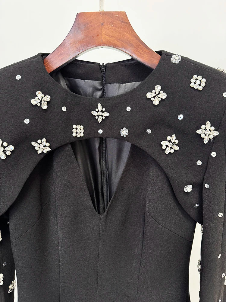 This luxurious evening gown dress features a maxi length silhouette with a modern keyhole neckline.