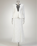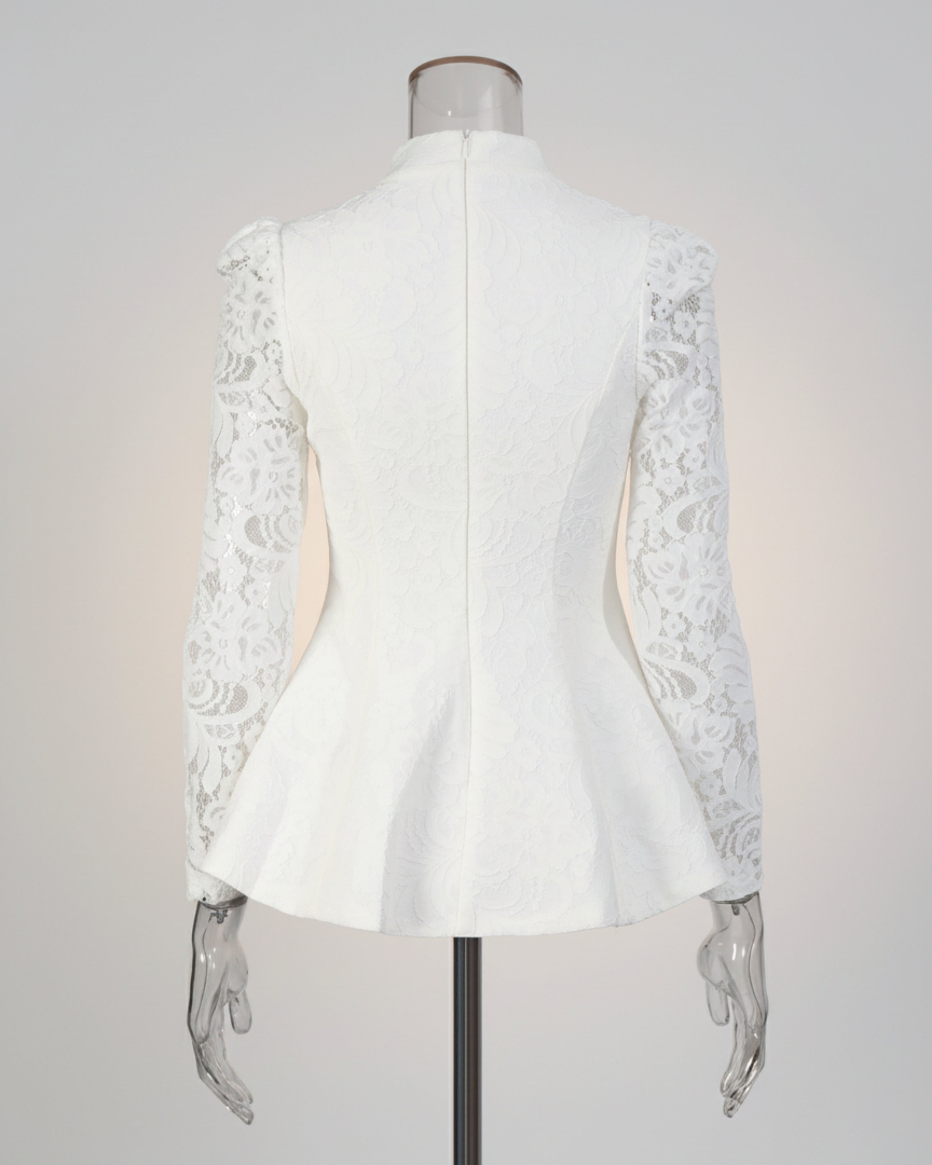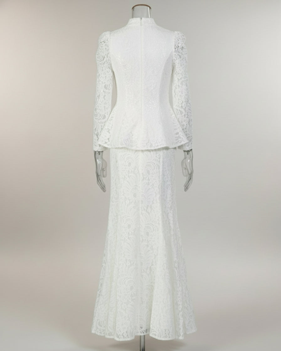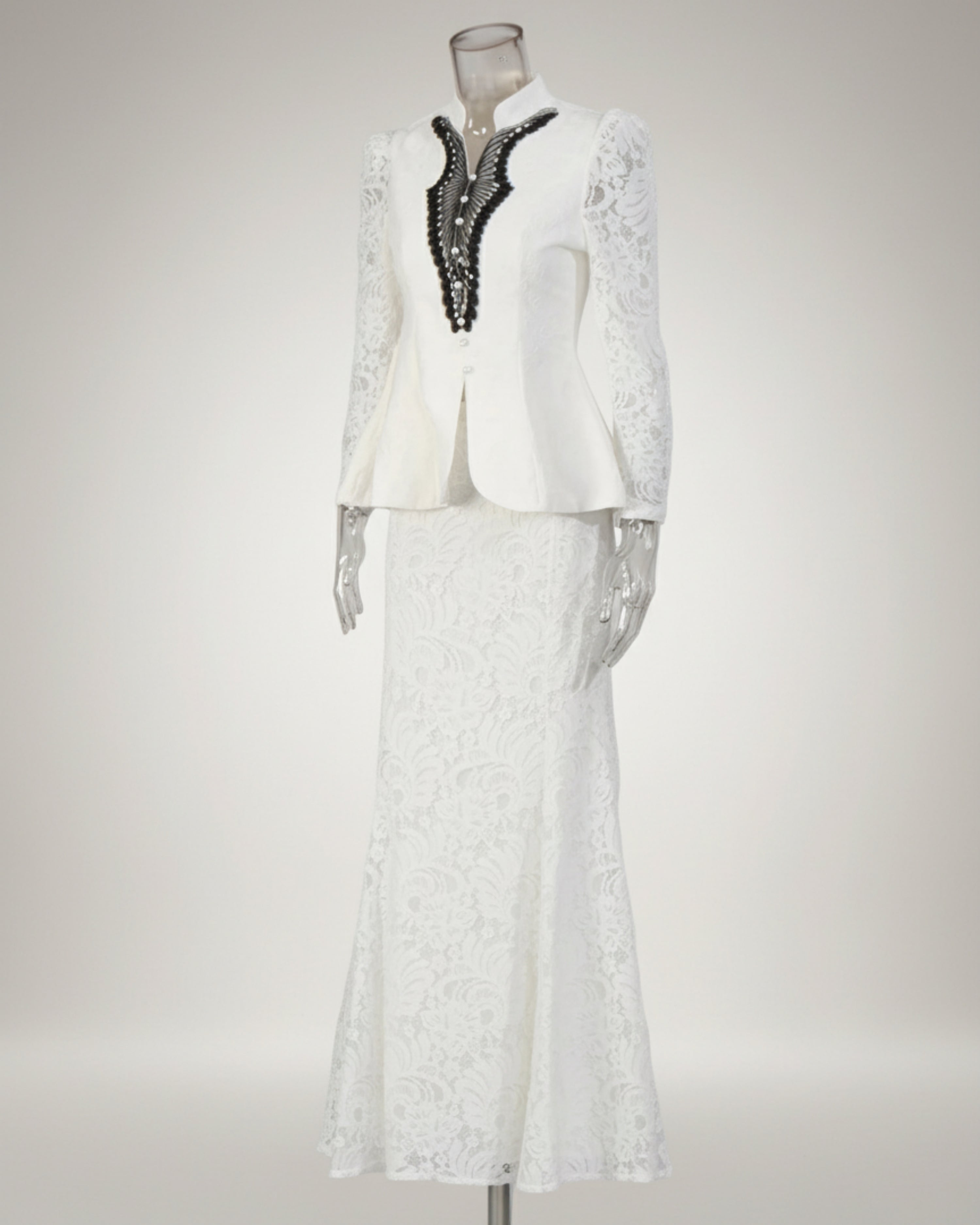 The long-sleeve embroidered peplum jacket glistens with delicate hand-beaded embellishments and pairs with a matching full-length lace skirt, creating a graceful, couture silhouette perfect for evening elegance, weddings, and formal occasions.