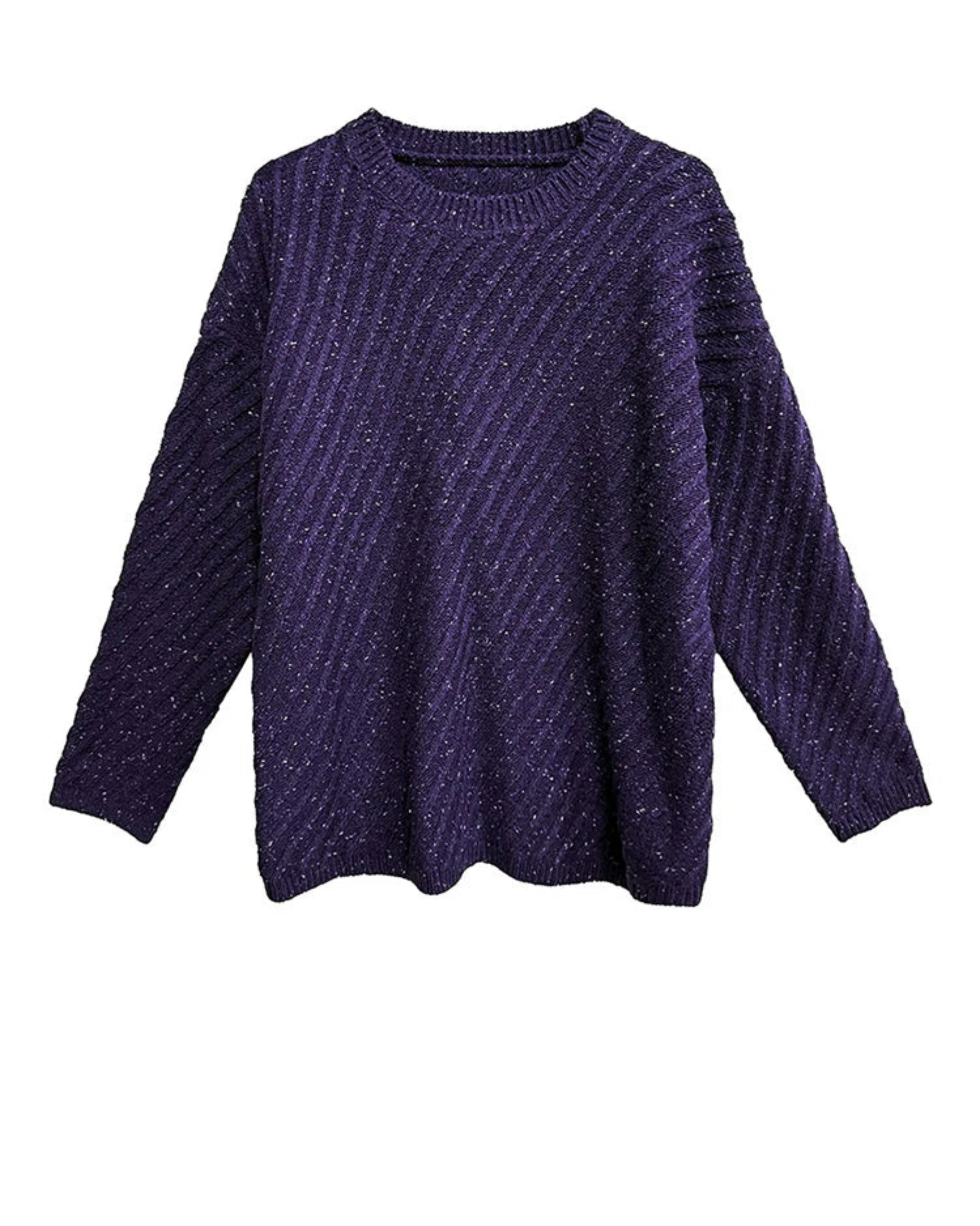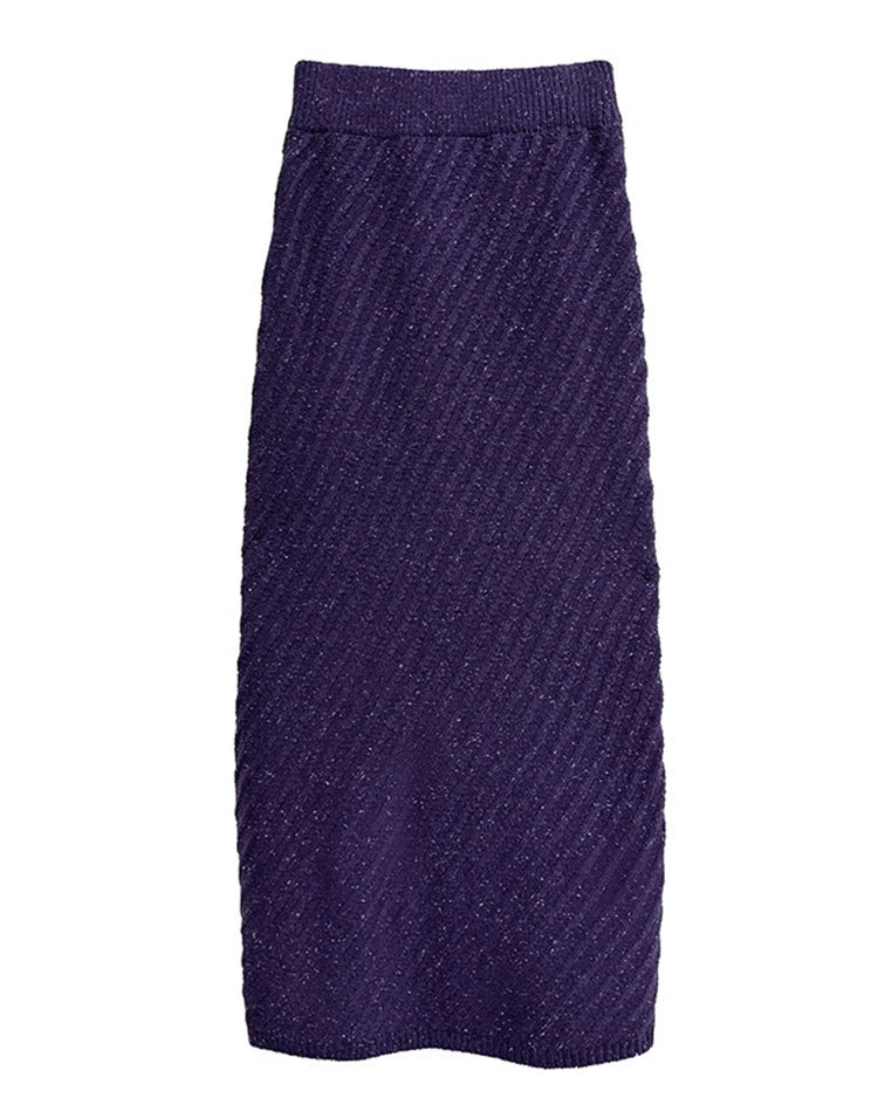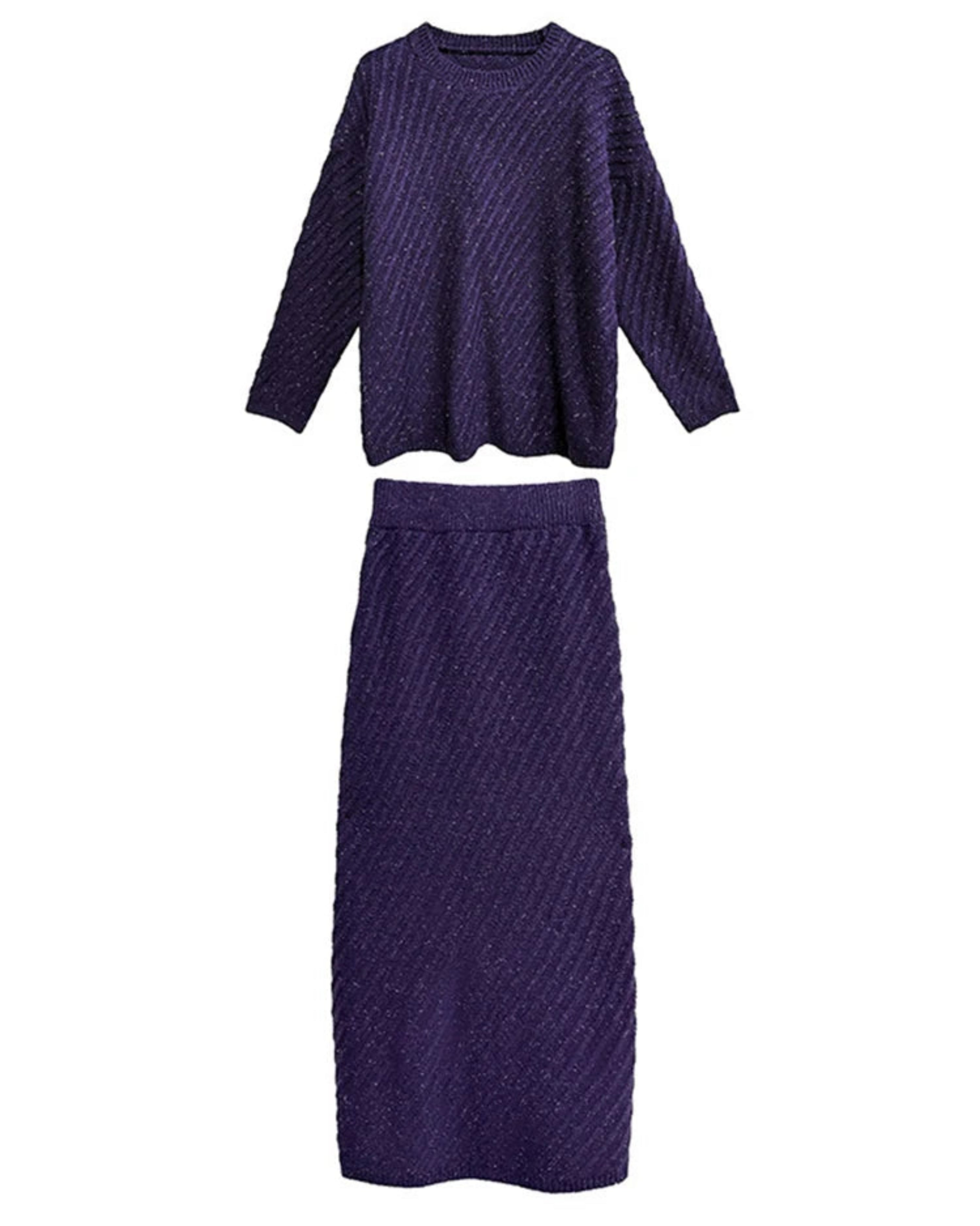 Diagonal ribbed knit adds texture. The sweater drapes loosely, while the skirt flows elegantly with a stretchy elastic waistband. Perfect worn together or separately for autumn, winter, office, or casual-formal occasions.