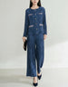 This luxurious two-piece set pairs a tailored plissé blazer with matching wide-leg pants featuring an elastic pull-on waistband.