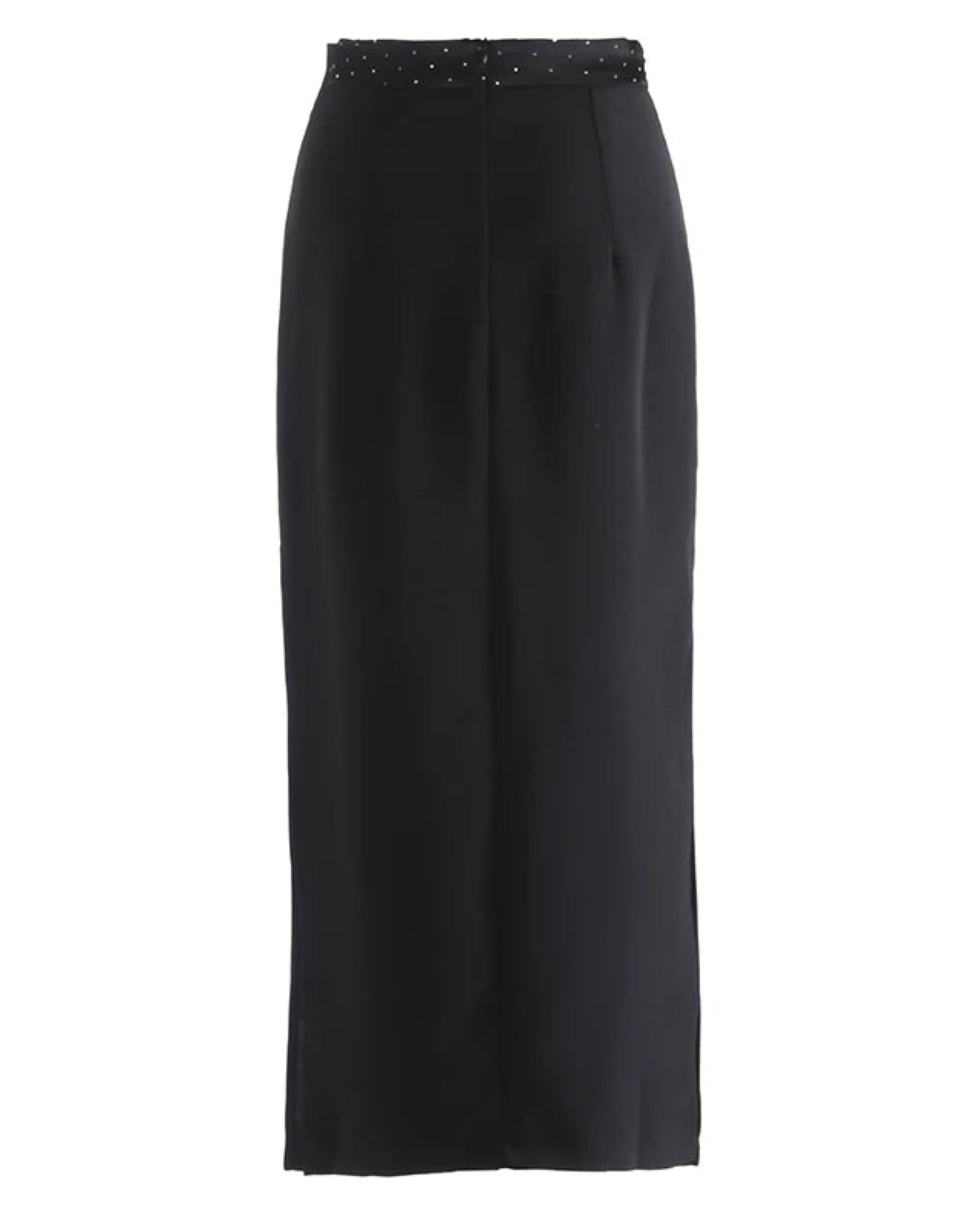 This luxurious maxi skirt features sleek satin fabric with a subtle dotted texture and a high-rise fit.