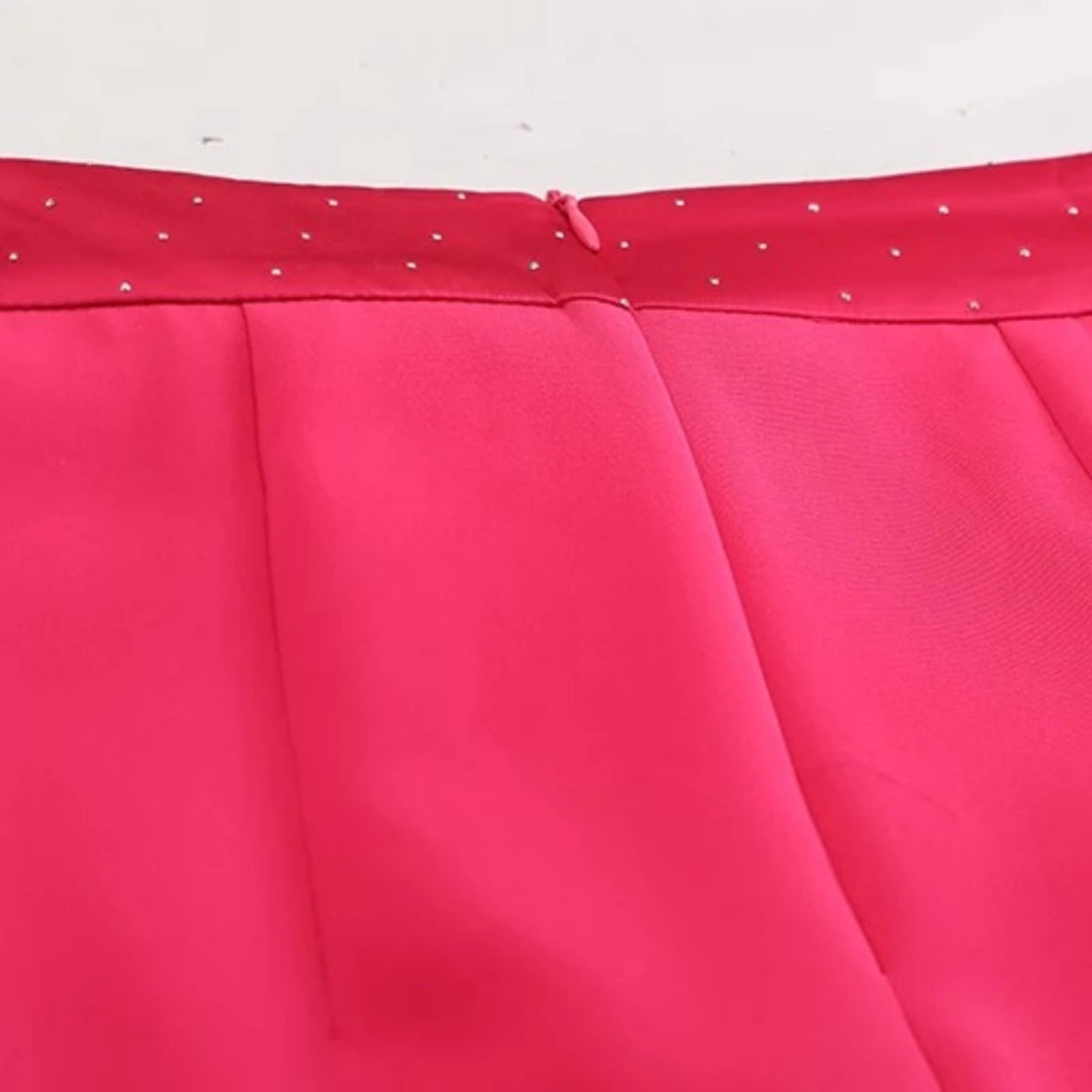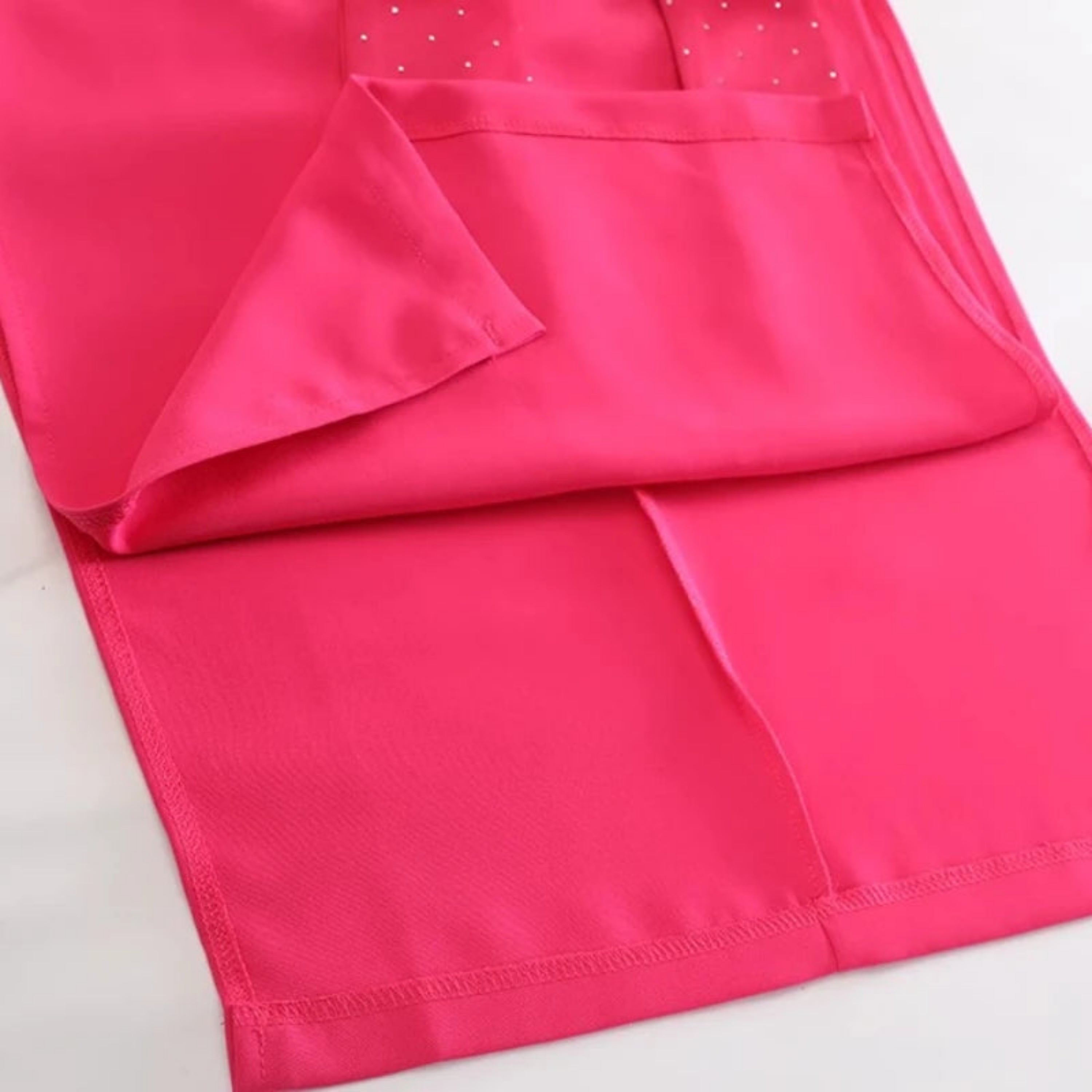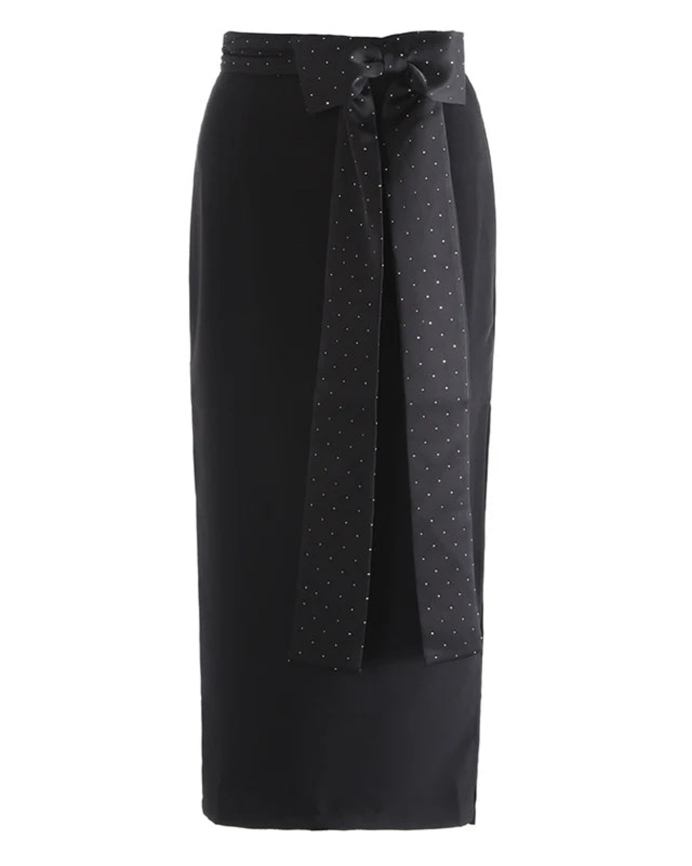 The integrated sash forms a dramatic bow at the waist, adorned with small sparkling gem-like embellishments for intricate detail, while a high side slit enhances elegance and fluid movement, perfect for formal events, travel, or elevated everyday styling.