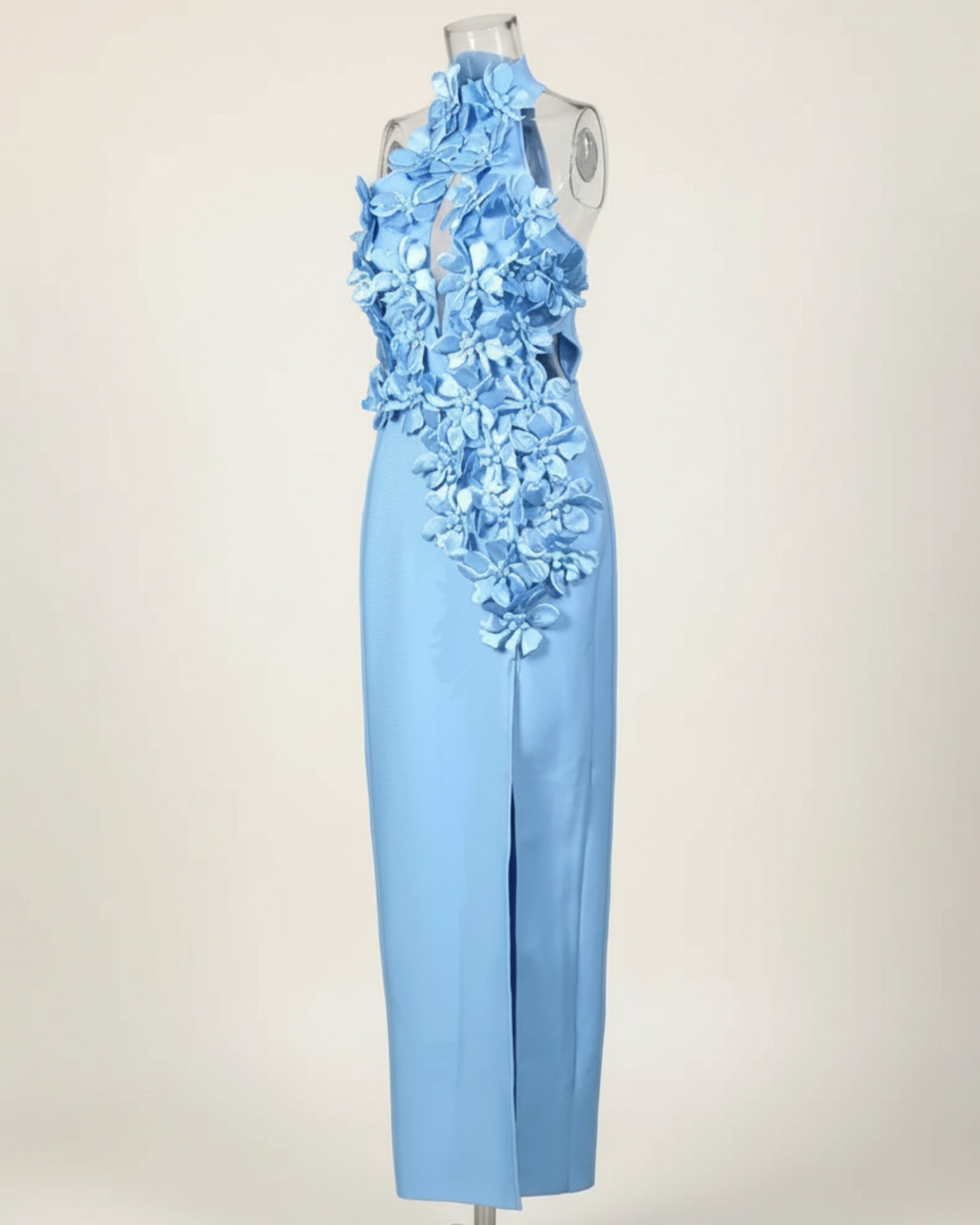 This exquisite halter midi dress showcases 3D floral appliqué cascading across the bodice and down one side of the sleek silhouette.