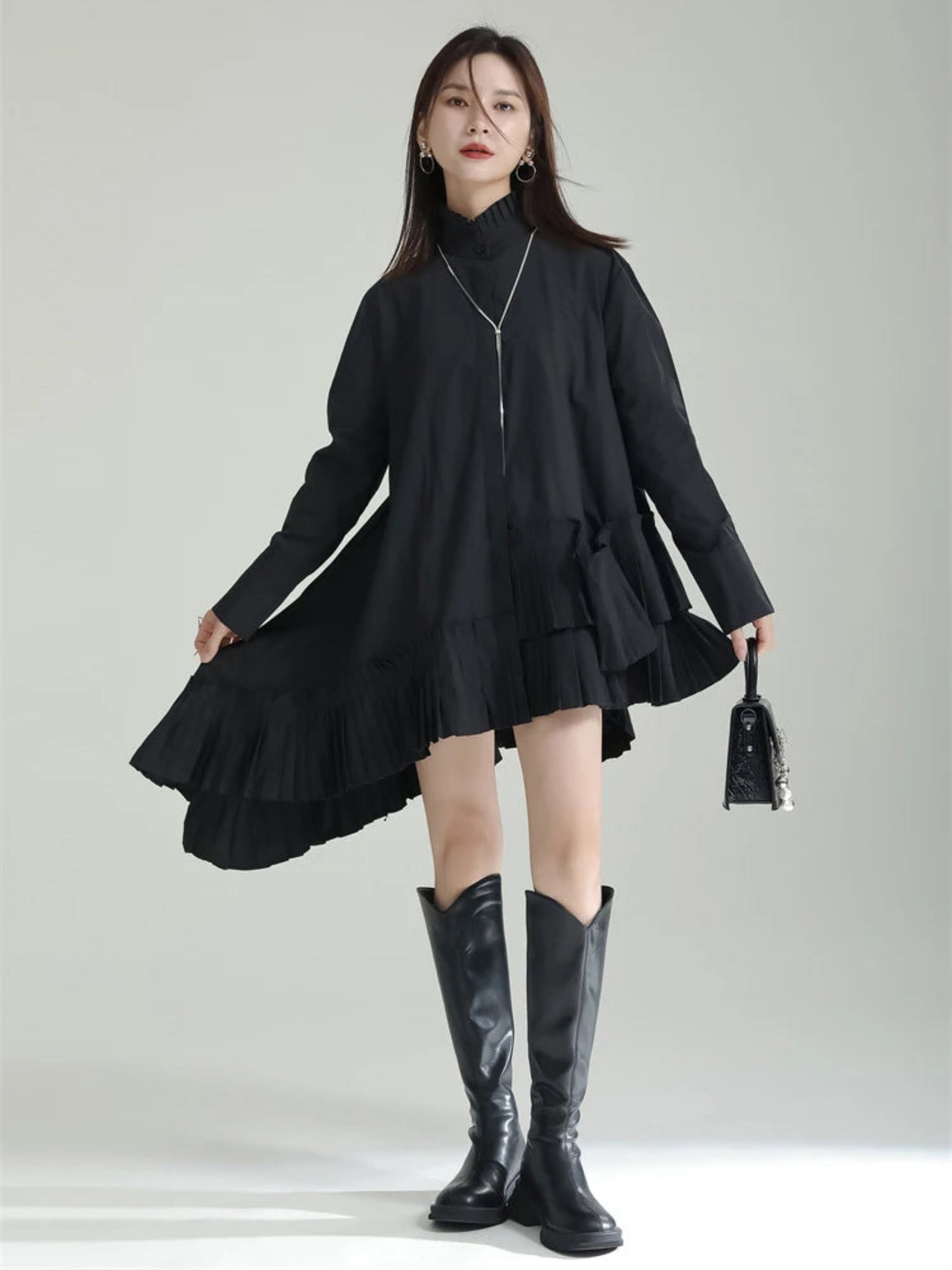A contemporary blouse dress with an asymmetric tiered ruffle hem and elegant high-low drape.
