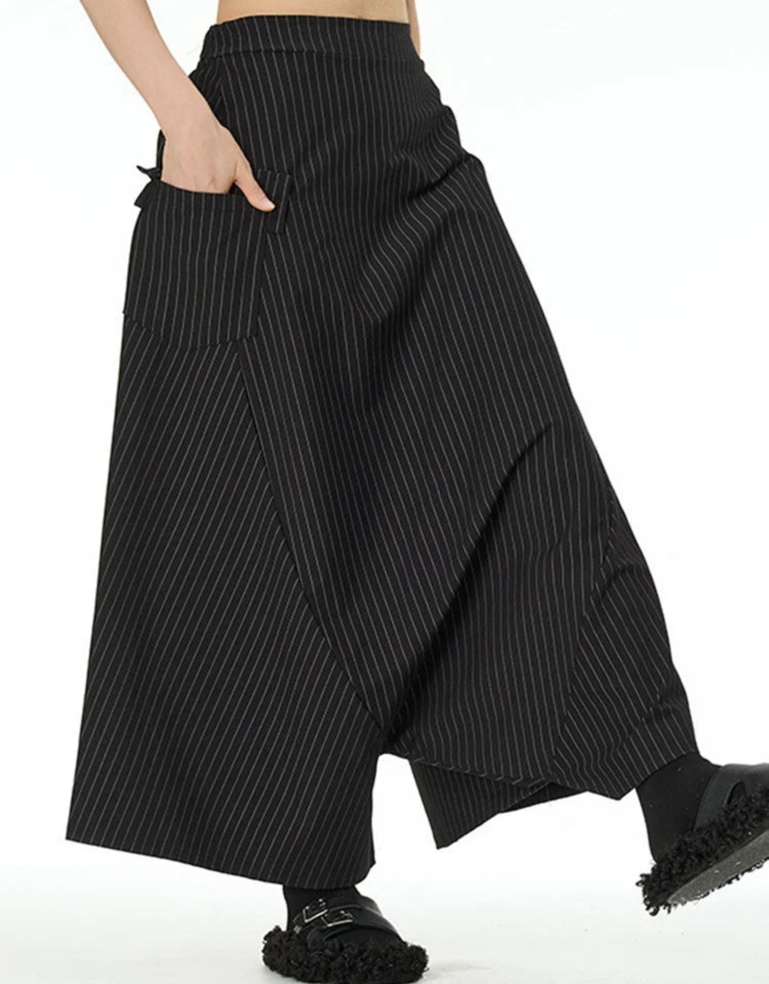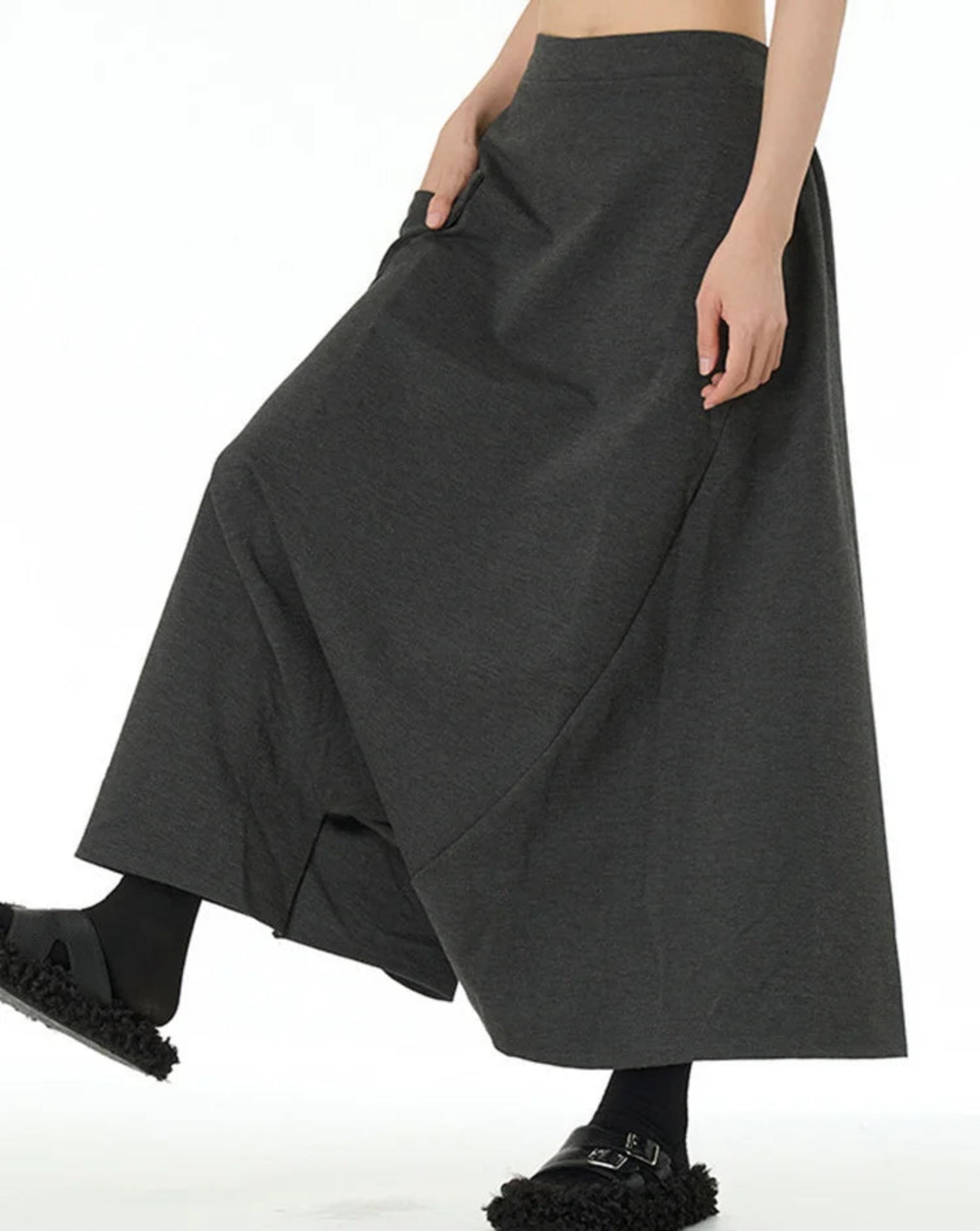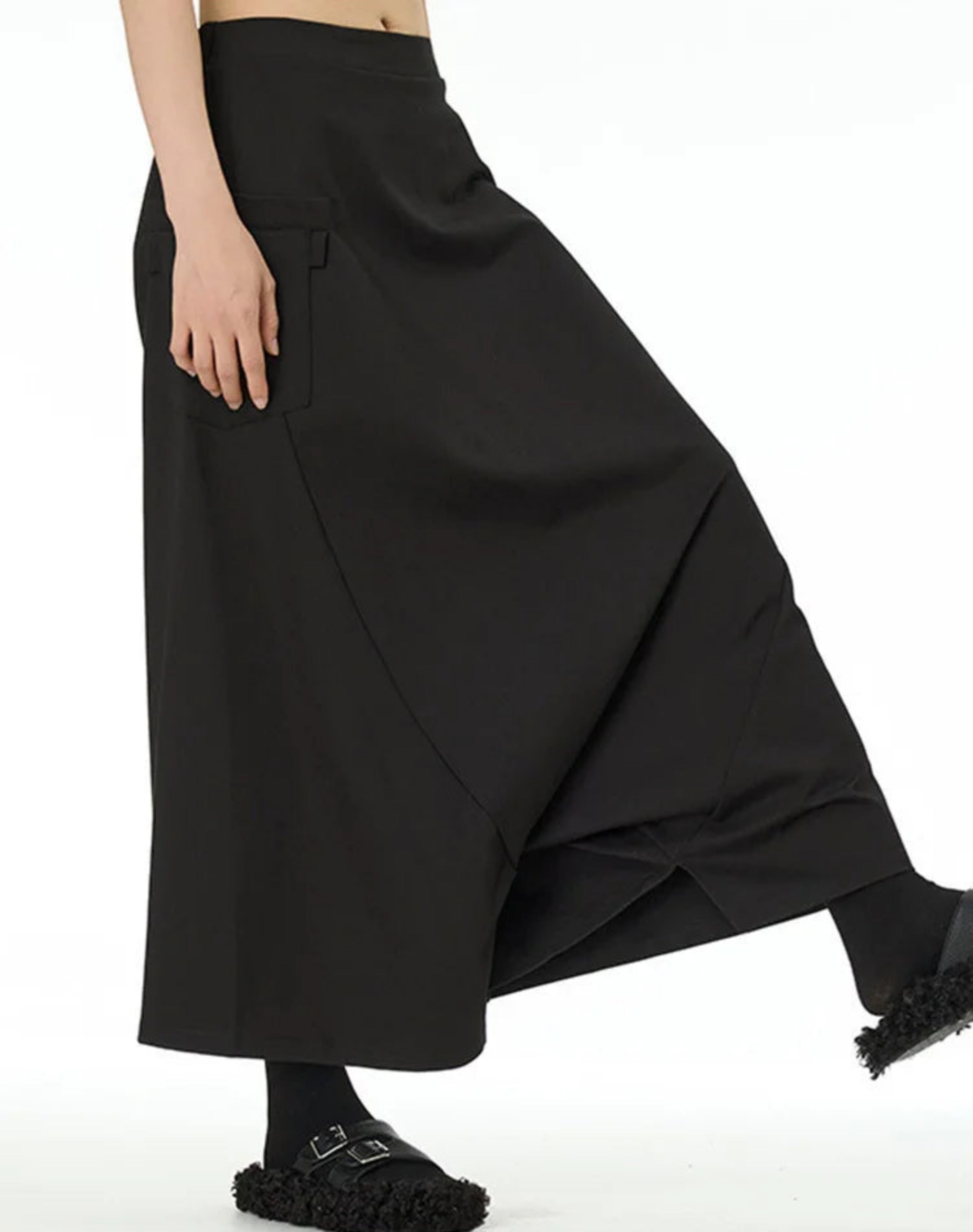 Asymmetrical paneling and large side pockets add structure and functionality. The cut combines comfort and bold avant-garde style, perfect for daily wear, formal settings, or travel.