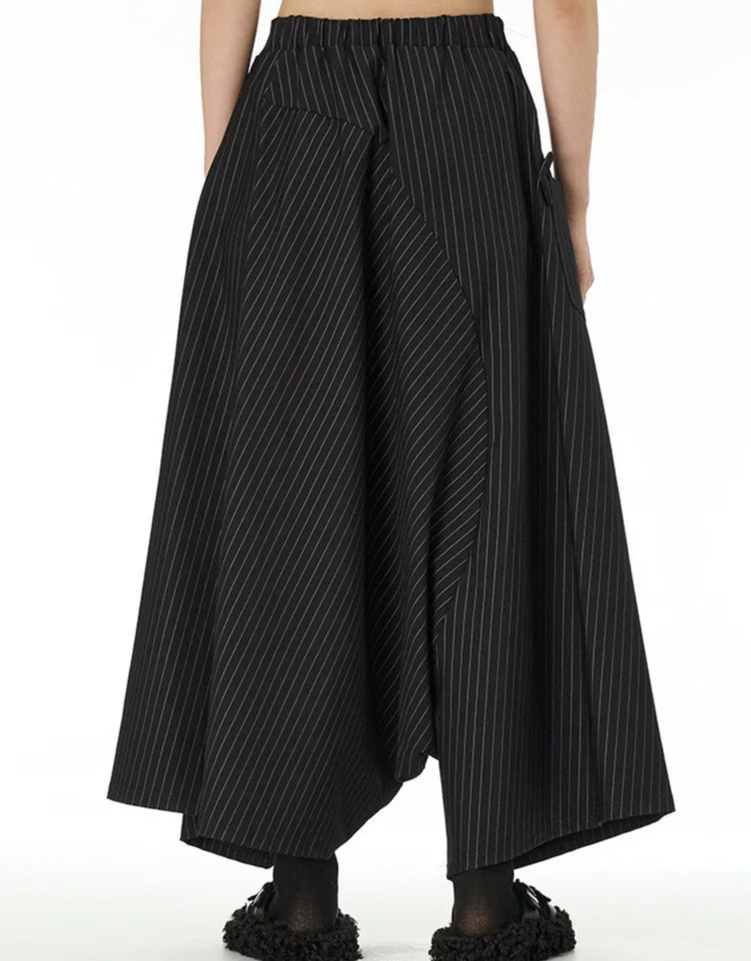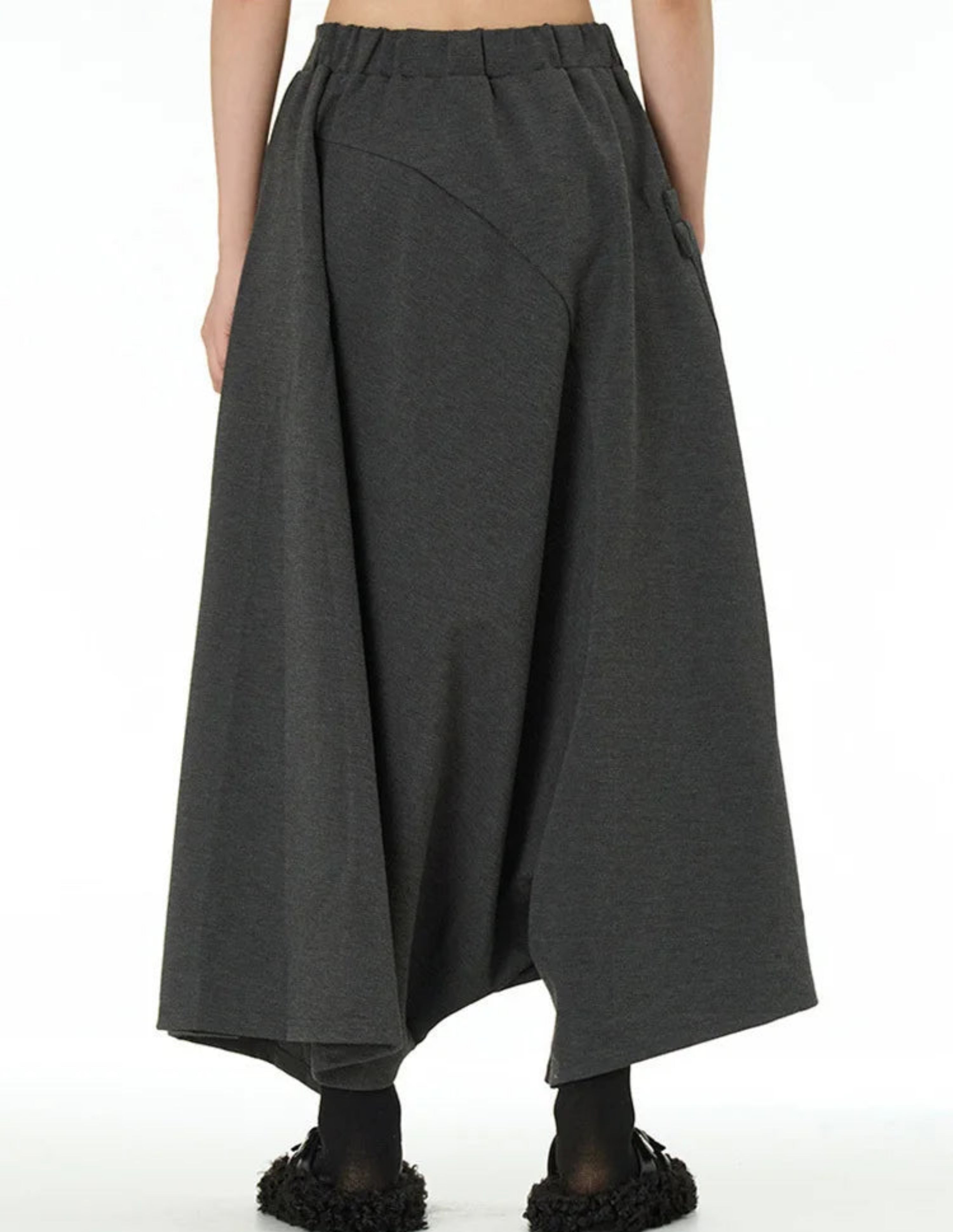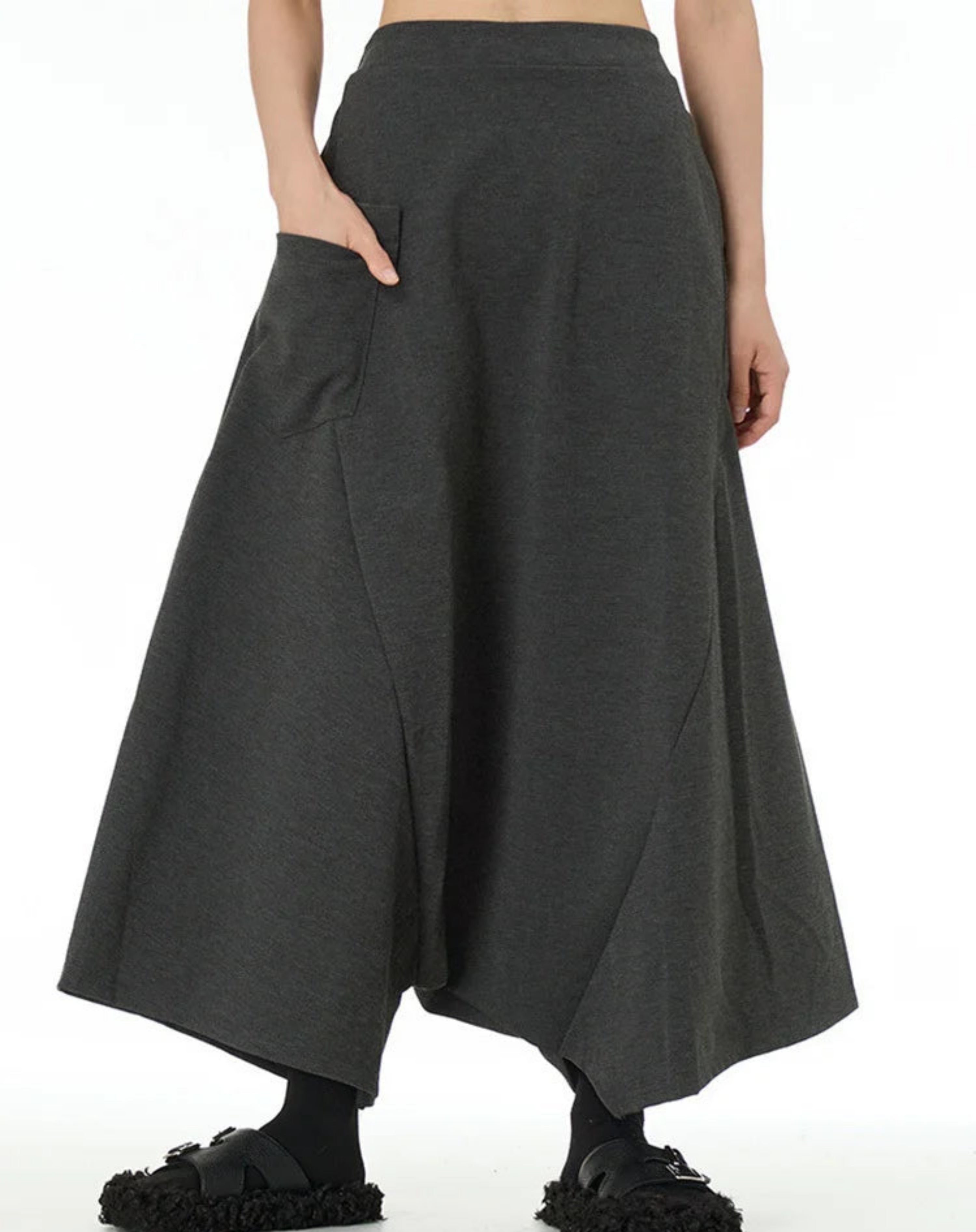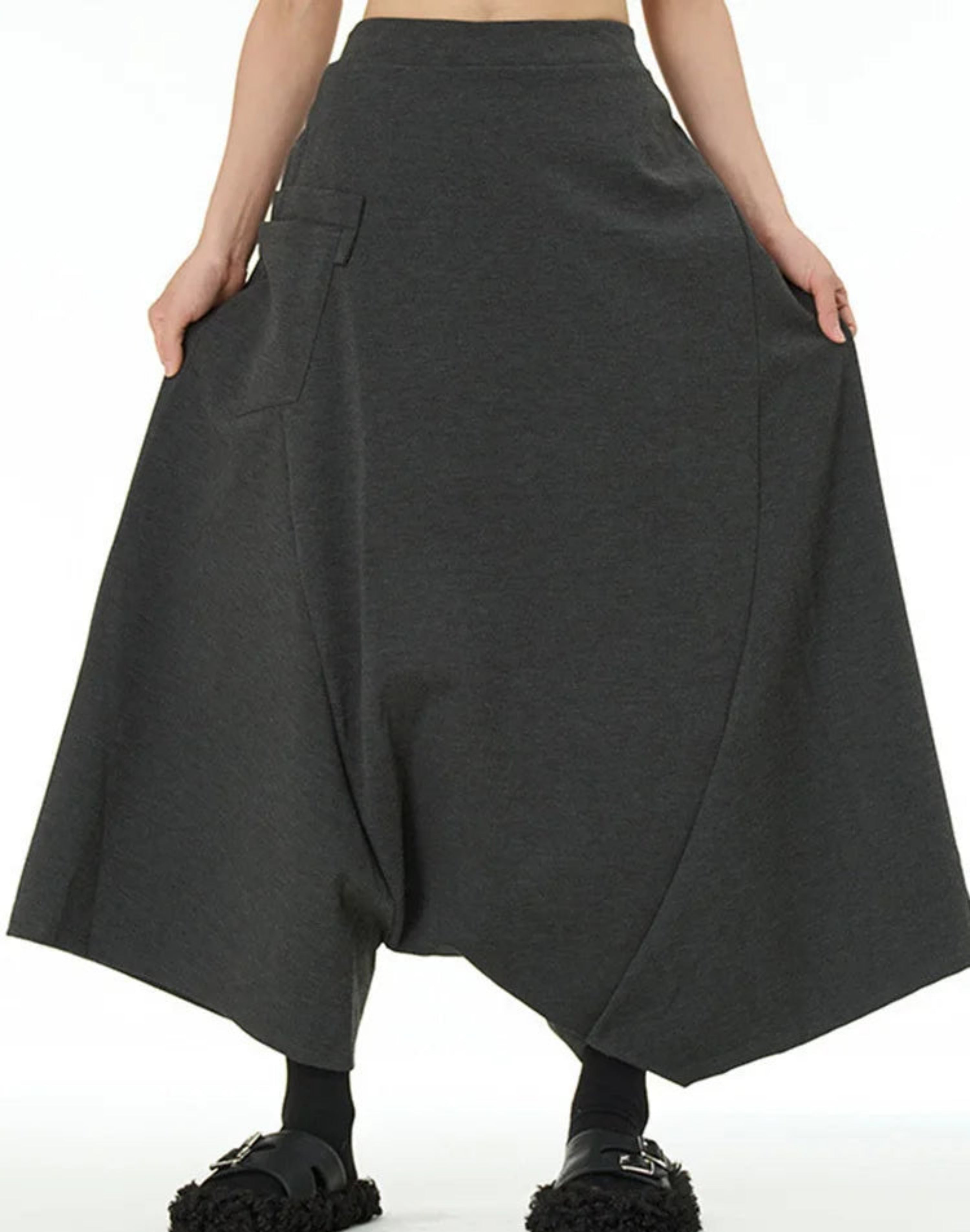 These loose, wide-leg trousers feature a distinctive drop-crotch design for a voluminous, flowing silhouette.