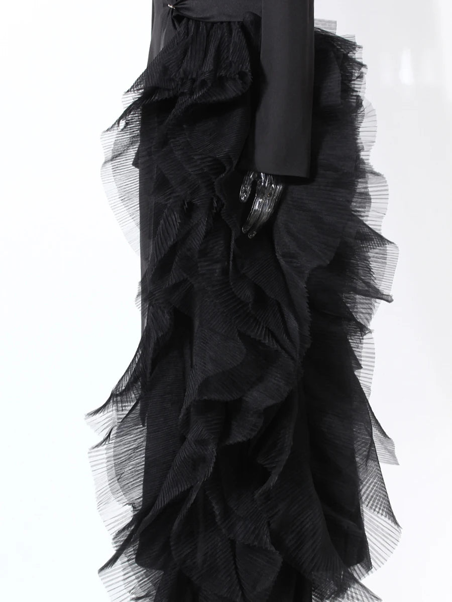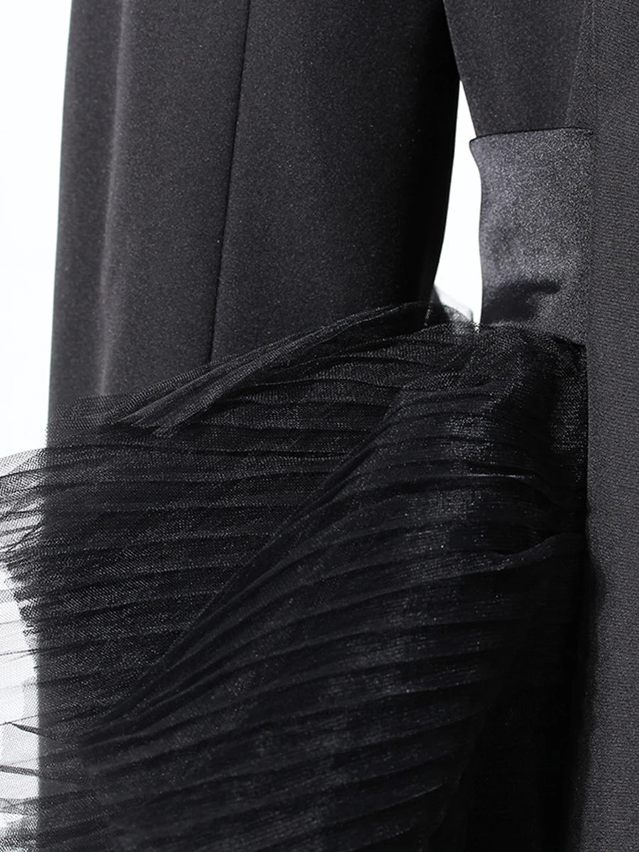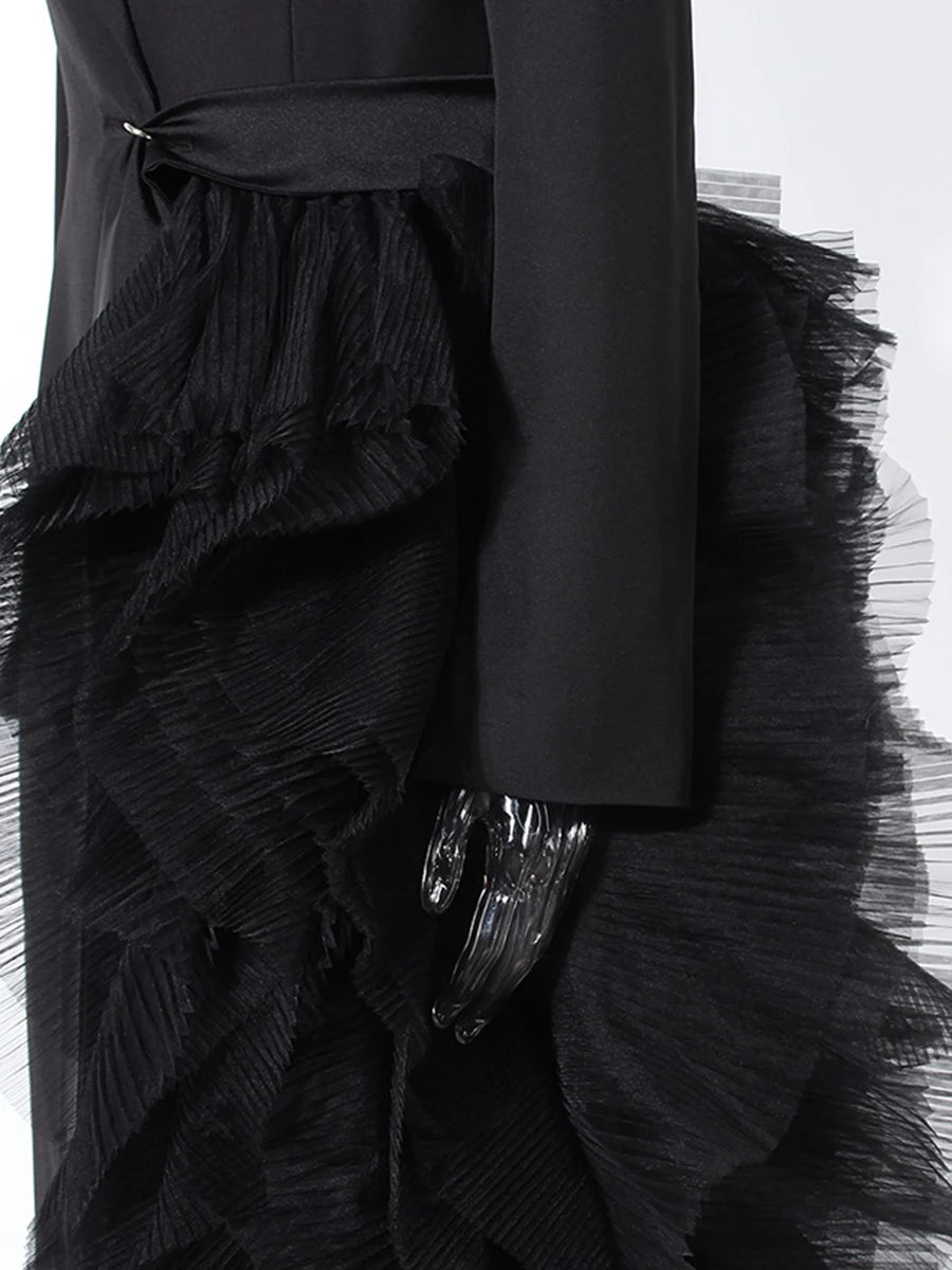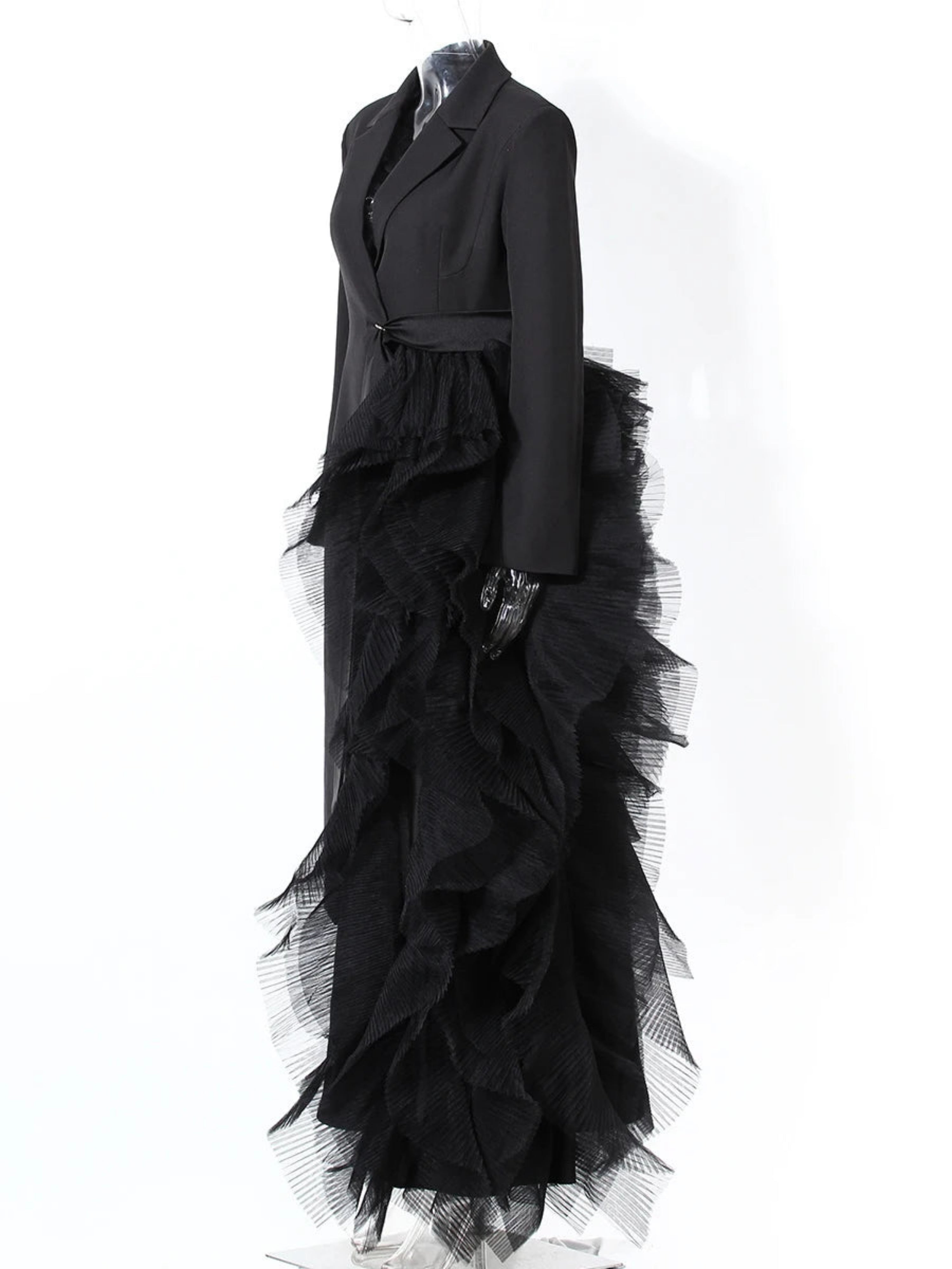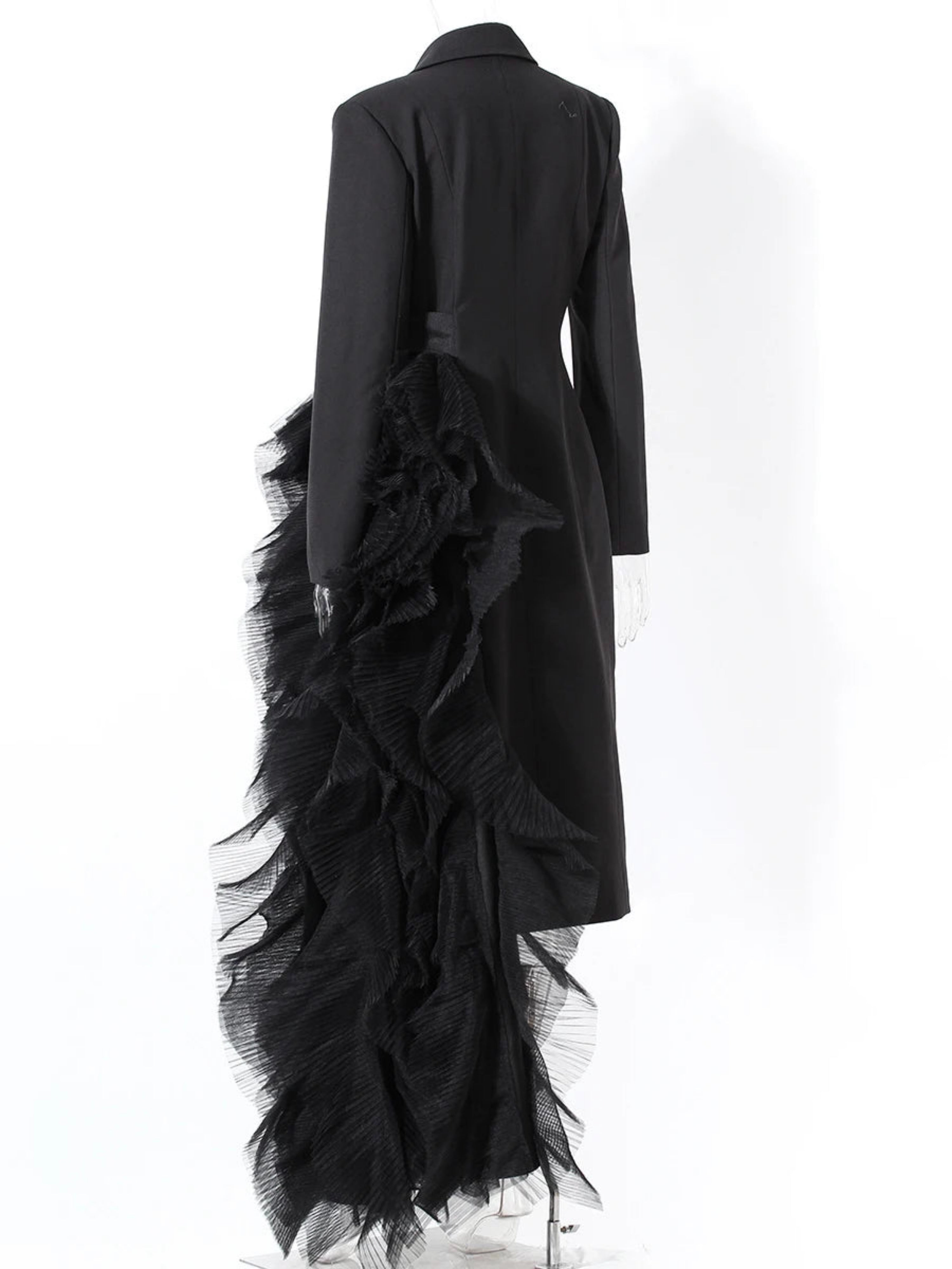This avant-garde mesh blazer coat features an extra-long silhouette with a luxurious cascade of ruched mesh, creating a dramatic and asymmetrical profile.