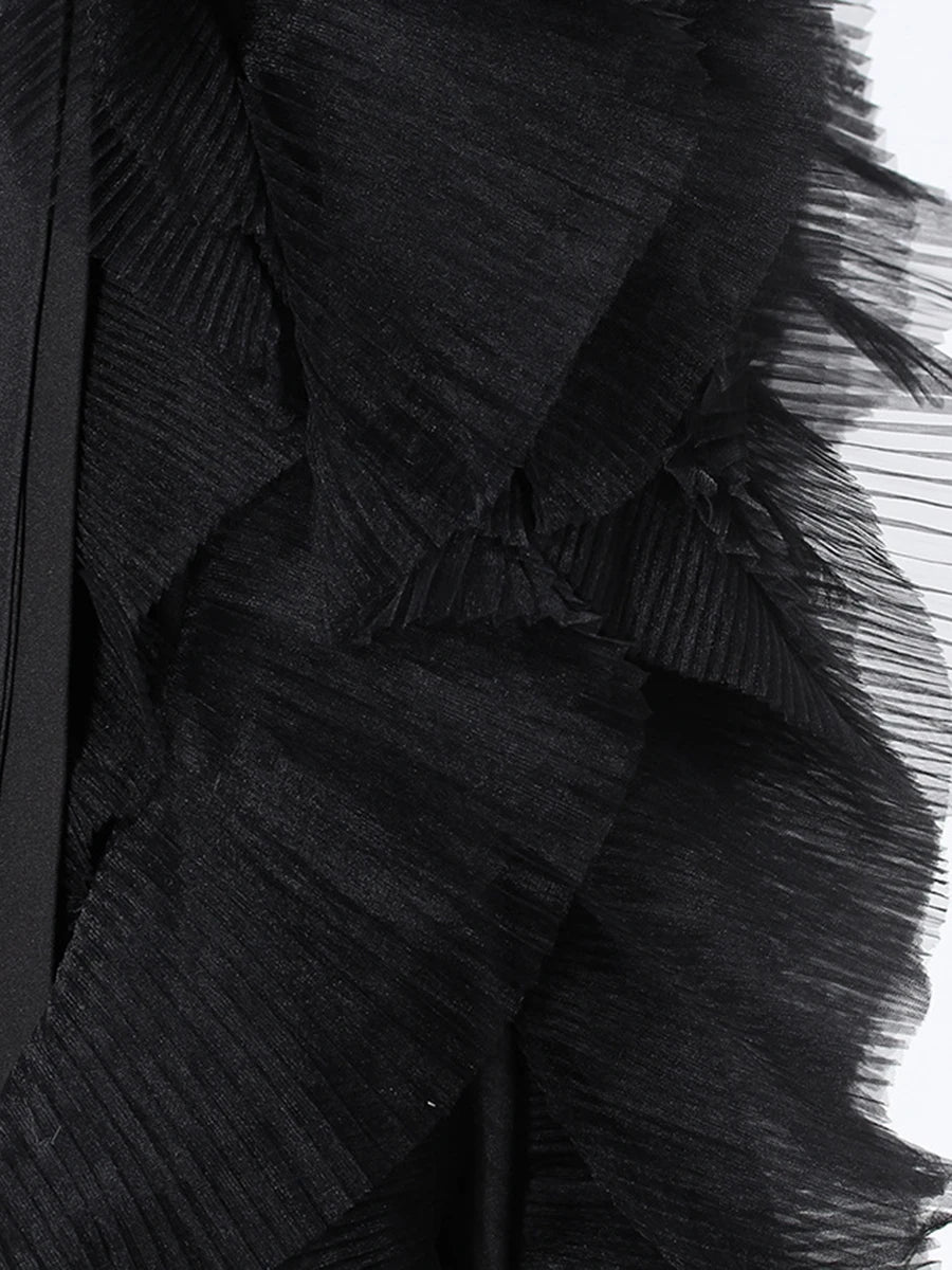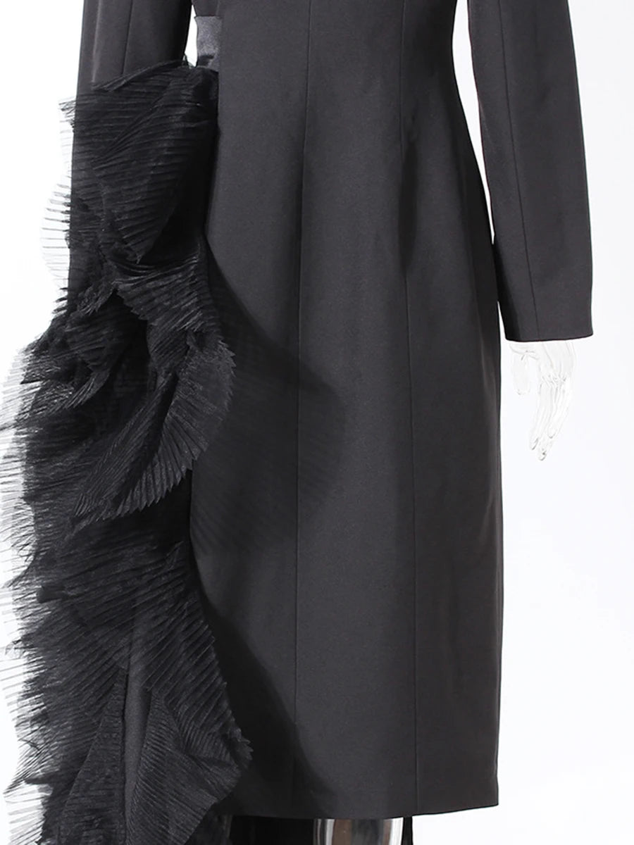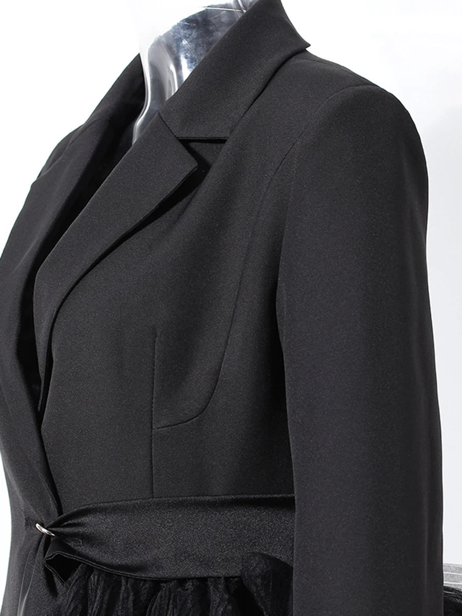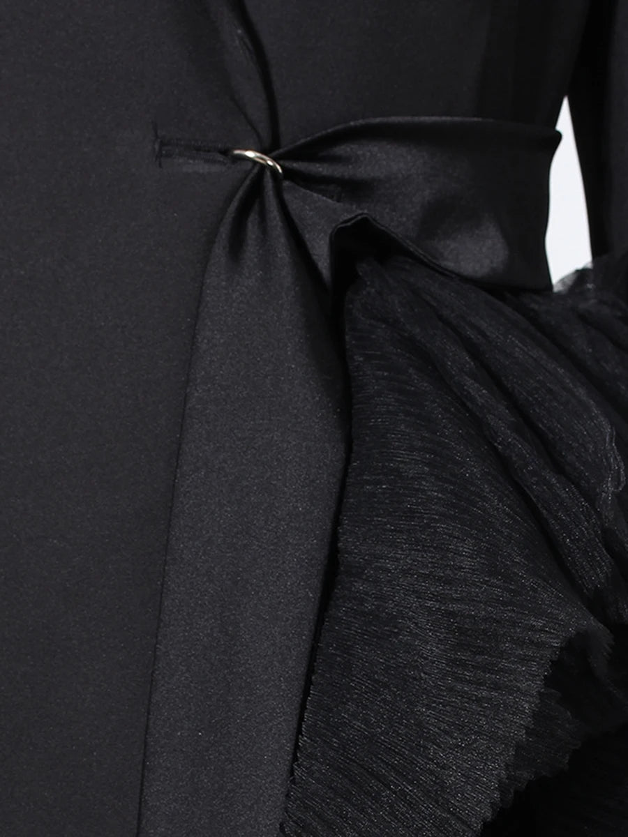 This avant-garde mesh blazer coat features an extra-long silhouette with a luxurious cascade of ruched mesh, creating a dramatic and asymmetrical profile.