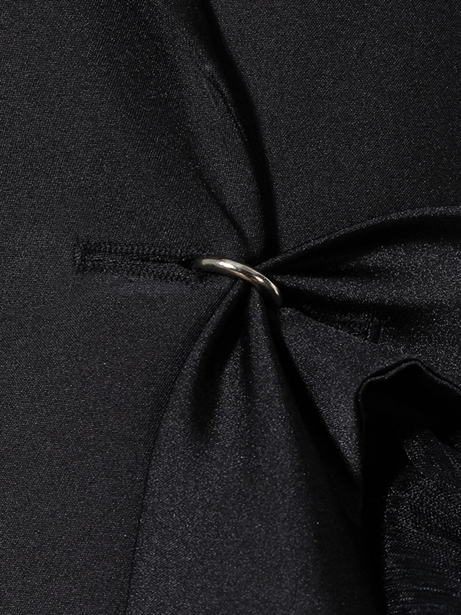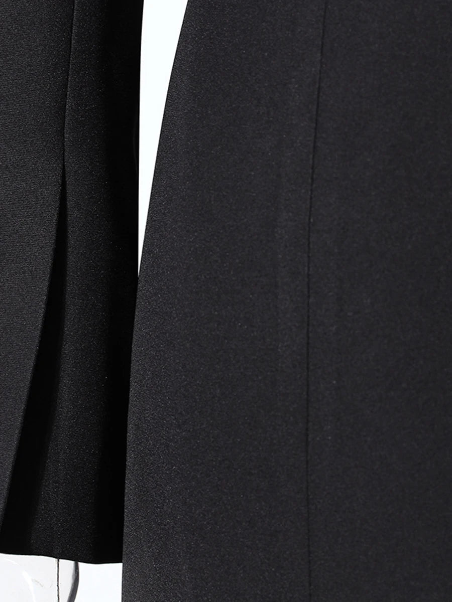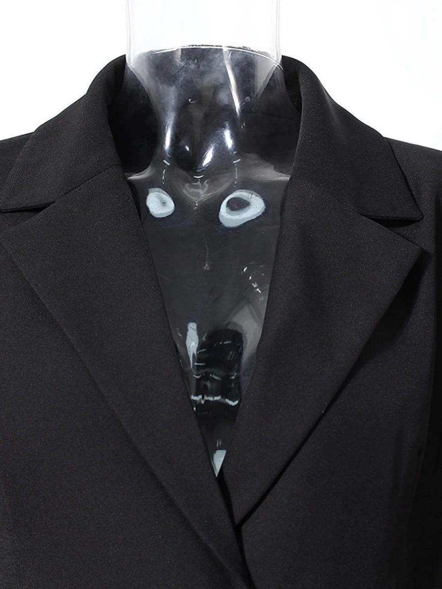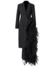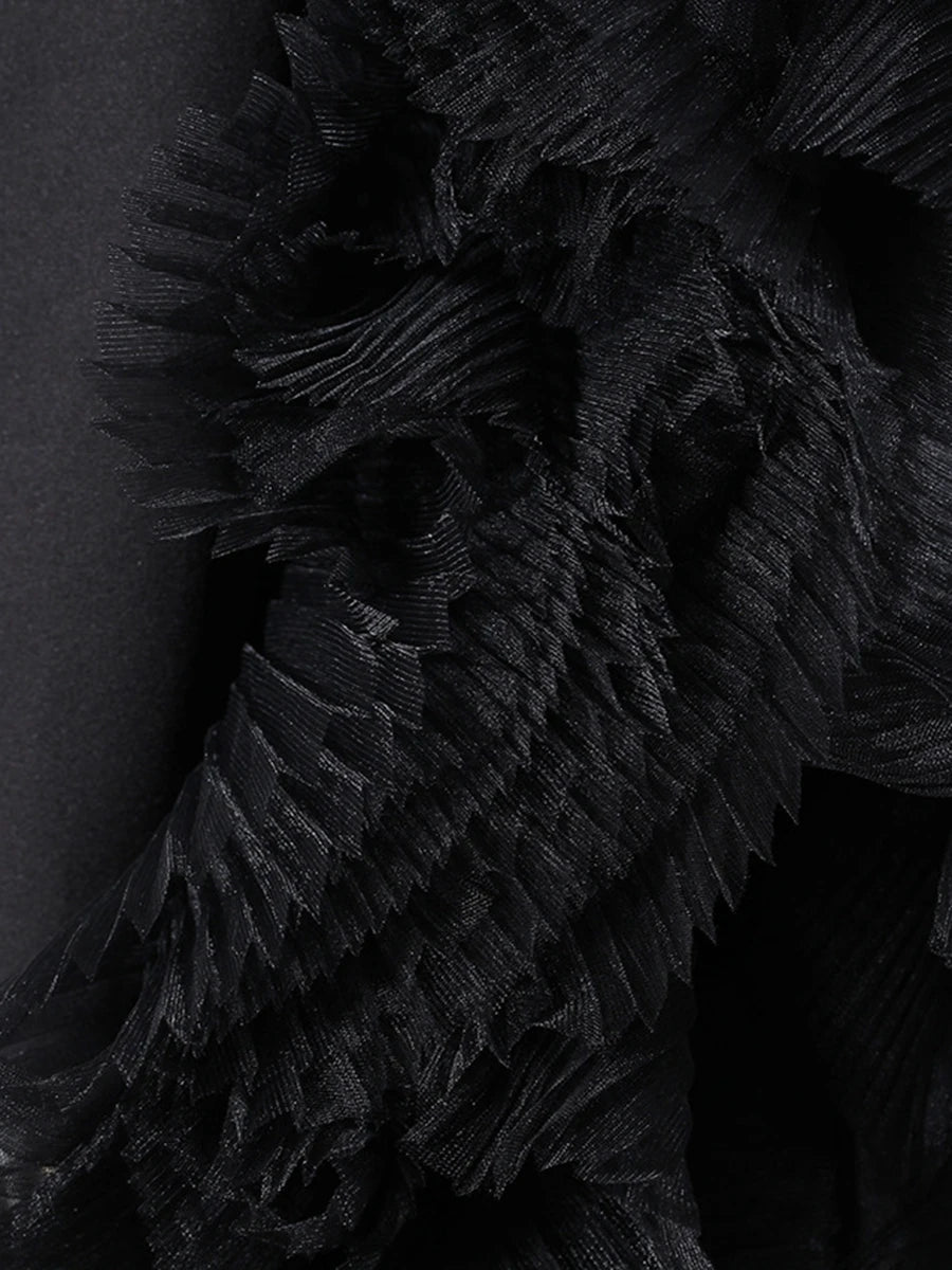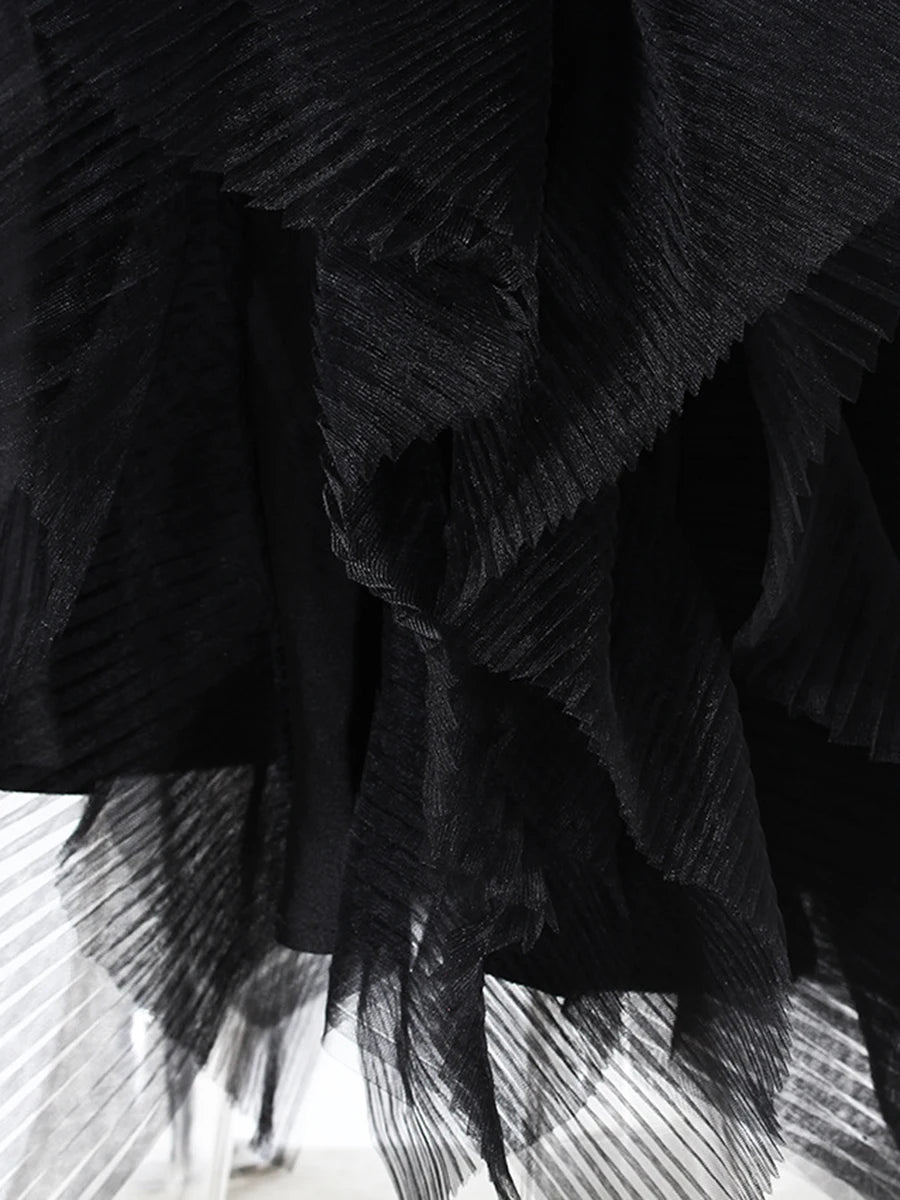 This avant-garde mesh blazer coat features an extra-long silhouette with a luxurious cascade of ruched mesh, creating a dramatic and asymmetrical profile.