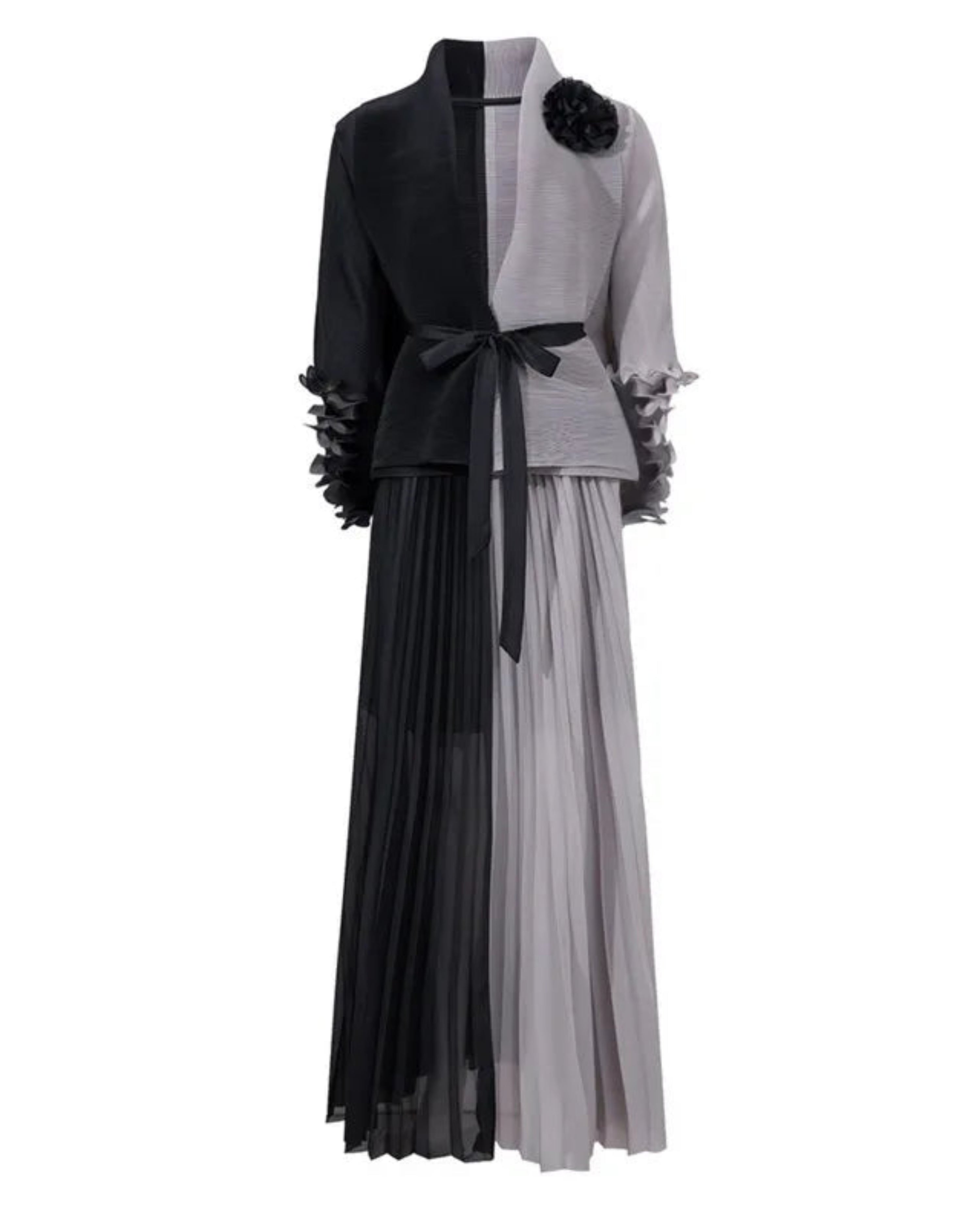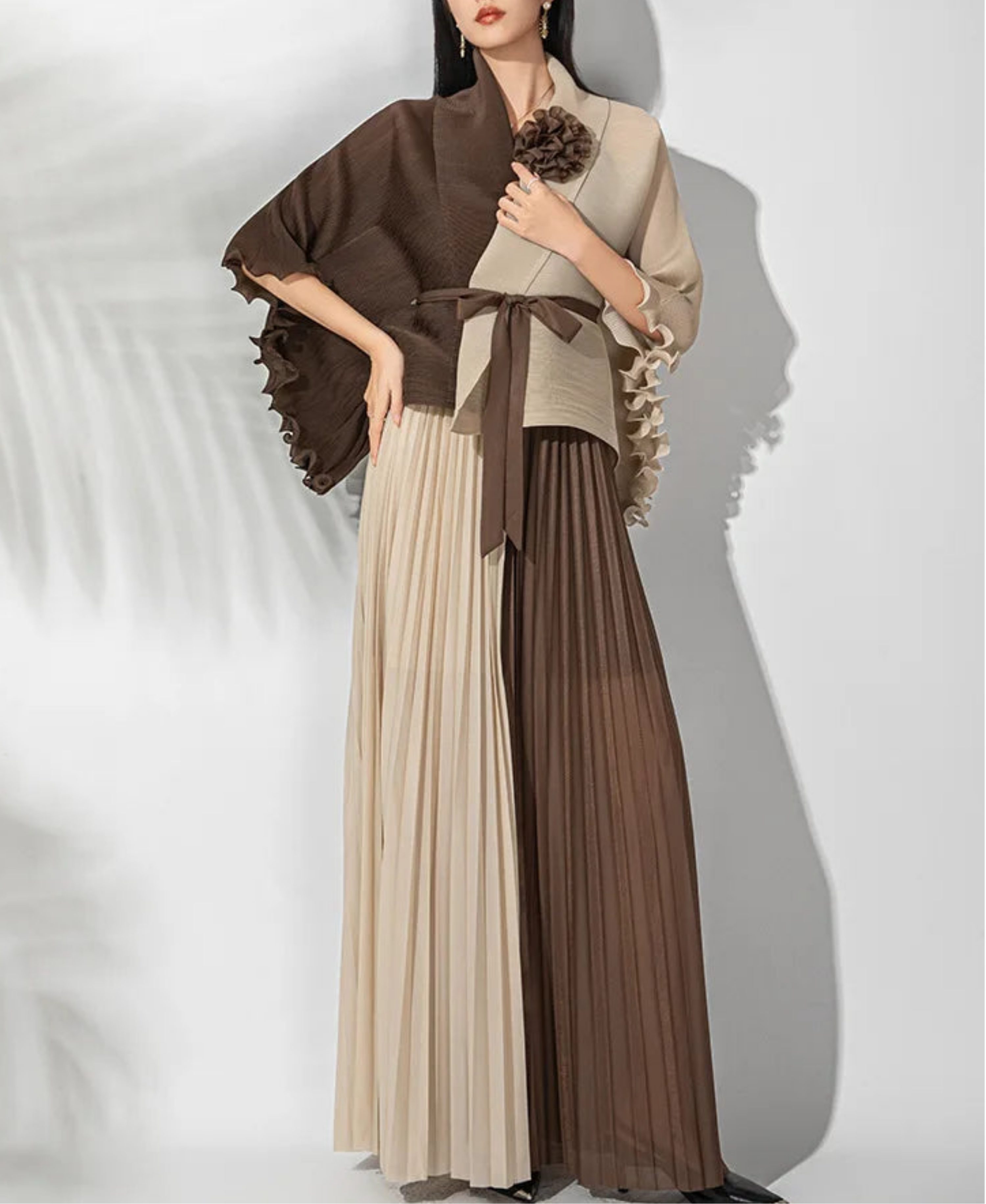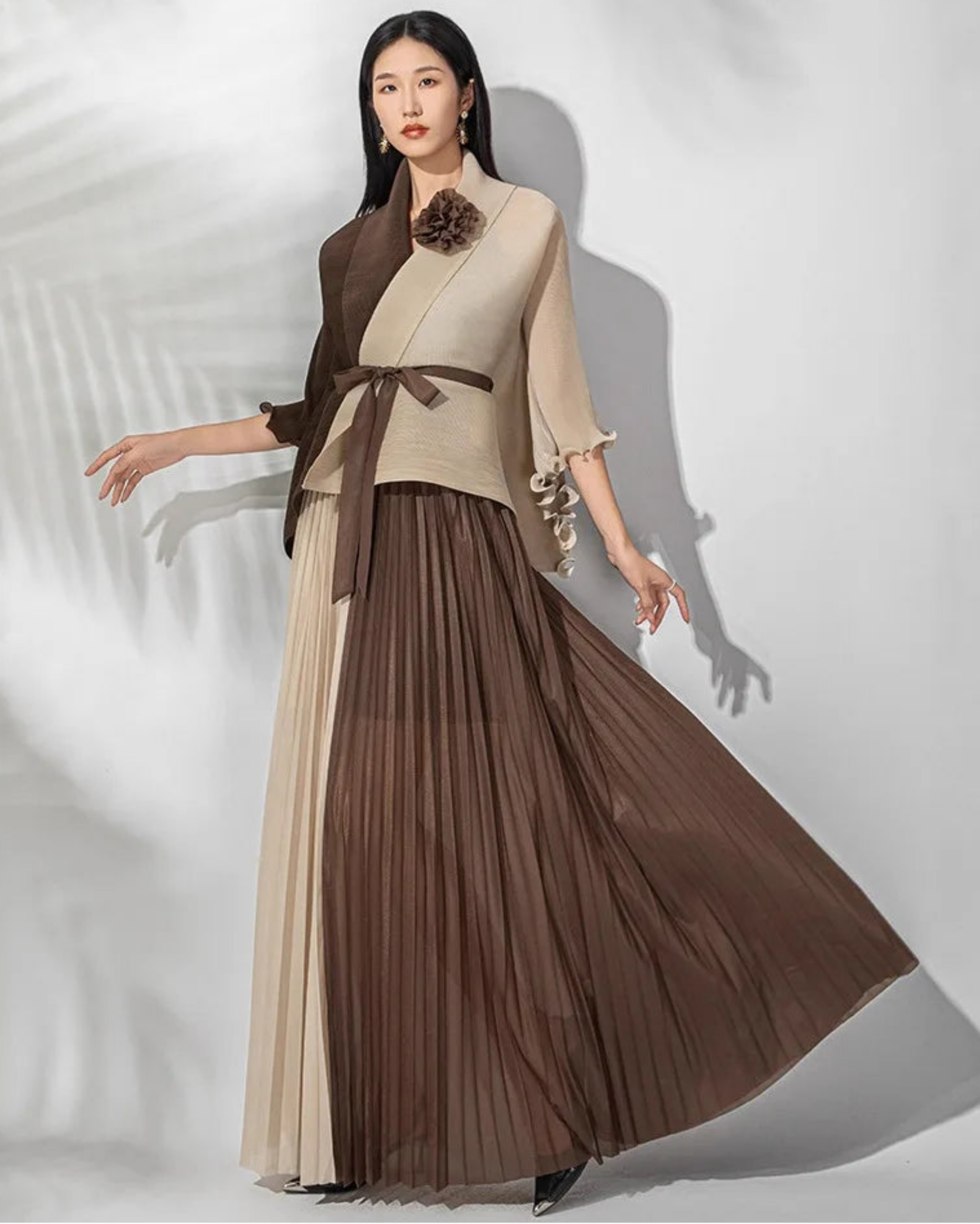 Designer Formal Japanese Micro-Pleated Two Piece Skirt And Top Set