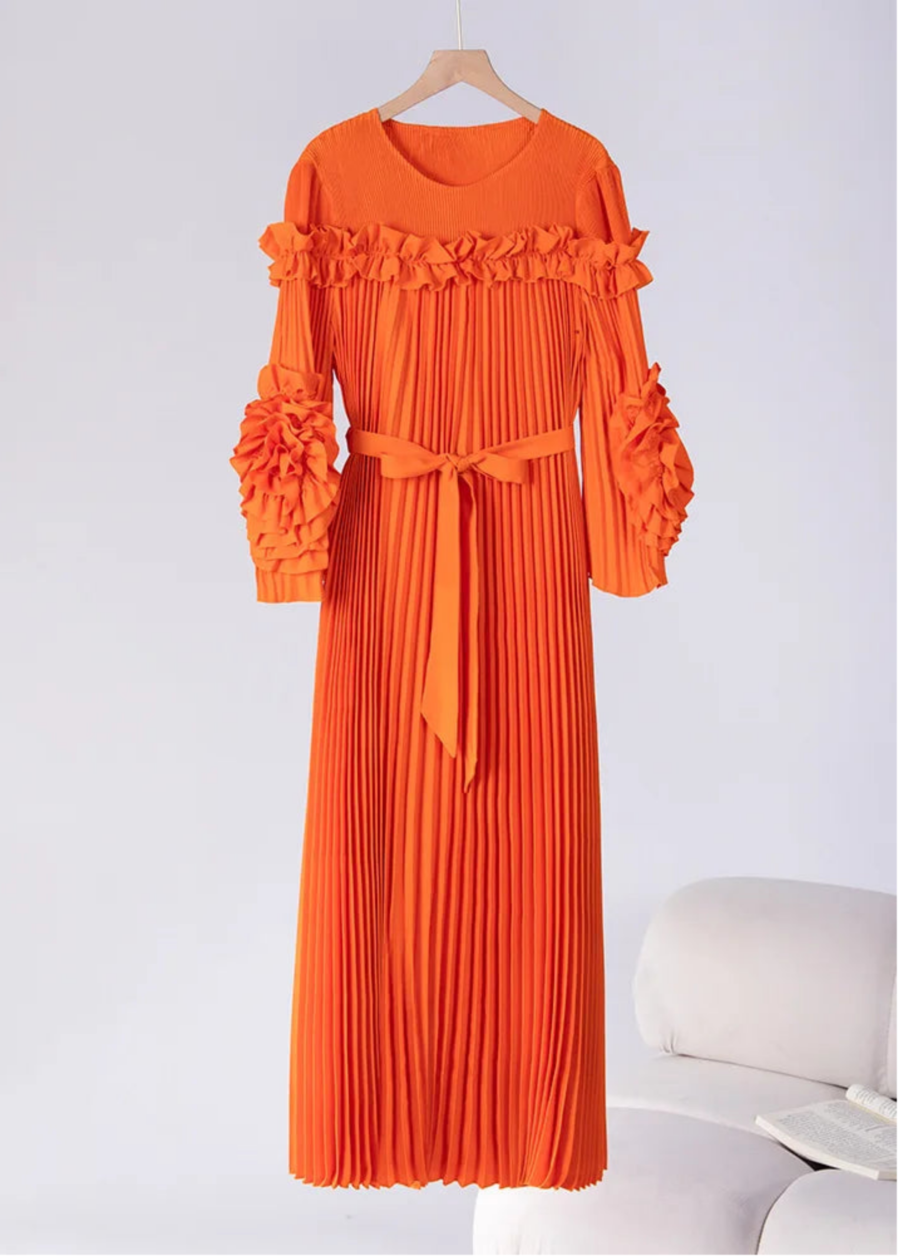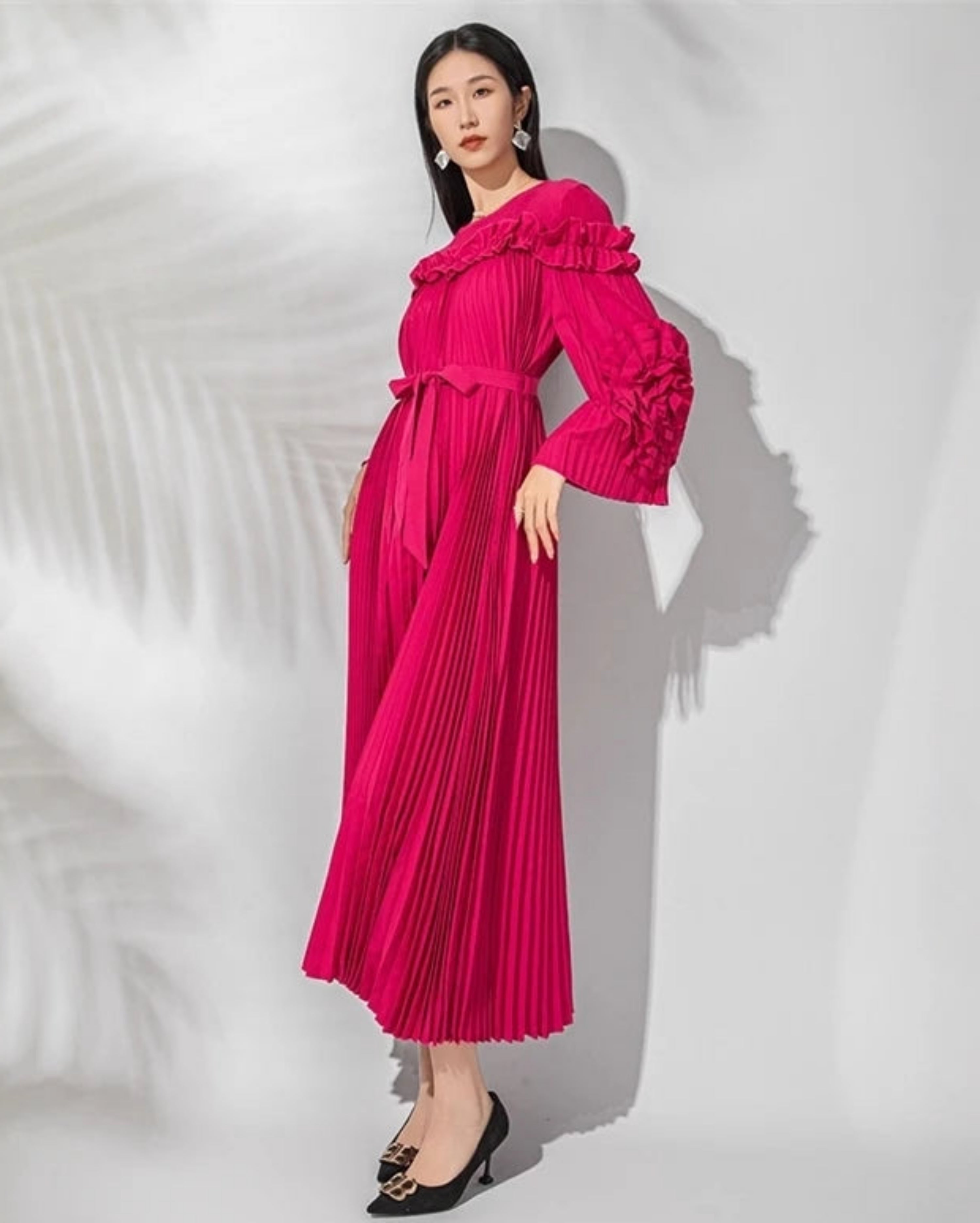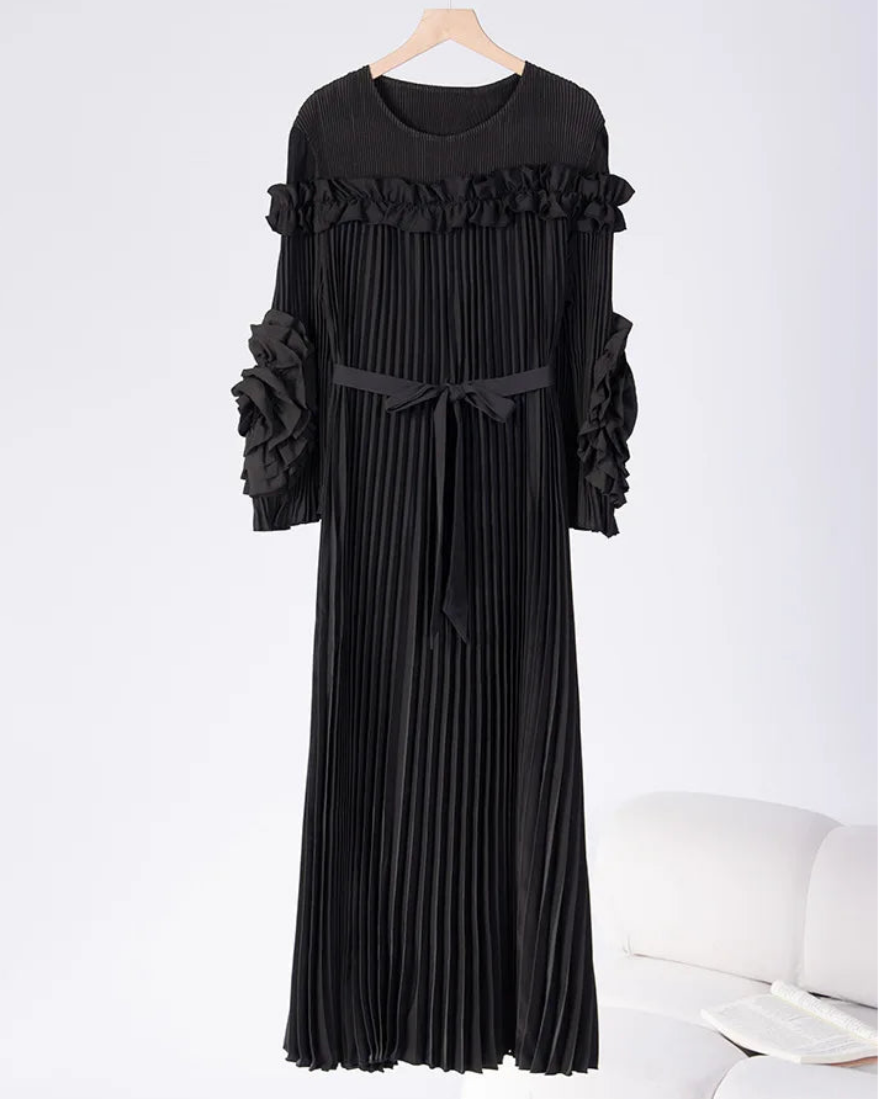 Vertical micro-pleats create elegant movement, while ruffles at the neckline and cuffs add a structured, feminine silhouette. The stretchy luxe fabric is wrinkle-resistant and requires no ironing, combining comfort with polished style.