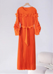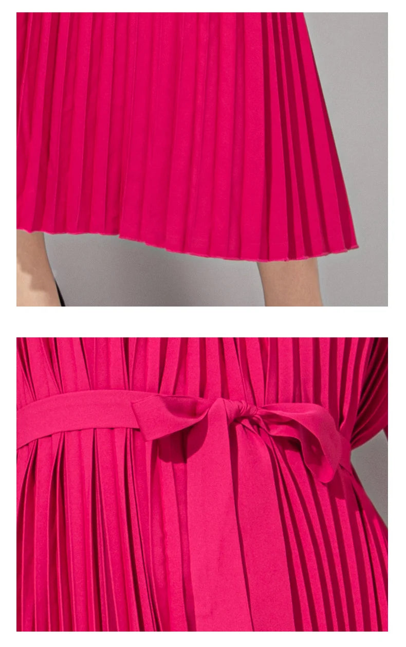 This luxurious premium Japanese plissé midi dress features a crew neck and three-quarter sleeves.