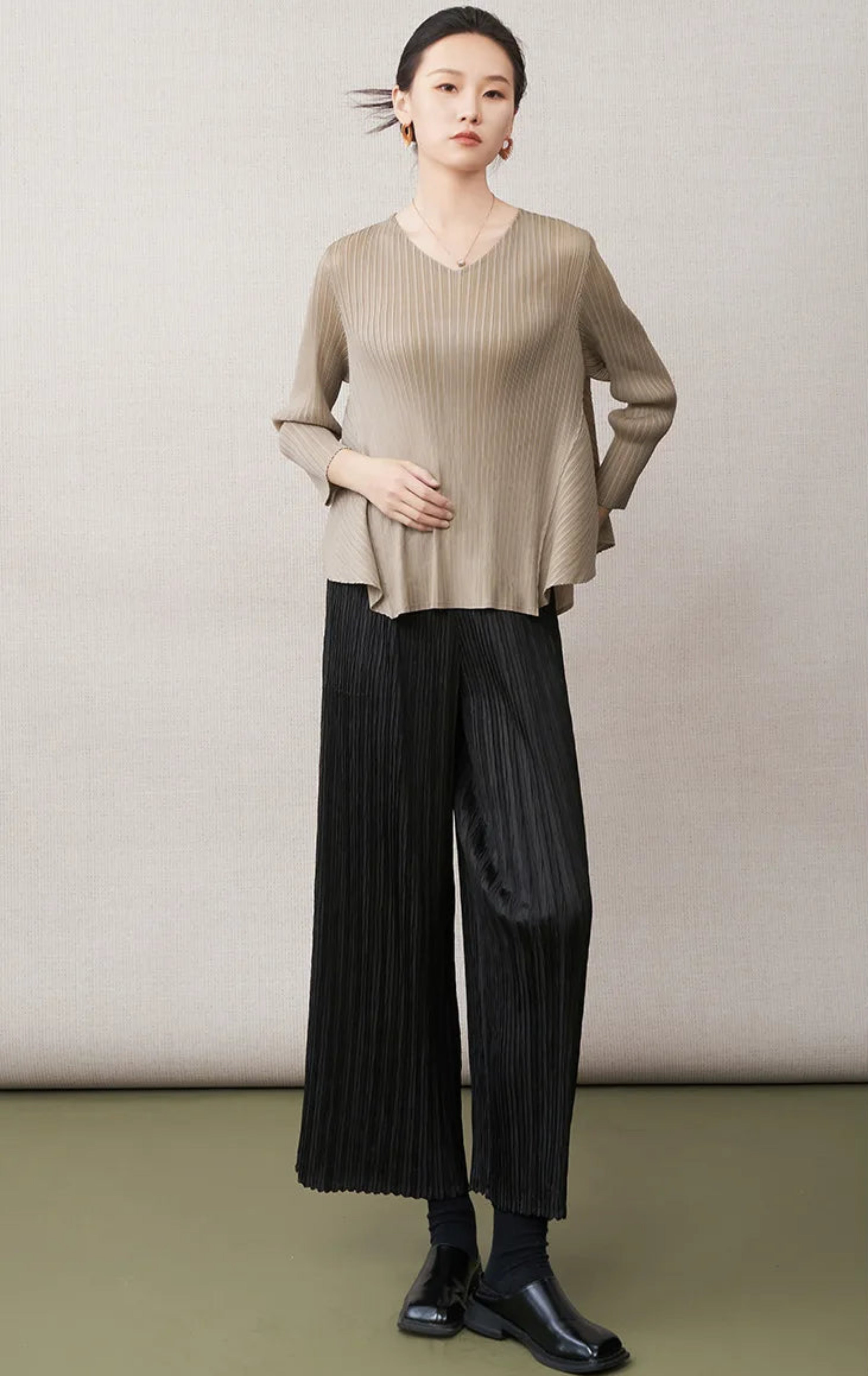 This elegant Japanese micro-pleated V-neck top flows with finely ribbed pleats and a sculptural asymmetrical hem.