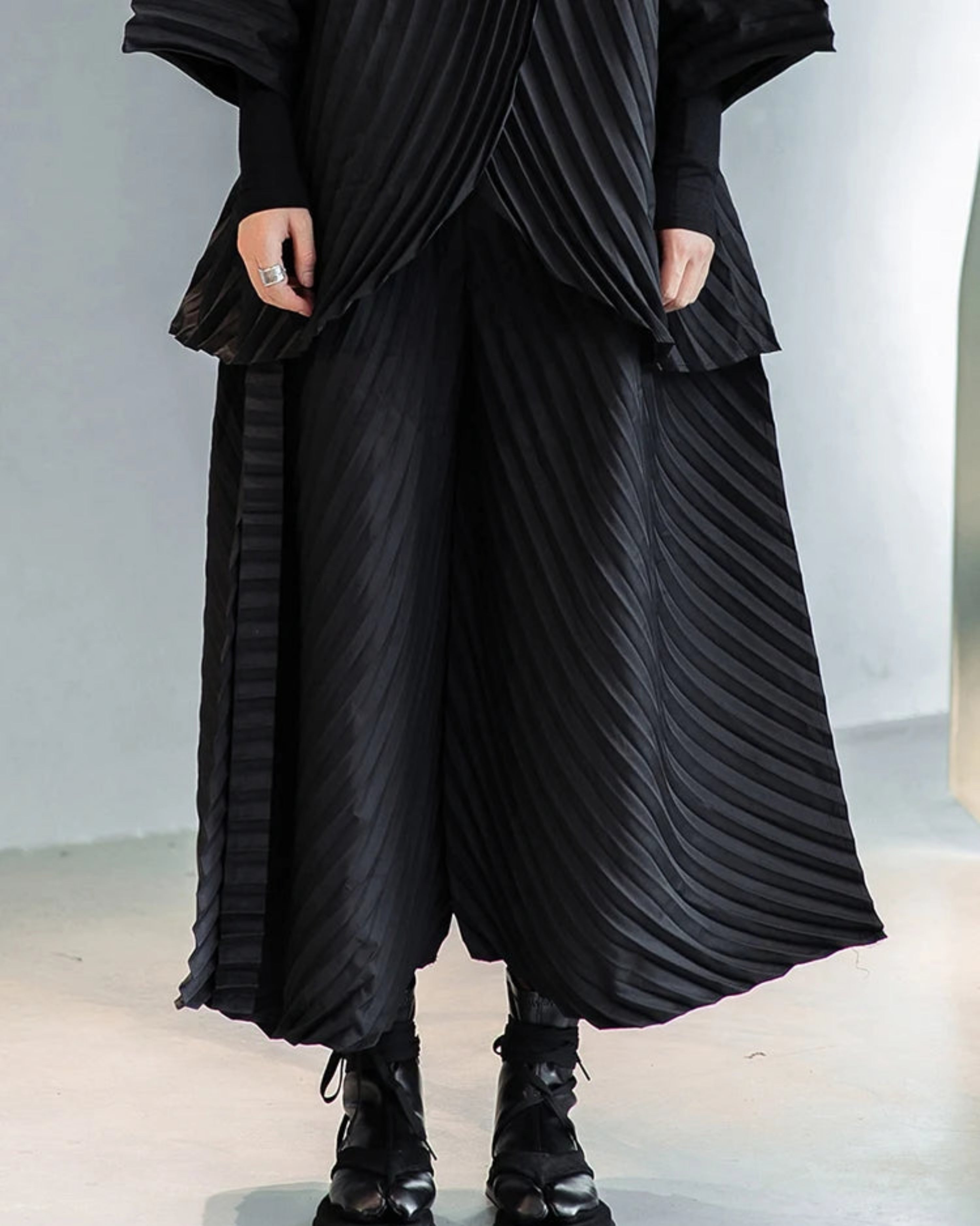 This designer Japanese plissé set features an oversized pleated jacket paired with matching cropped wide-leg pants.