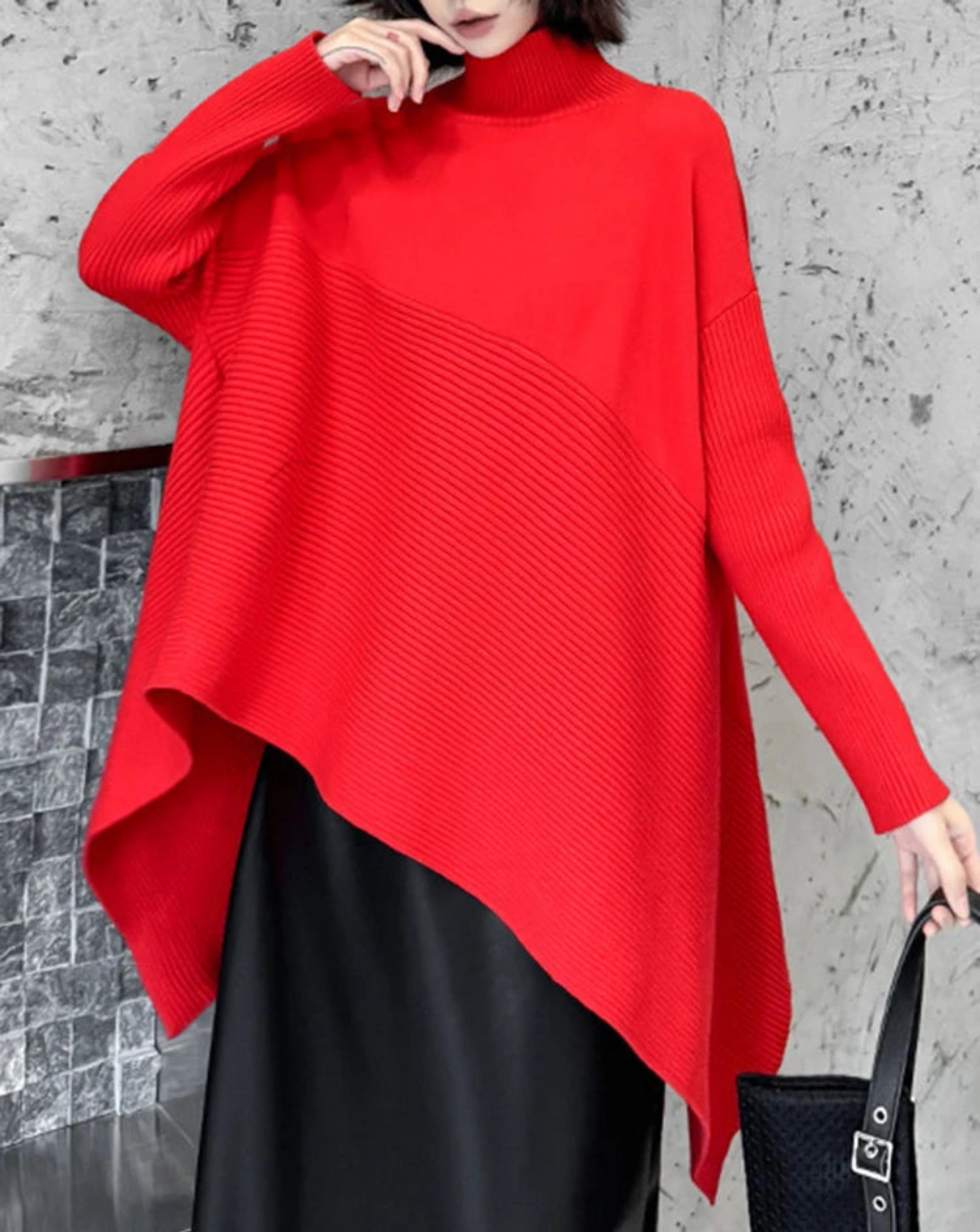 This oversized knit turtleneck sweater features a soft, roomy drape, a warm foldover neckline, and an asymmetric hem that adds an avant-garde touch.