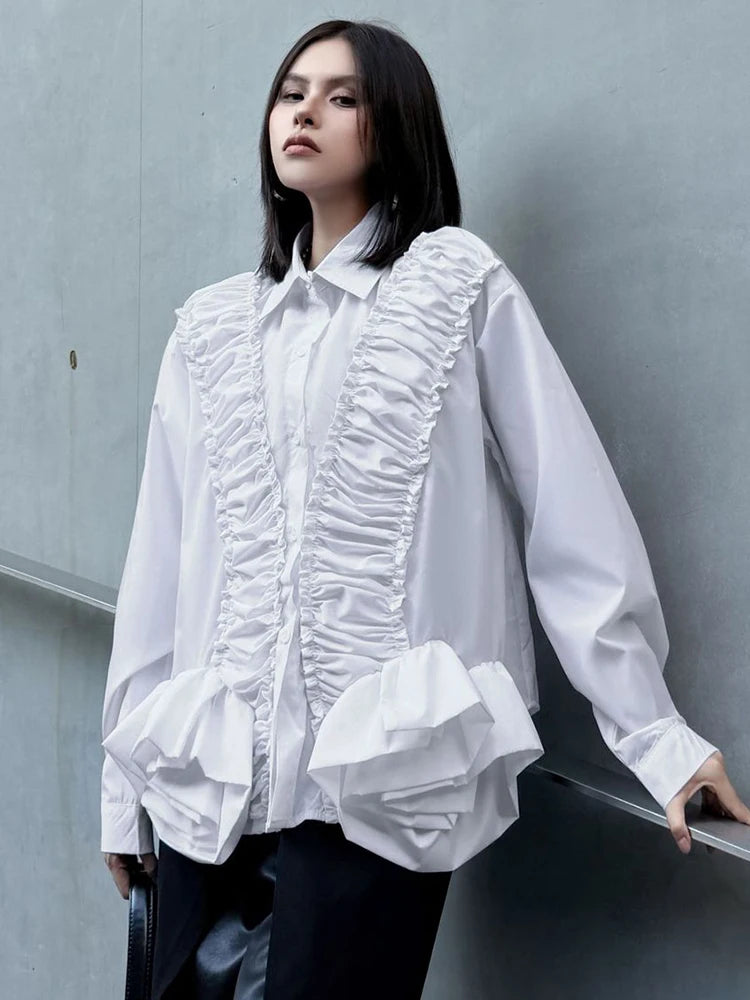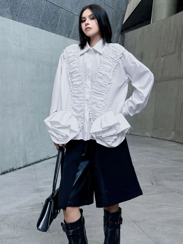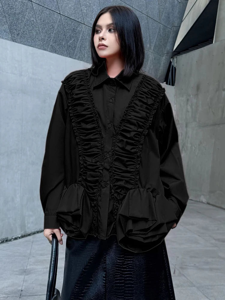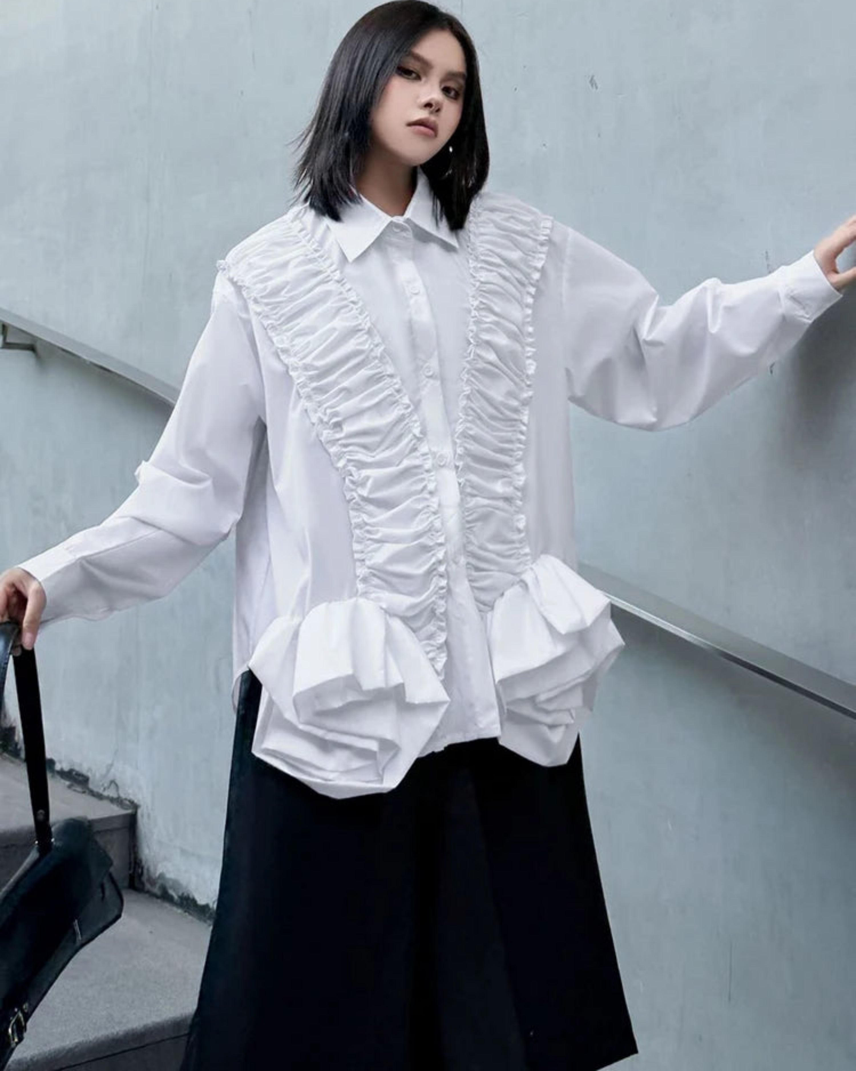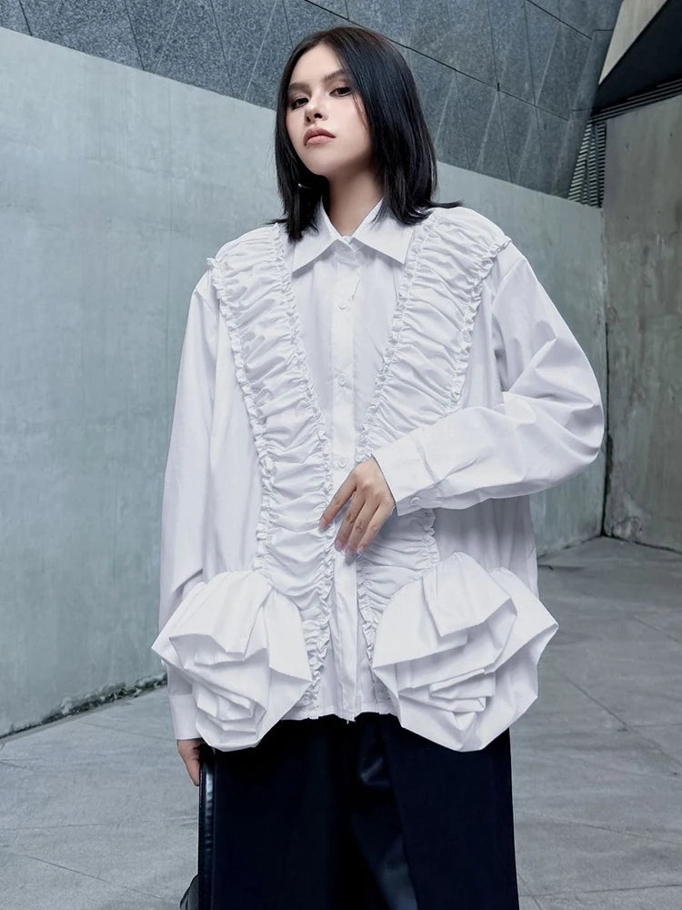 A luxurious avant-garde blouse with dramatic 3D ruffle flowers cascading down the front. It features a classic collar, button-down front, and long sleeves with buttoned cuffs.