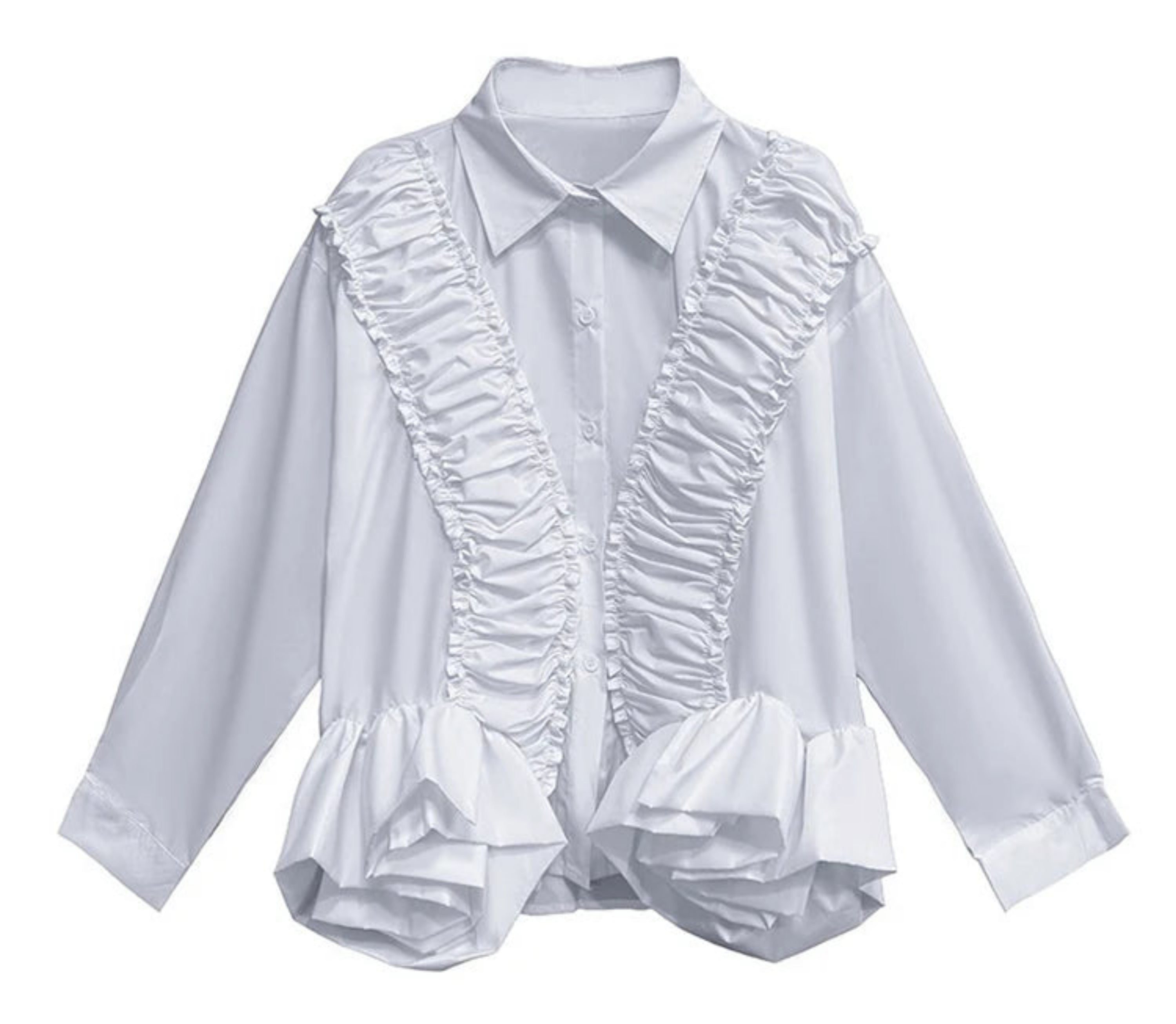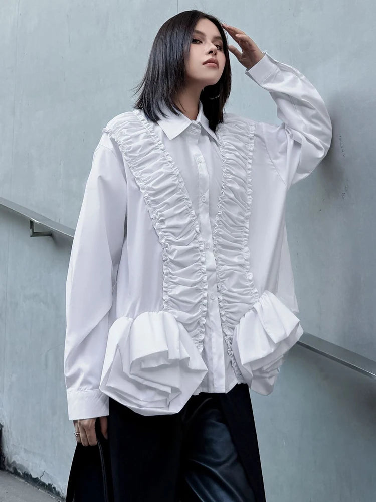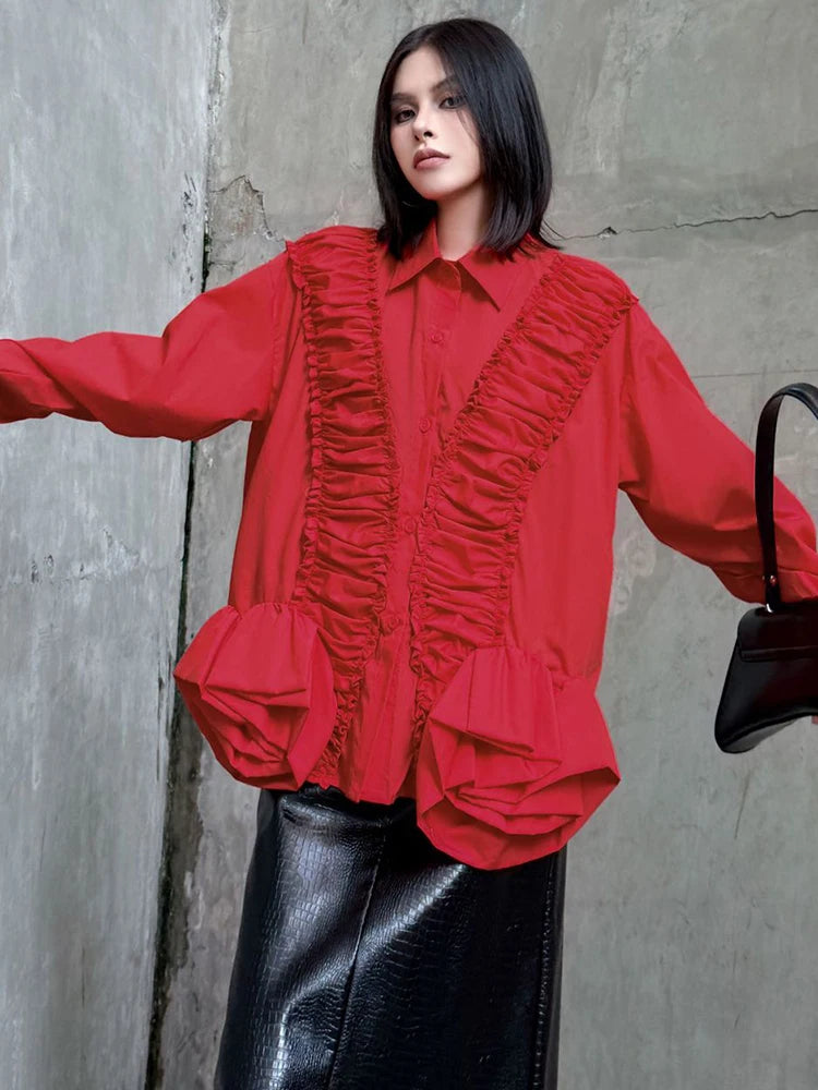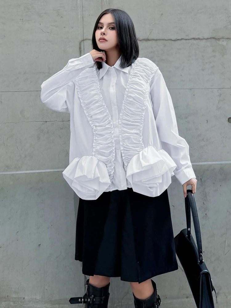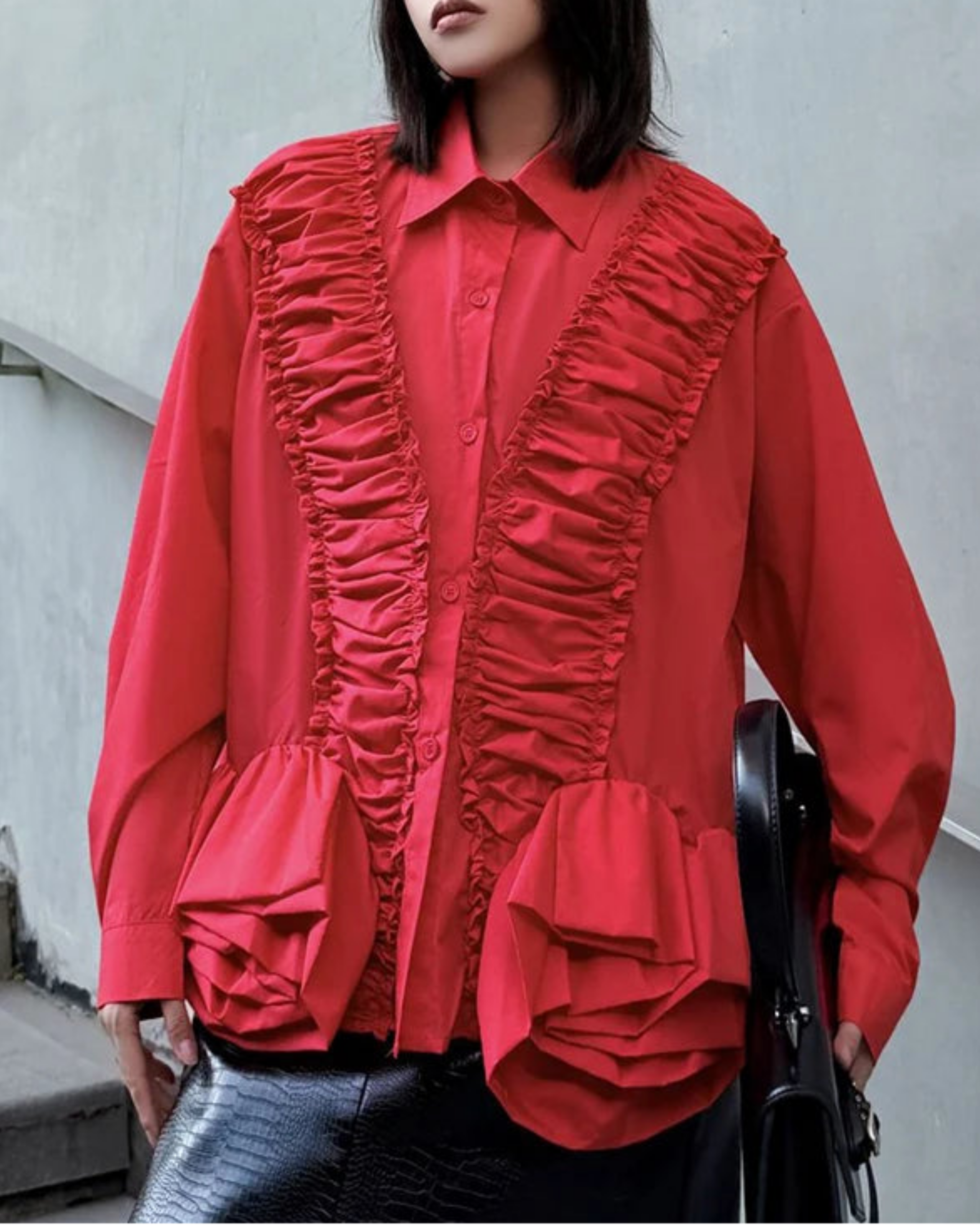 A luxurious avant-garde blouse with dramatic 3D ruffle flowers cascading down the front. It features a classic collar, button-down front, and long sleeves with buttoned cuffs.