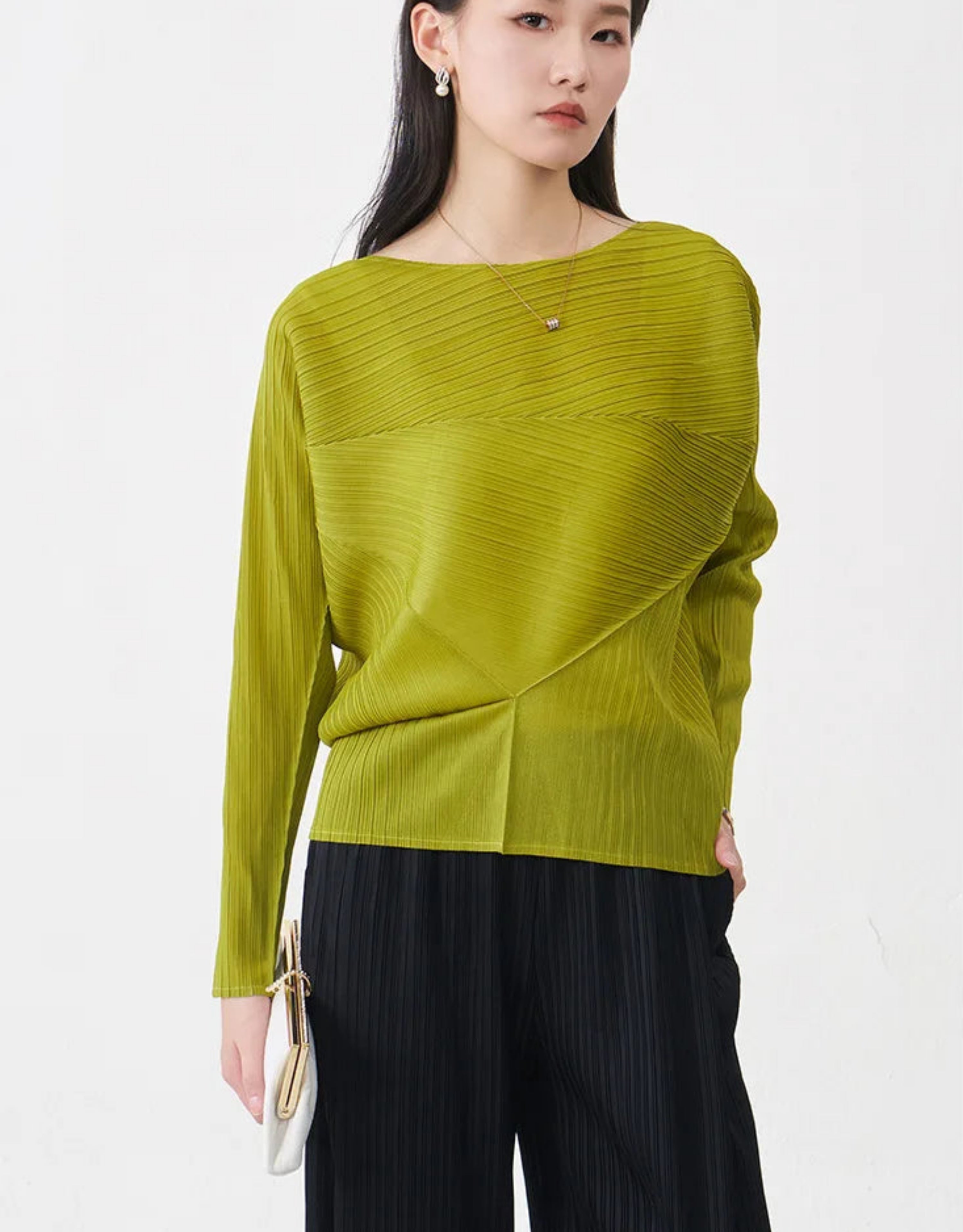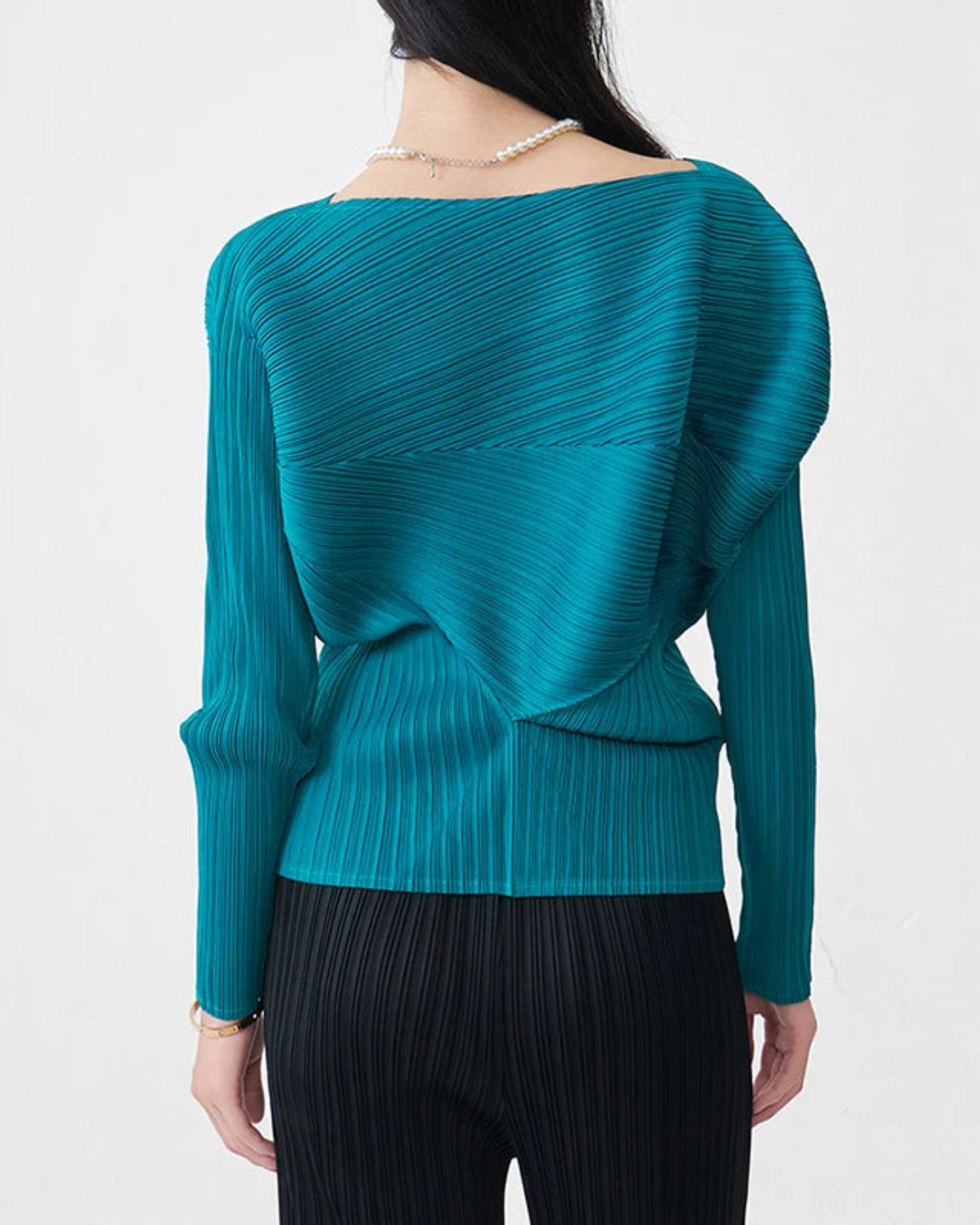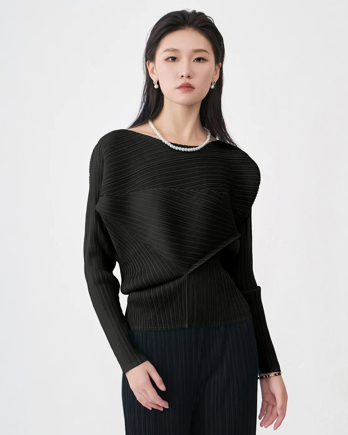 Designer Pleated Knit Asymmetric Top – Japanese Plissé Blouse for Office, Dinner & Travel