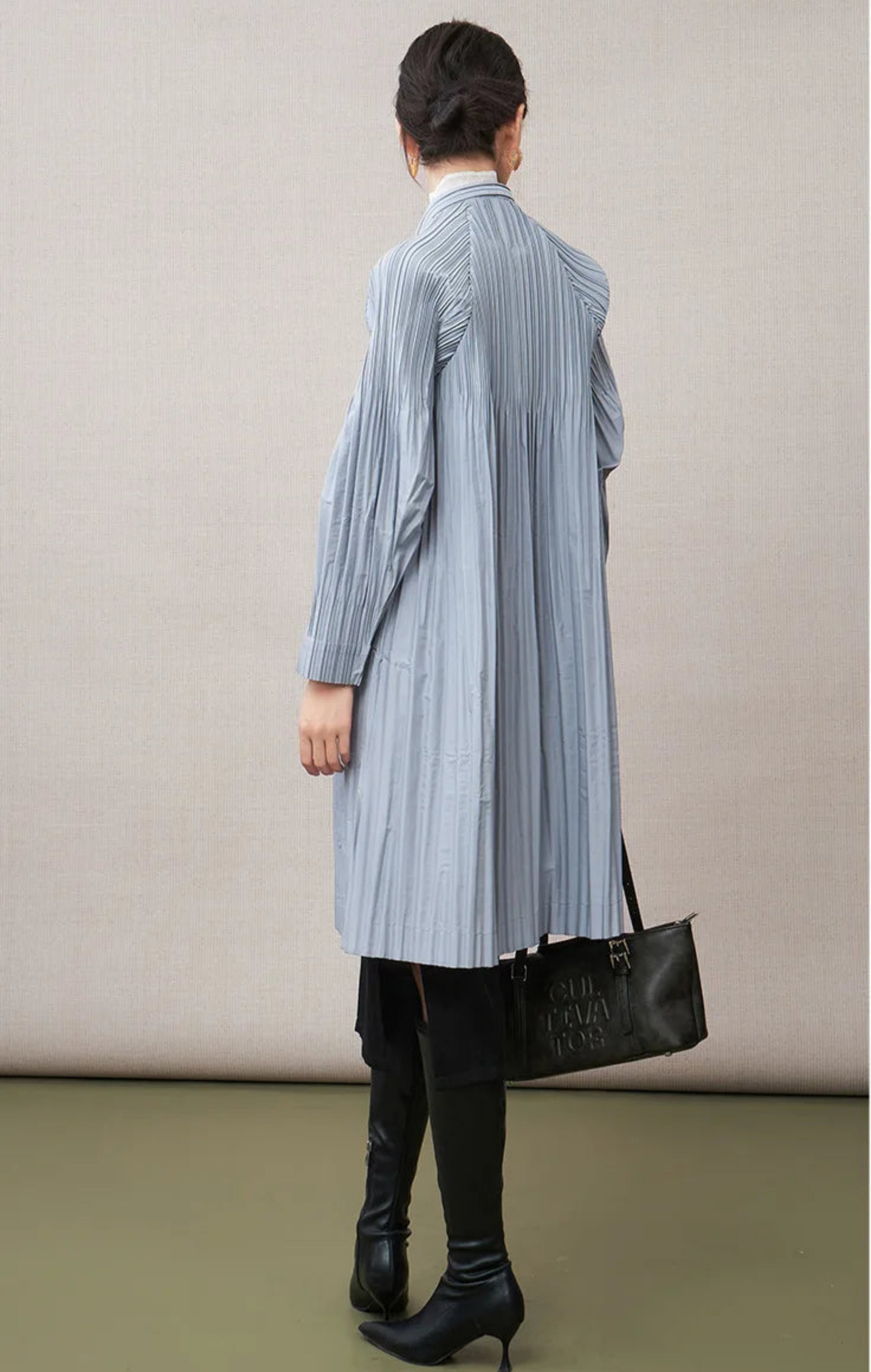 The relaxed silhouette, stand-up collar, and full-length closure offer versatile layering, while gathered cuffs and subtle seams add sophisticated detail. Travel-ready for work, formal occasions, or elevated everyday wear.
