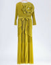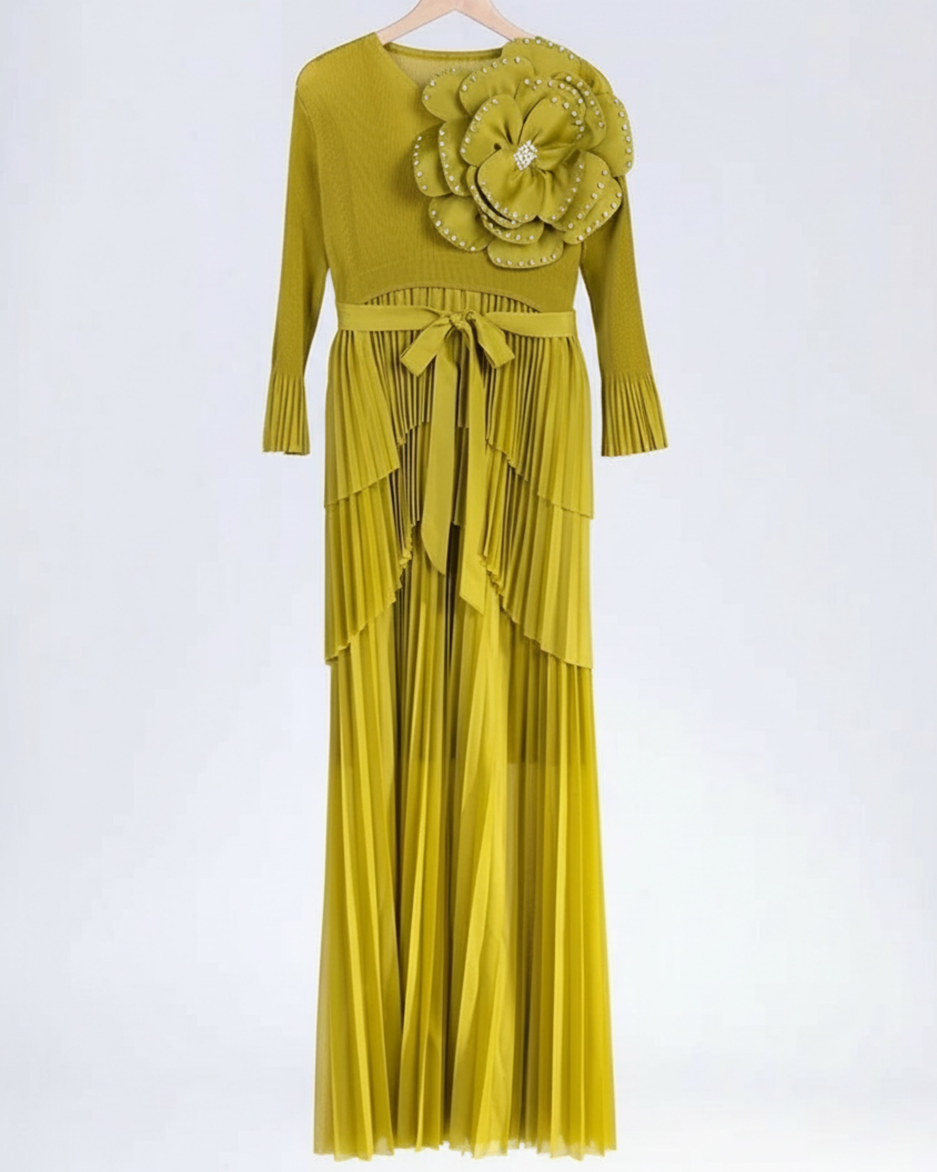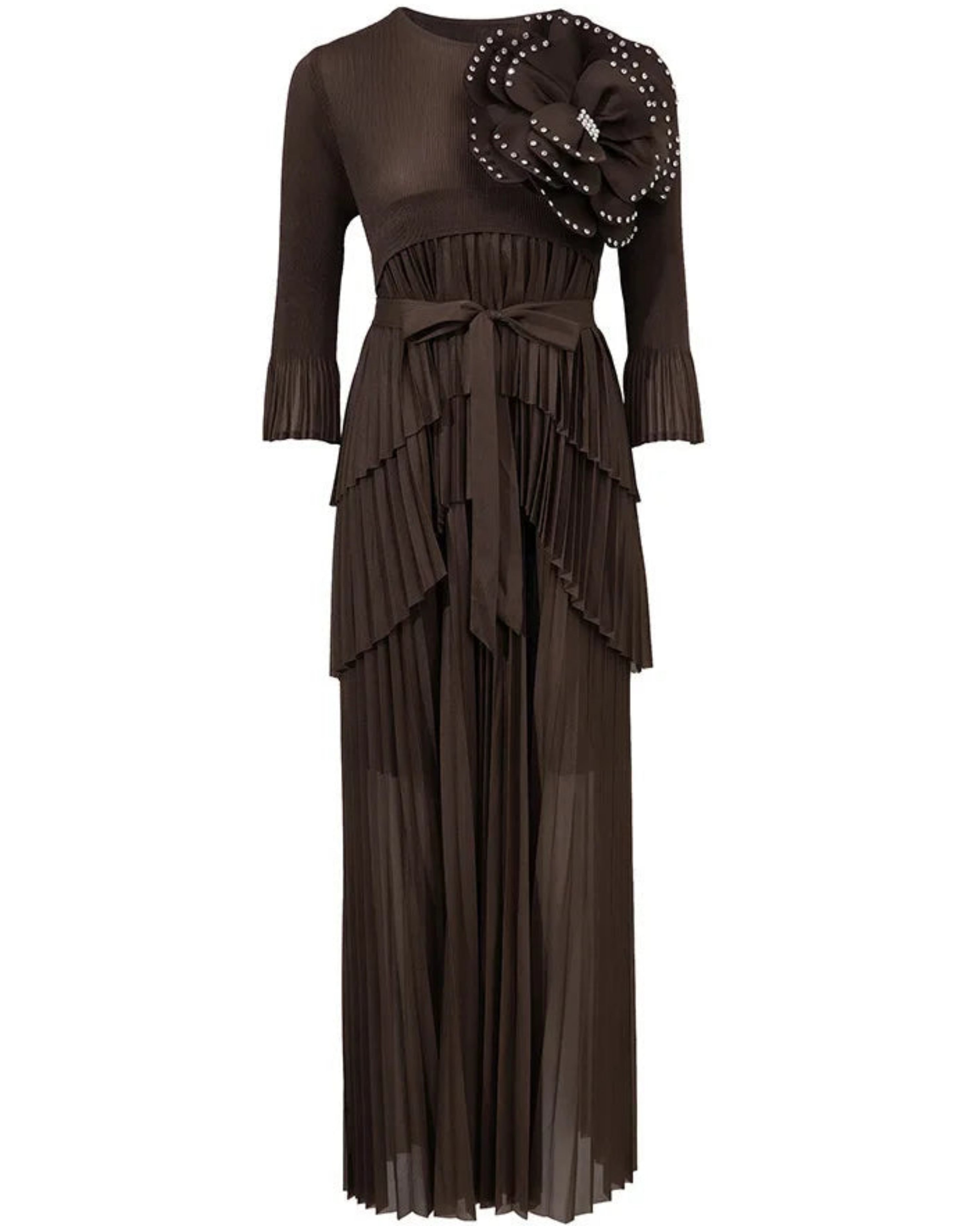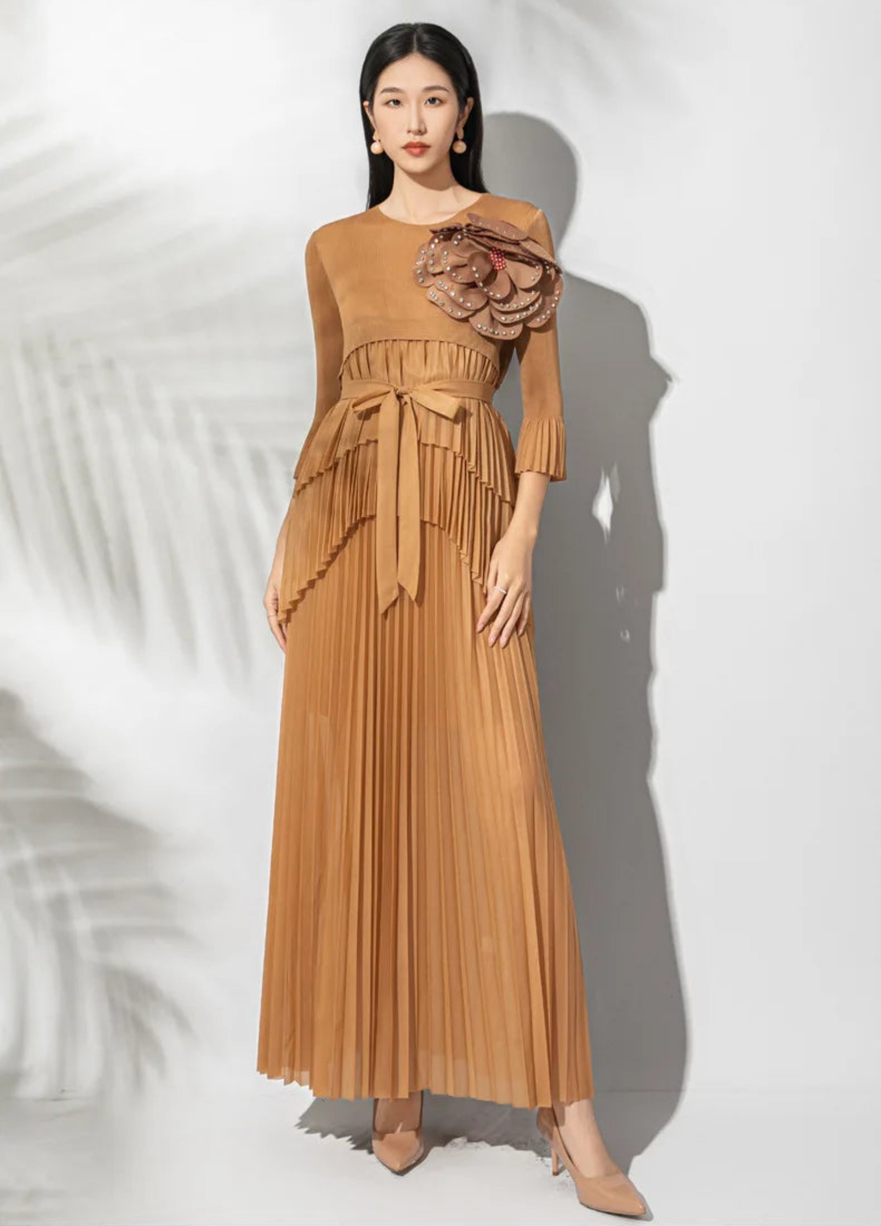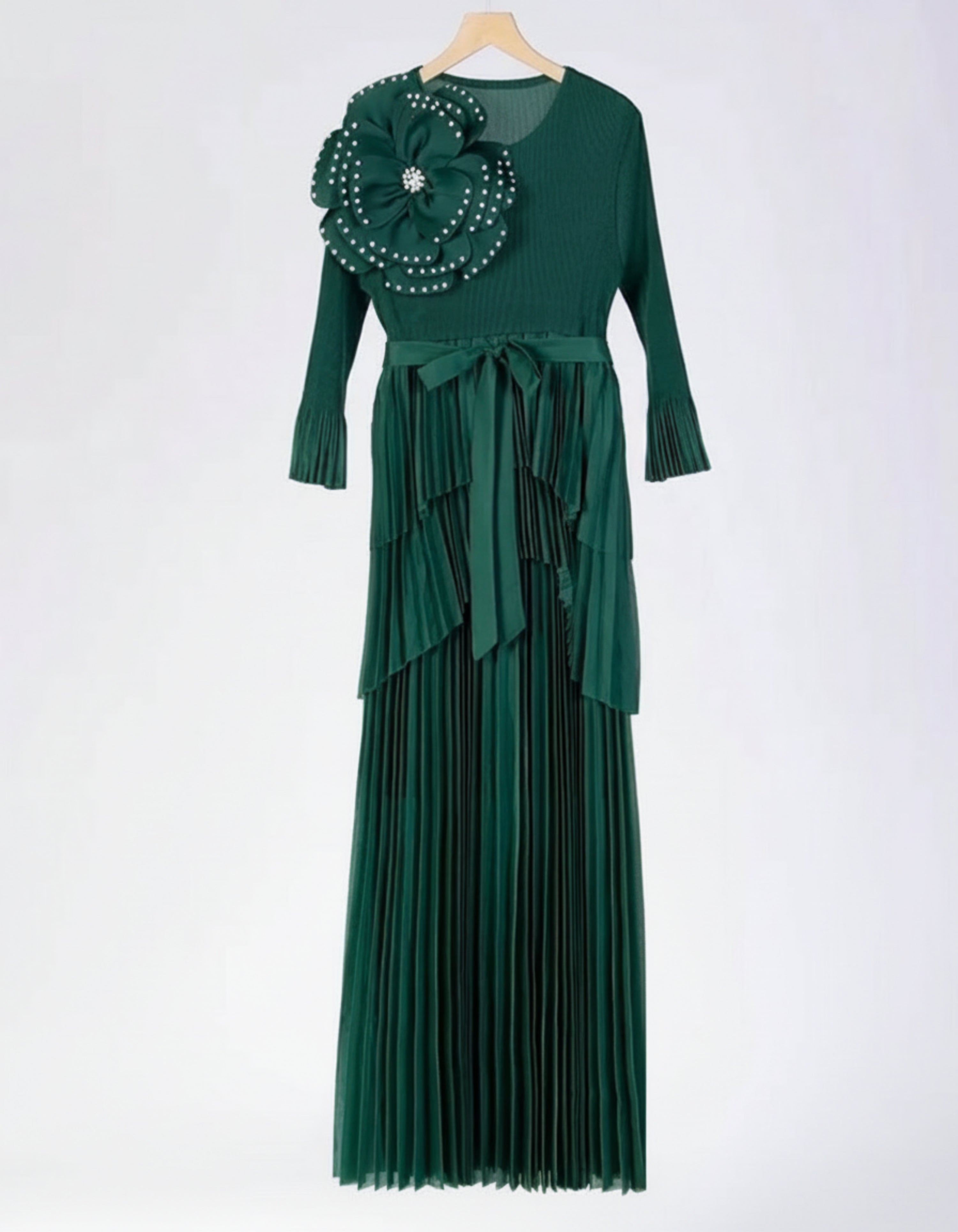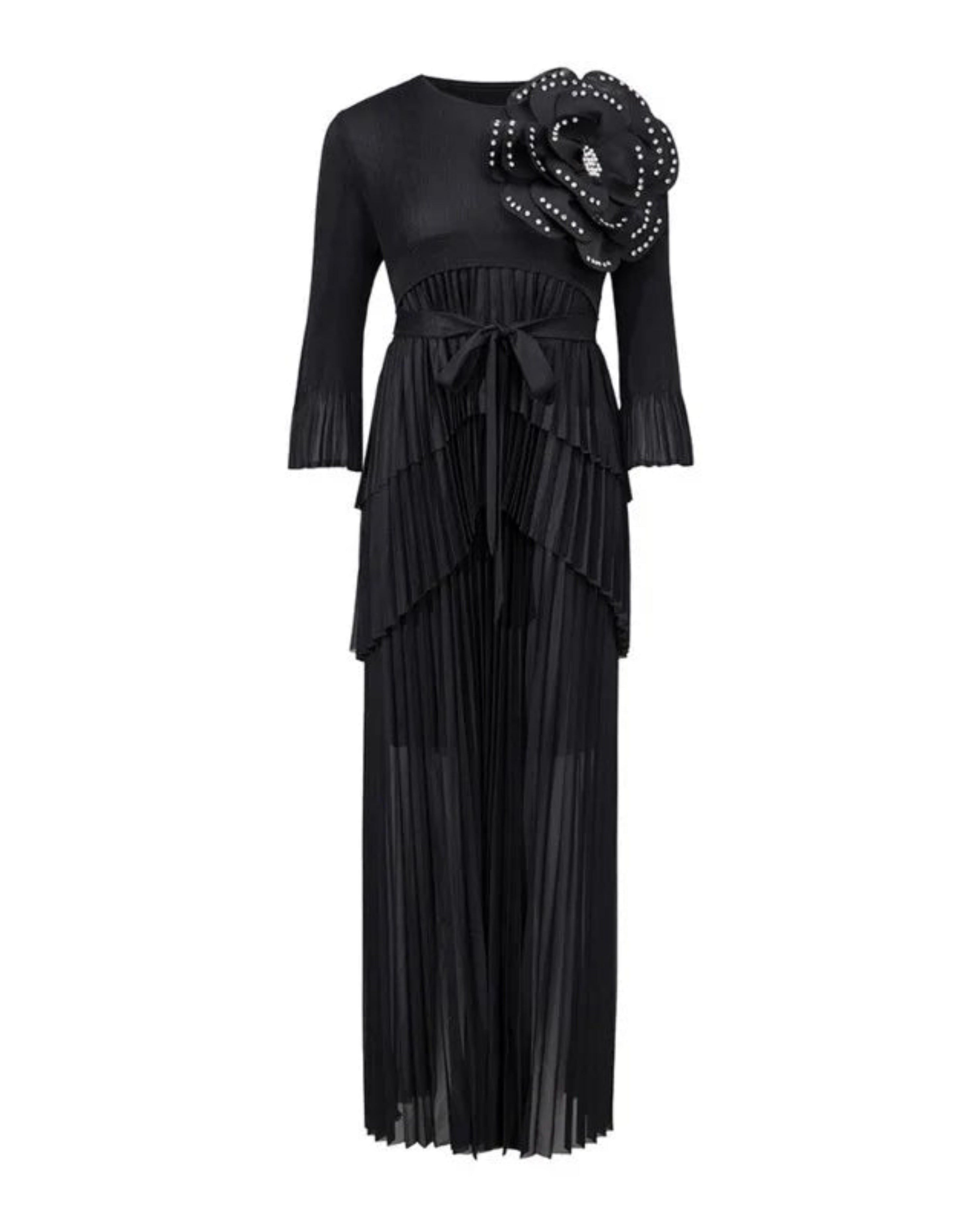 This elegant designer plissé midi dress features vertical pleats, tiered ruffles at the waist, and long sleeves with flared micro-pleated cuffs.