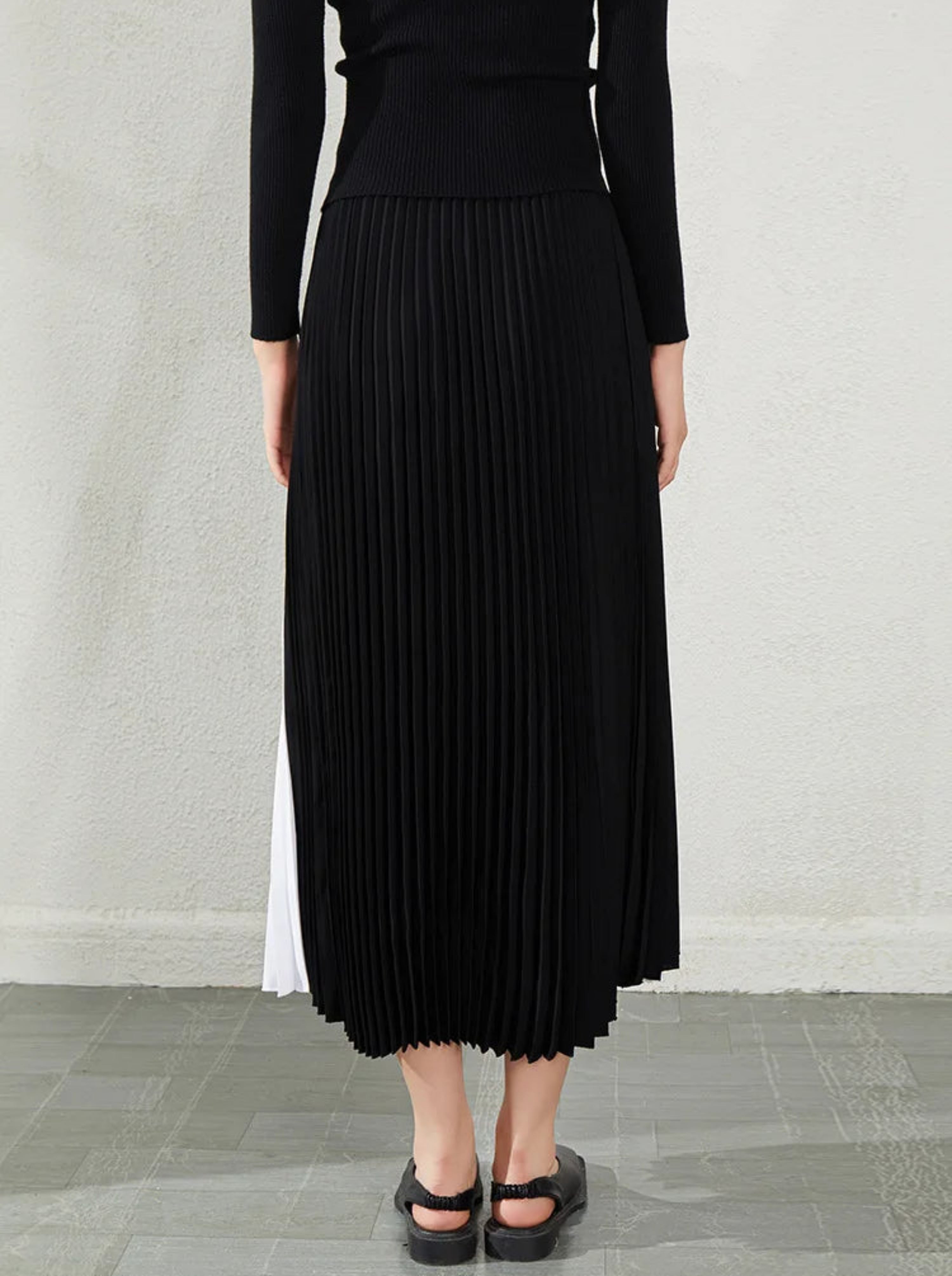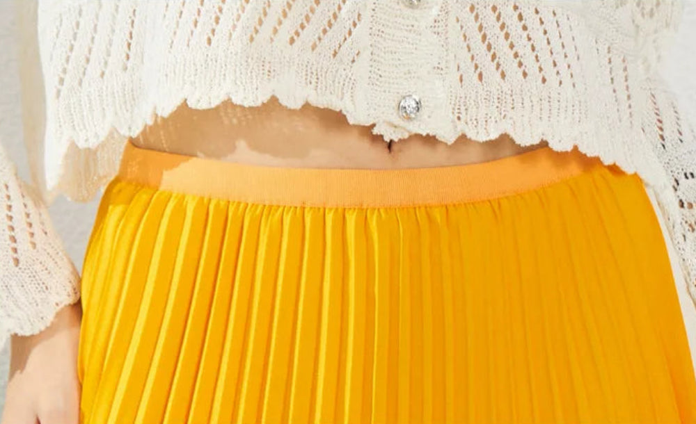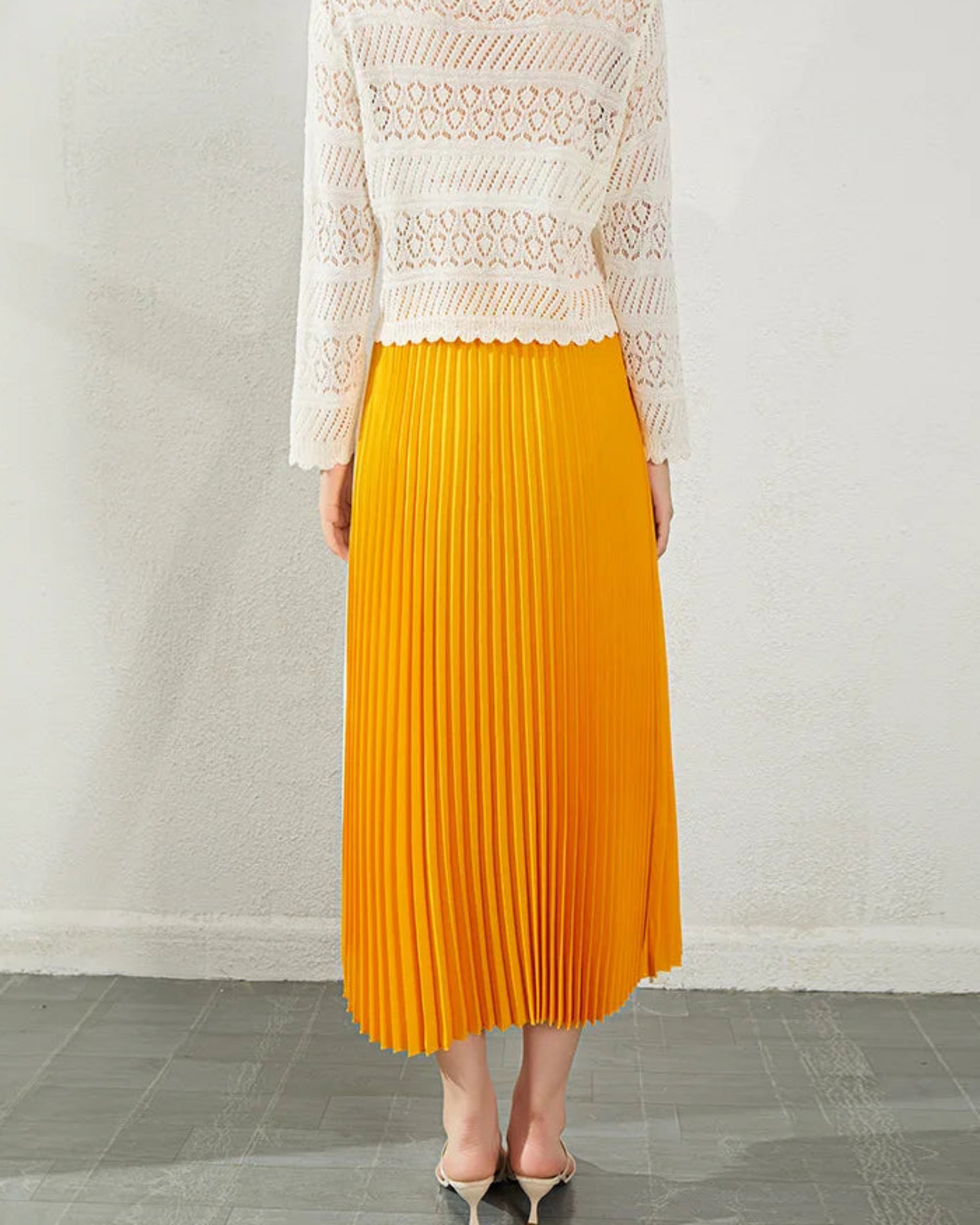 Premium Japanese plissé midi skirt for work, travel, and formal wear. High-waisted with elastic waistband and pull-on fit.