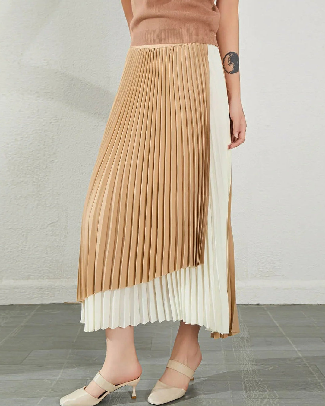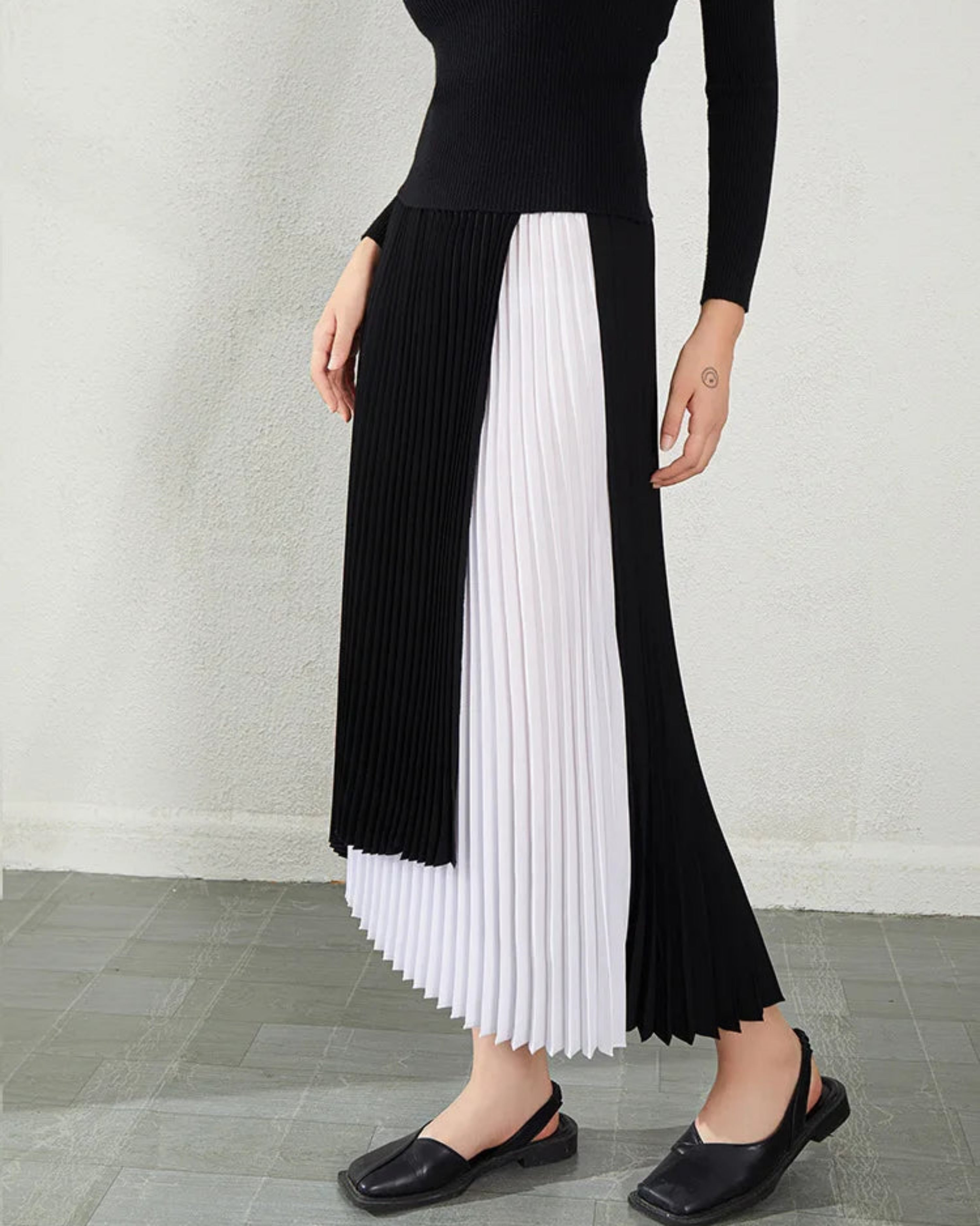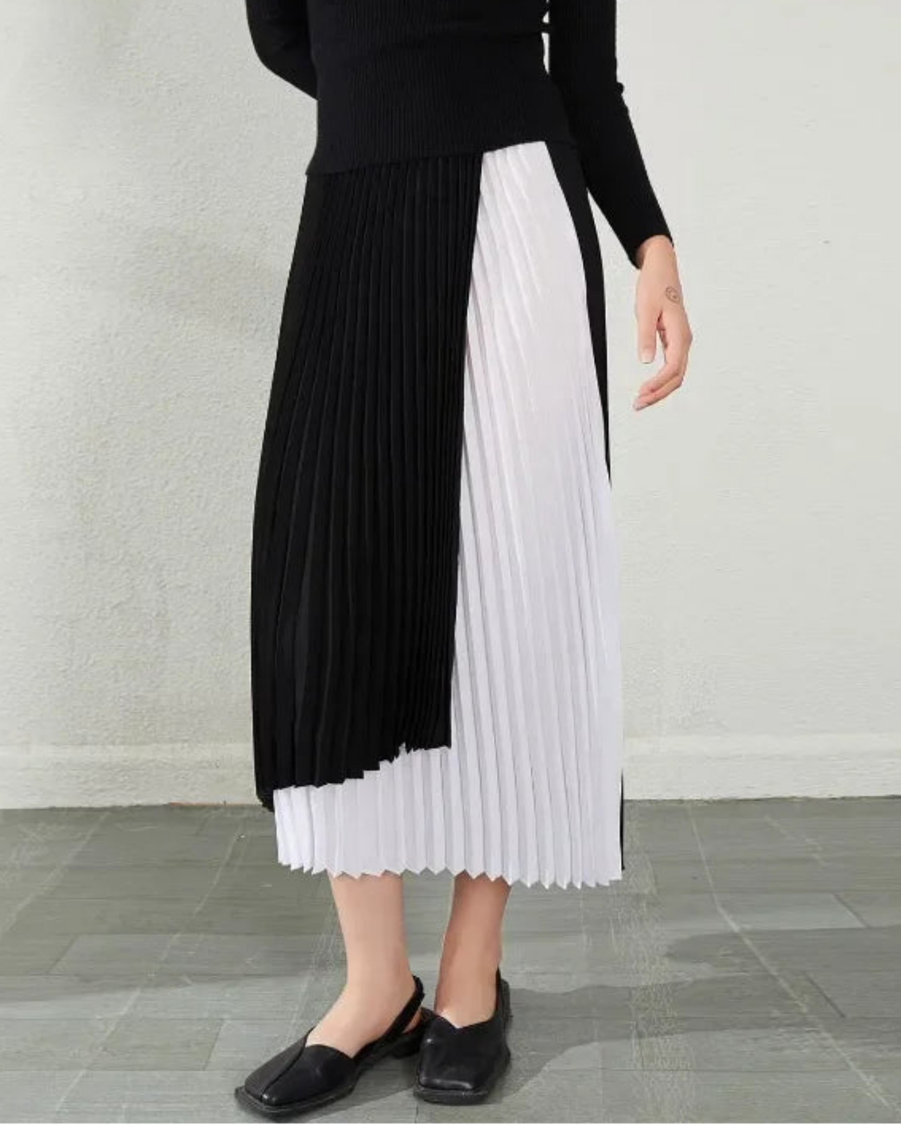 Layered accordion pleats with an asymmetrical overlay create a modern, dynamic silhouette. Stretchy, wrinkle-resistant fabric keeps shape — comfortable and elegant for day-to-night wear.