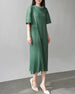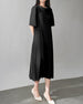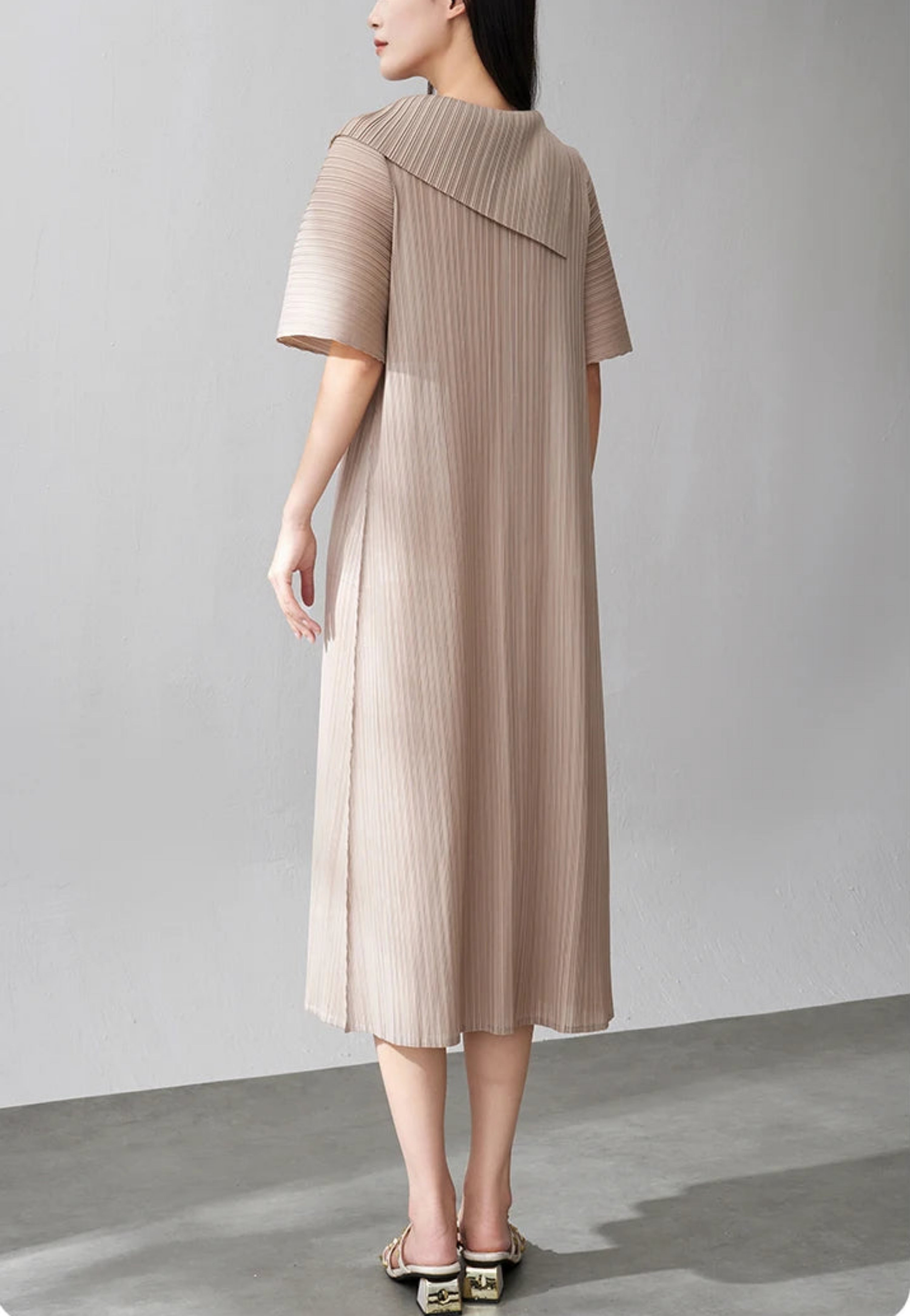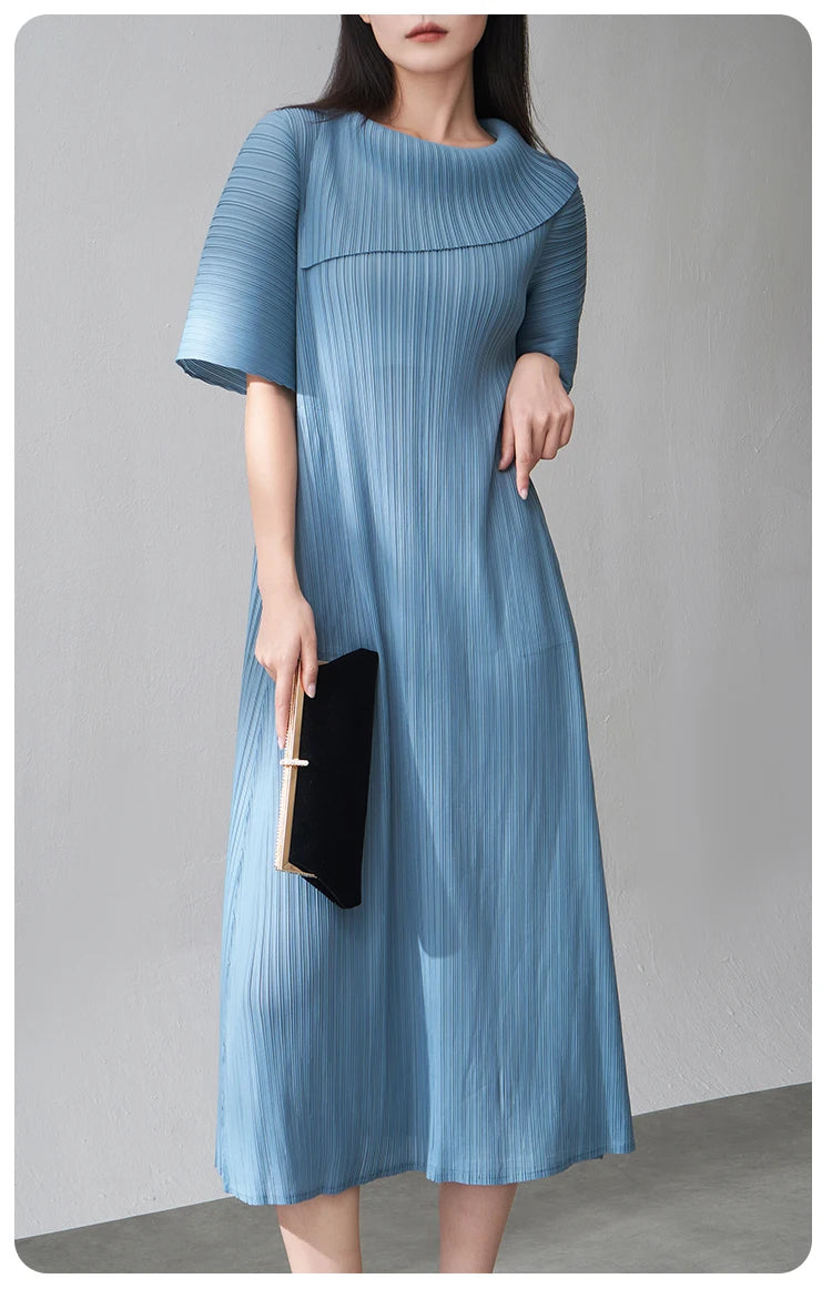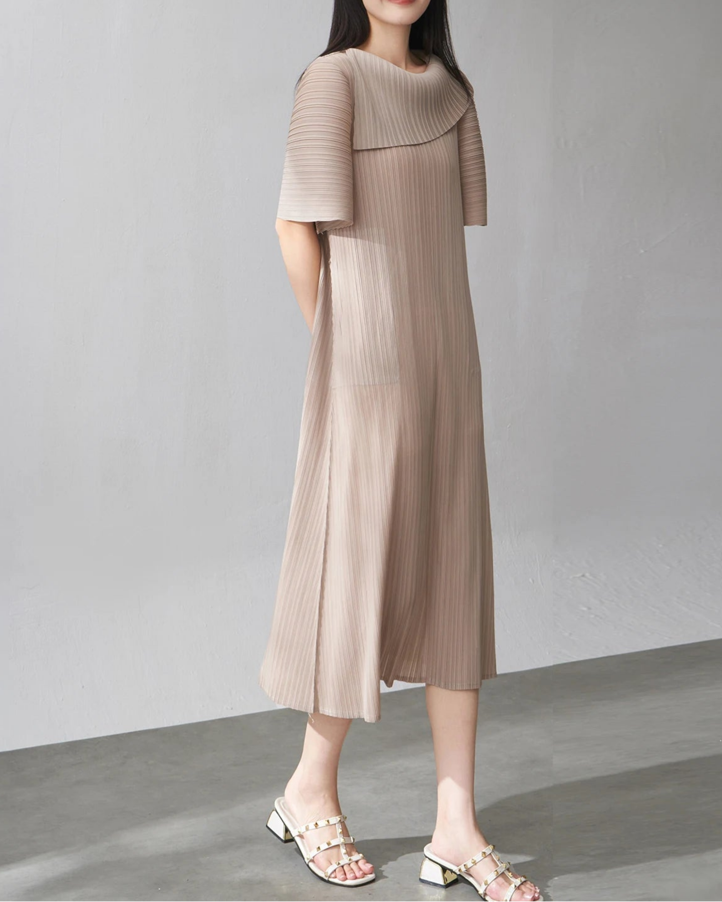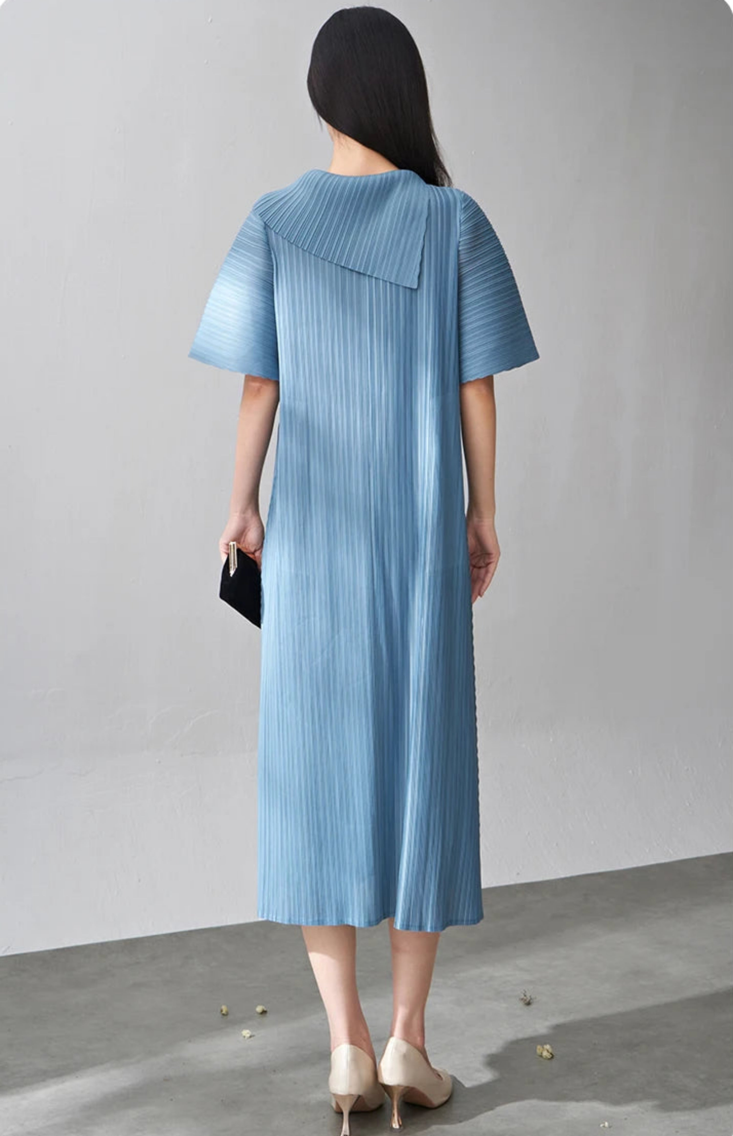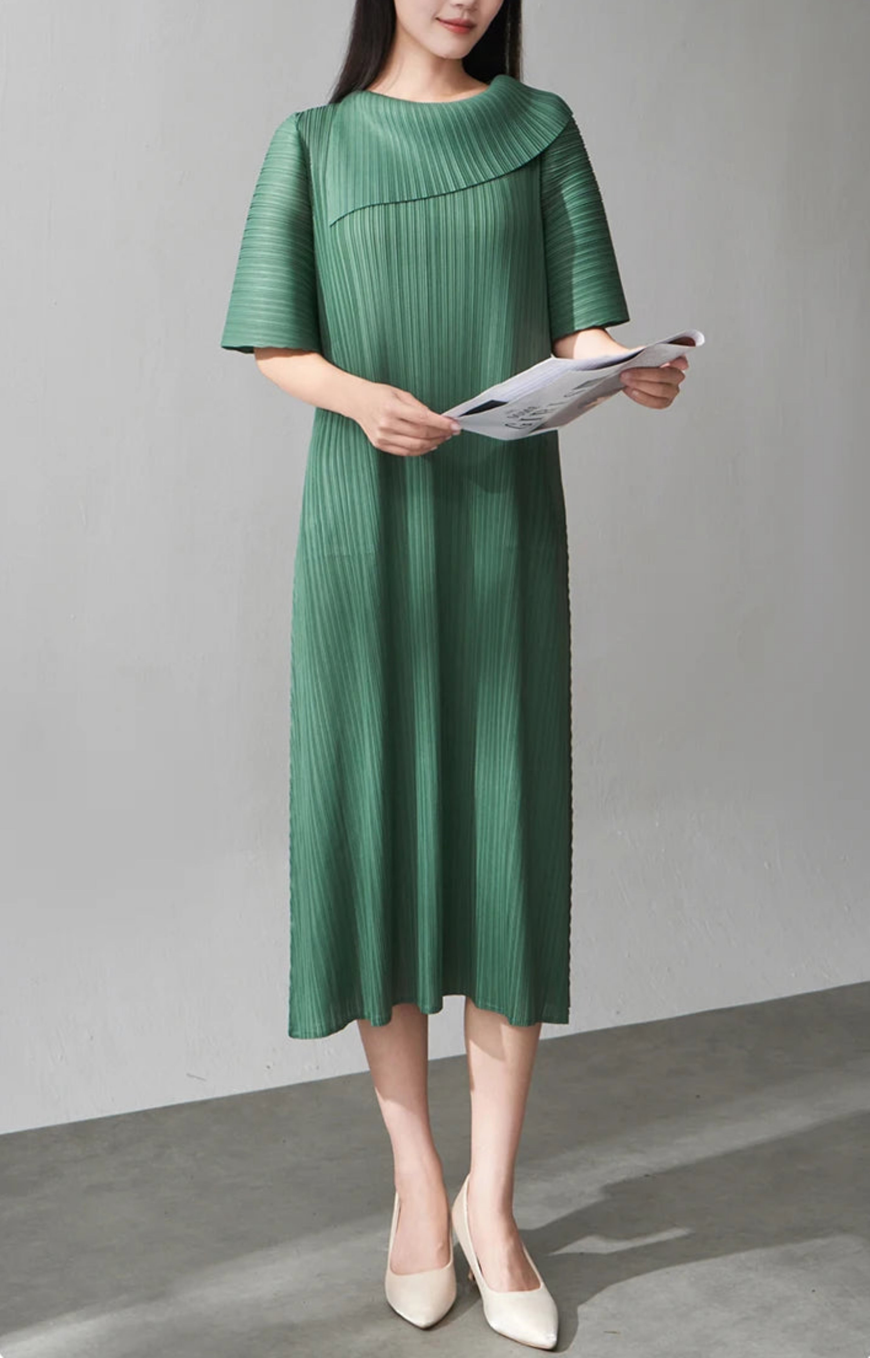 Premium Japanese plissé midi dress for work, travel, and formal wear. Round neckline with draped, asymmetrical ruffled collar and short balloon sleeves create a modern, sculptural silhouette.