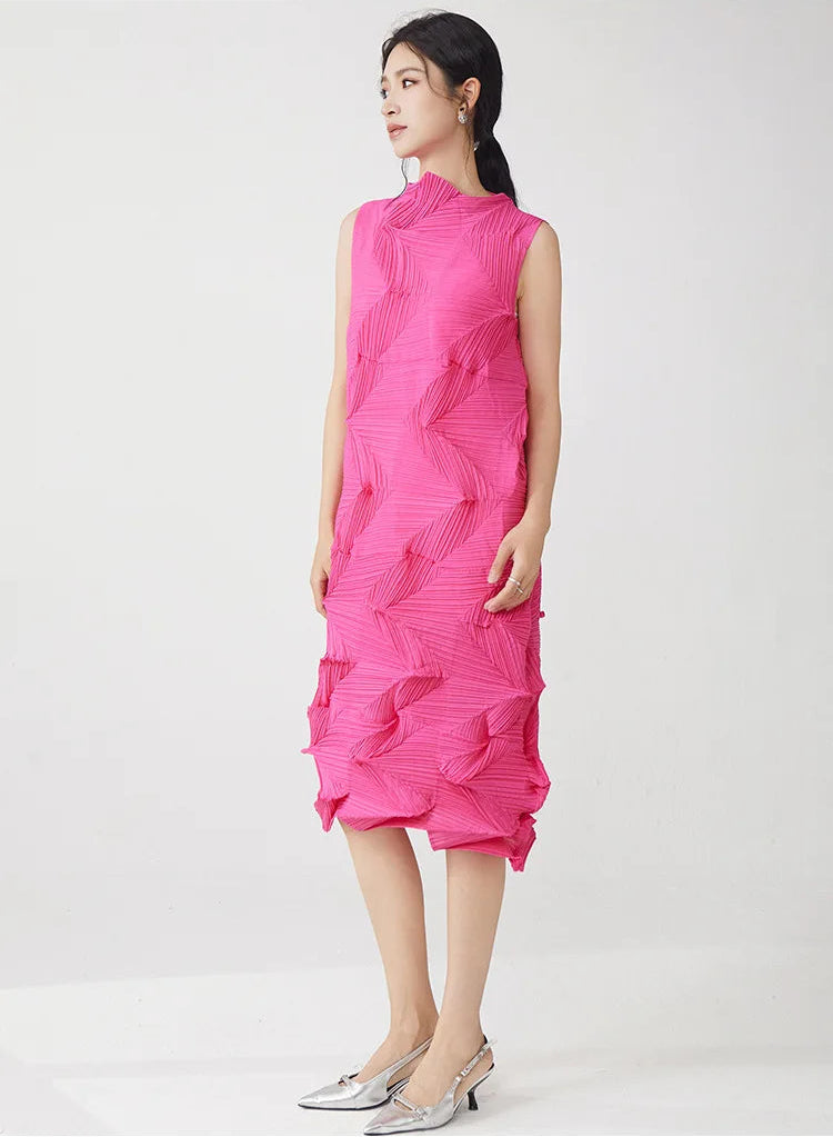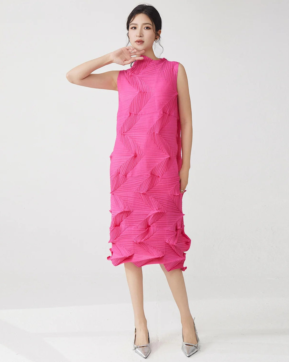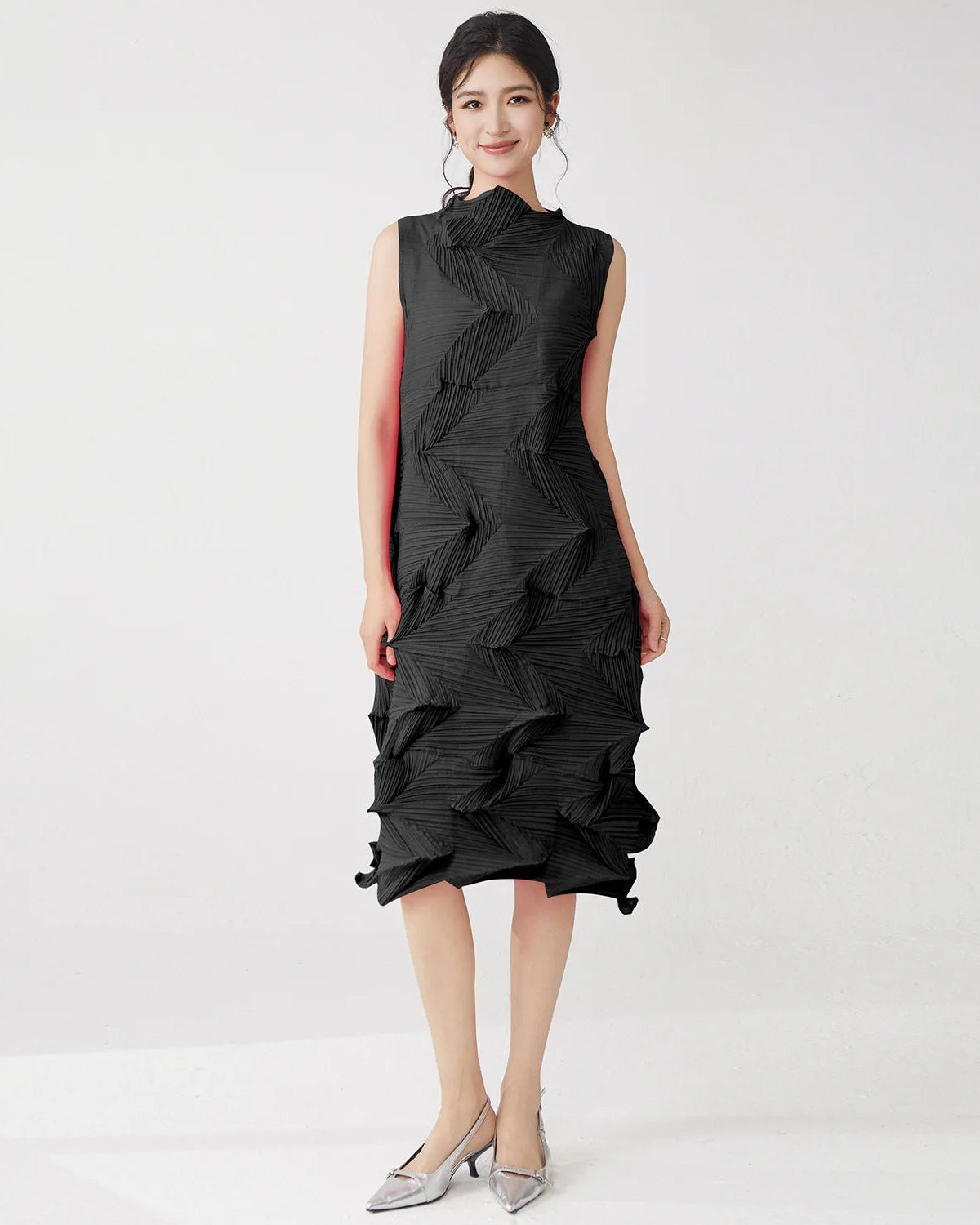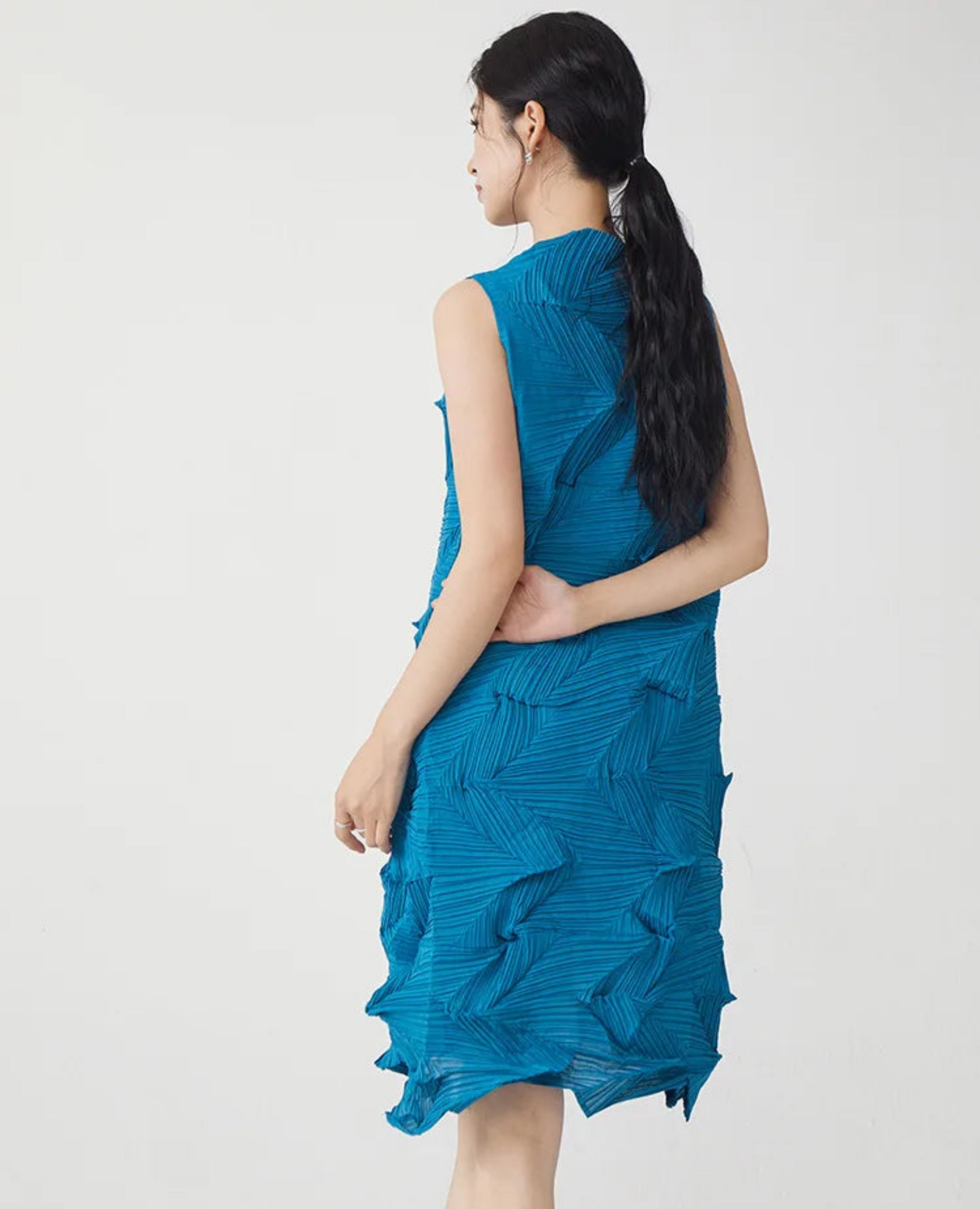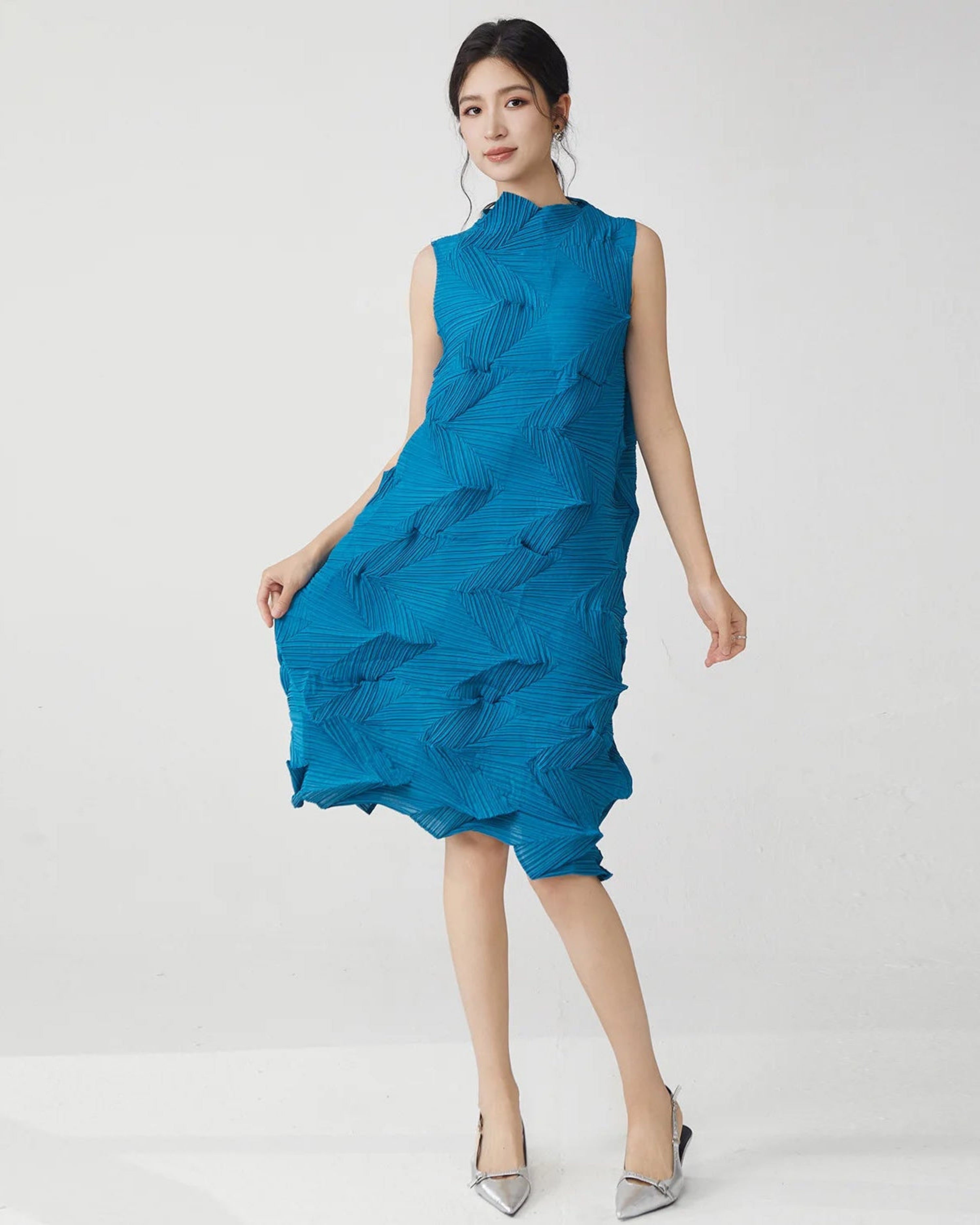 Perfect for cocktail parties, formal events, vacations, work wear, & special occasions, this Japanese plissé sleeveless above-knee dress features a geometric, multi-directional texture.
