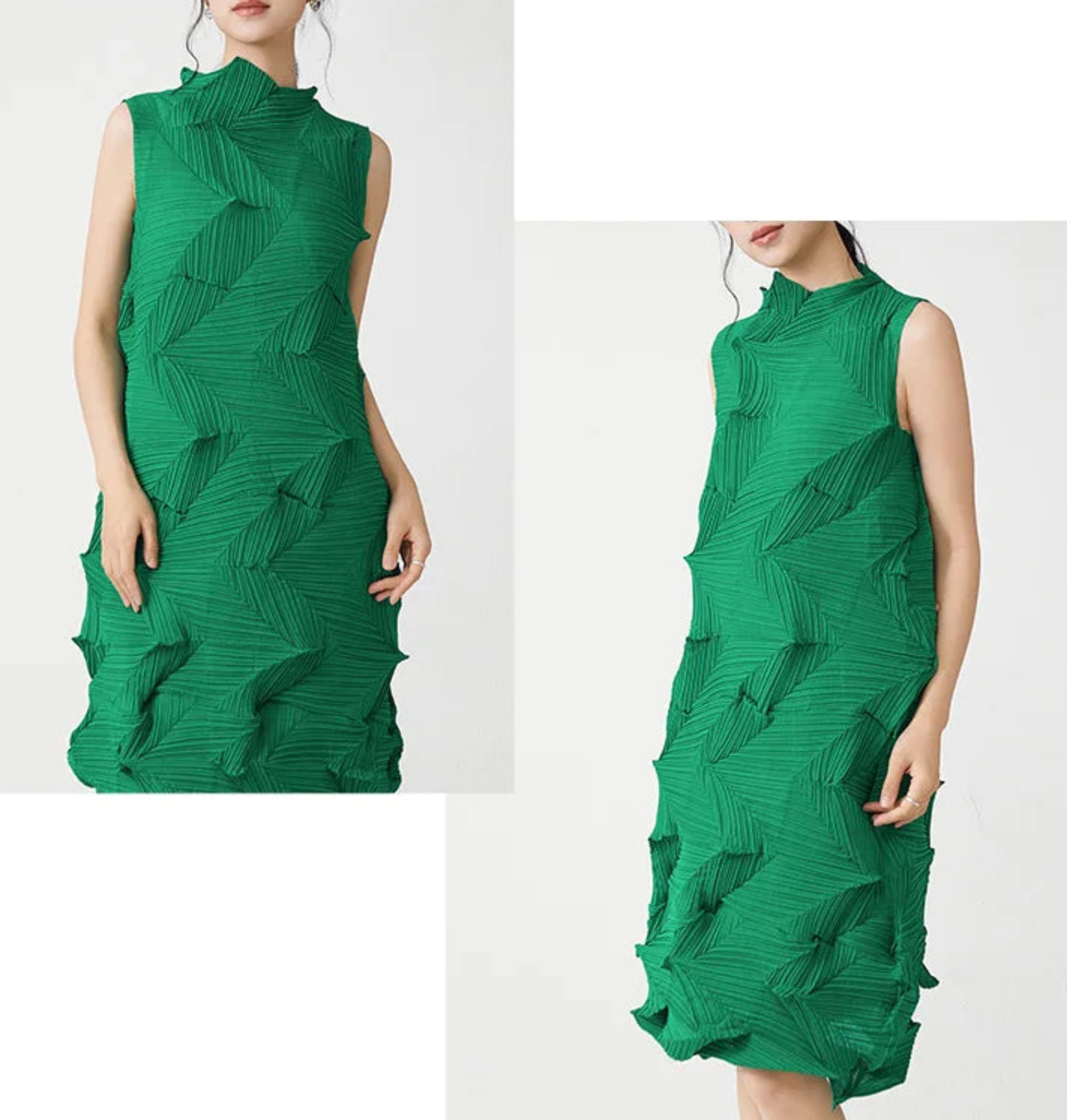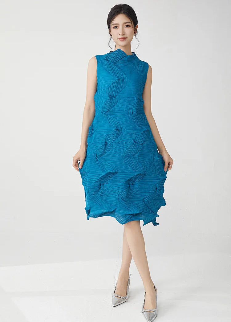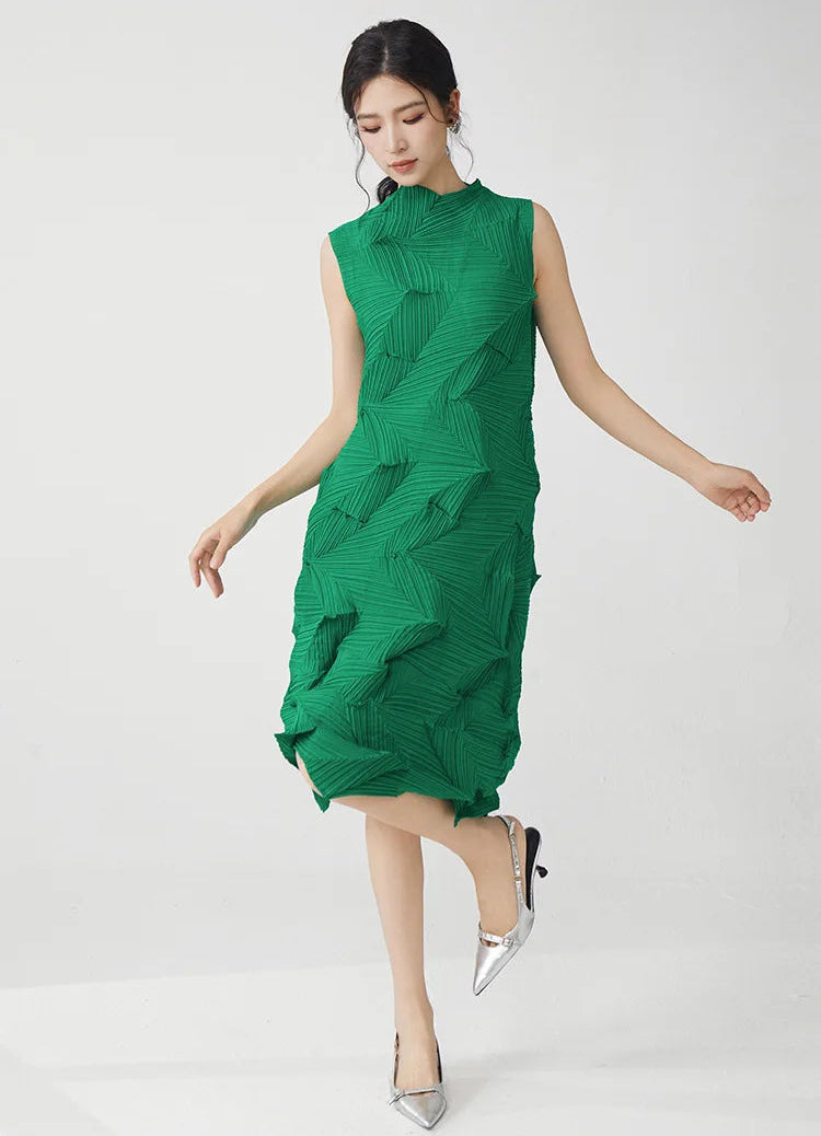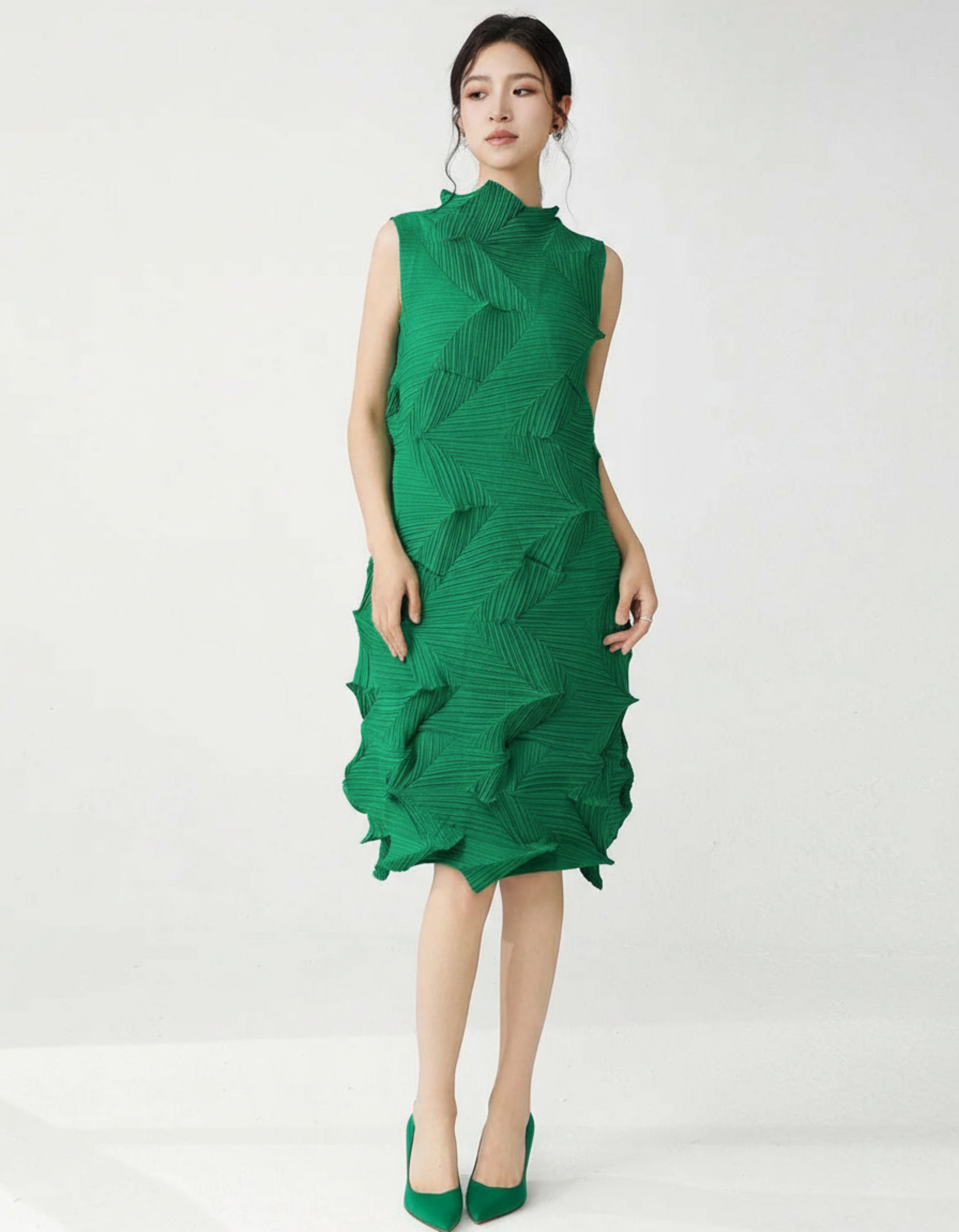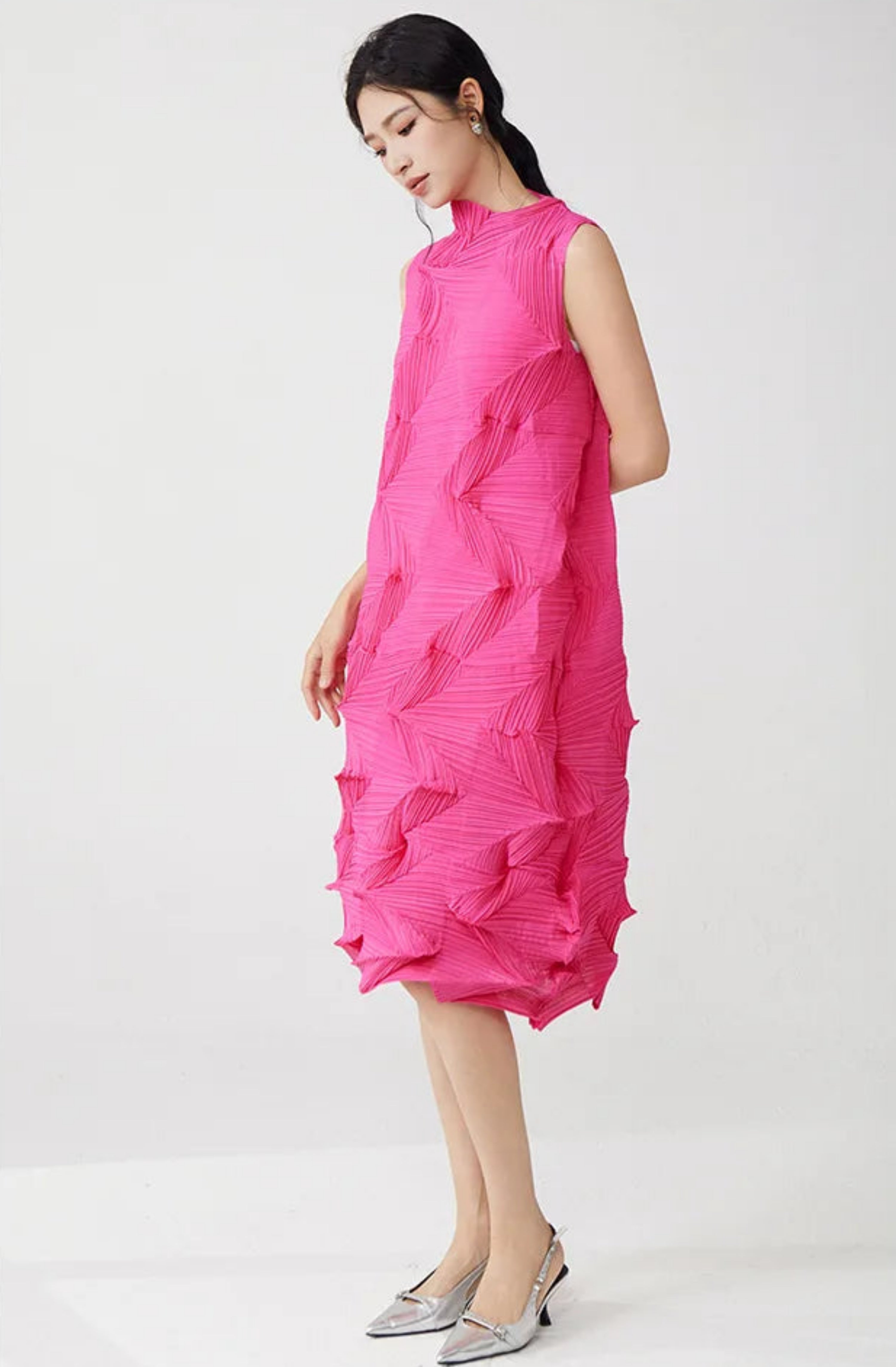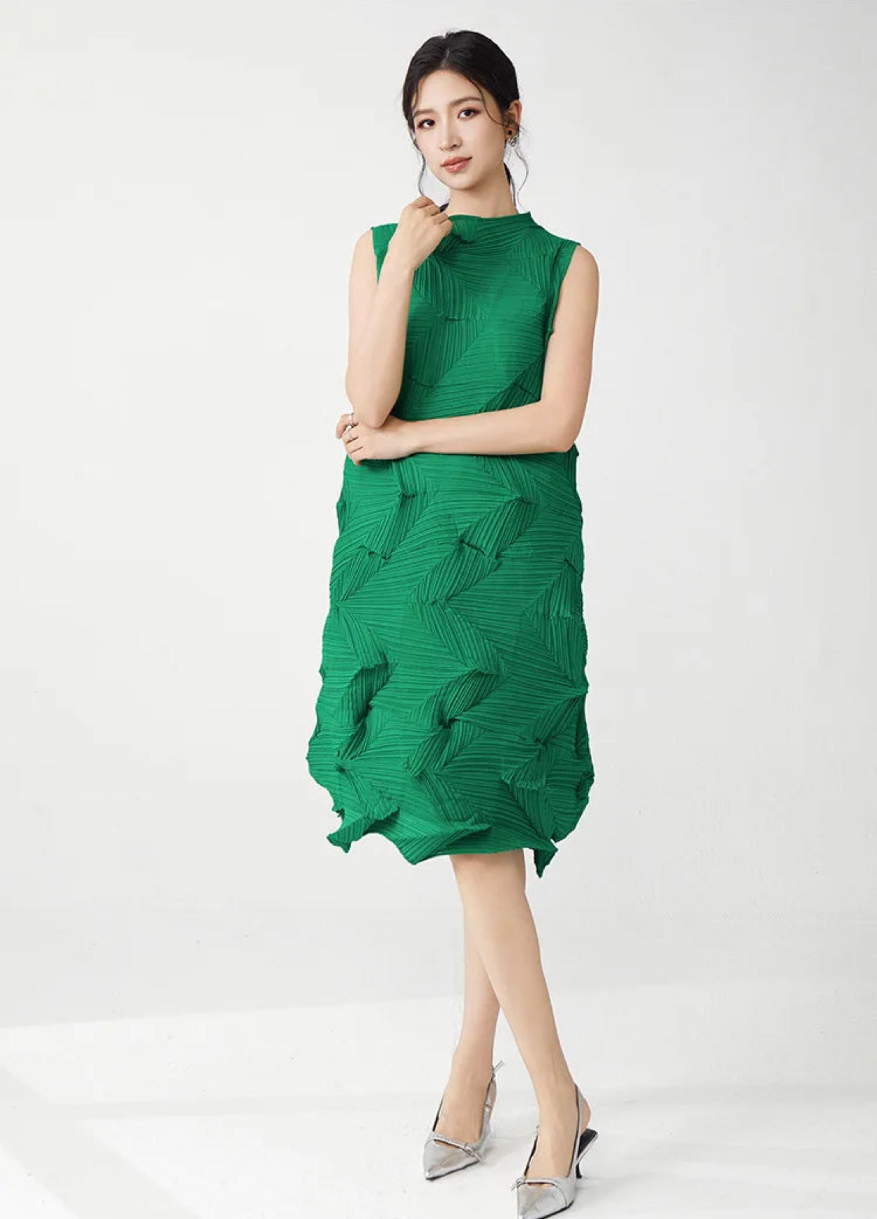 Perfect for cocktail parties, formal events, vacations, work wear, & special occasions, this Japanese plissé sleeveless above-knee dress features a geometric, multi-directional texture.