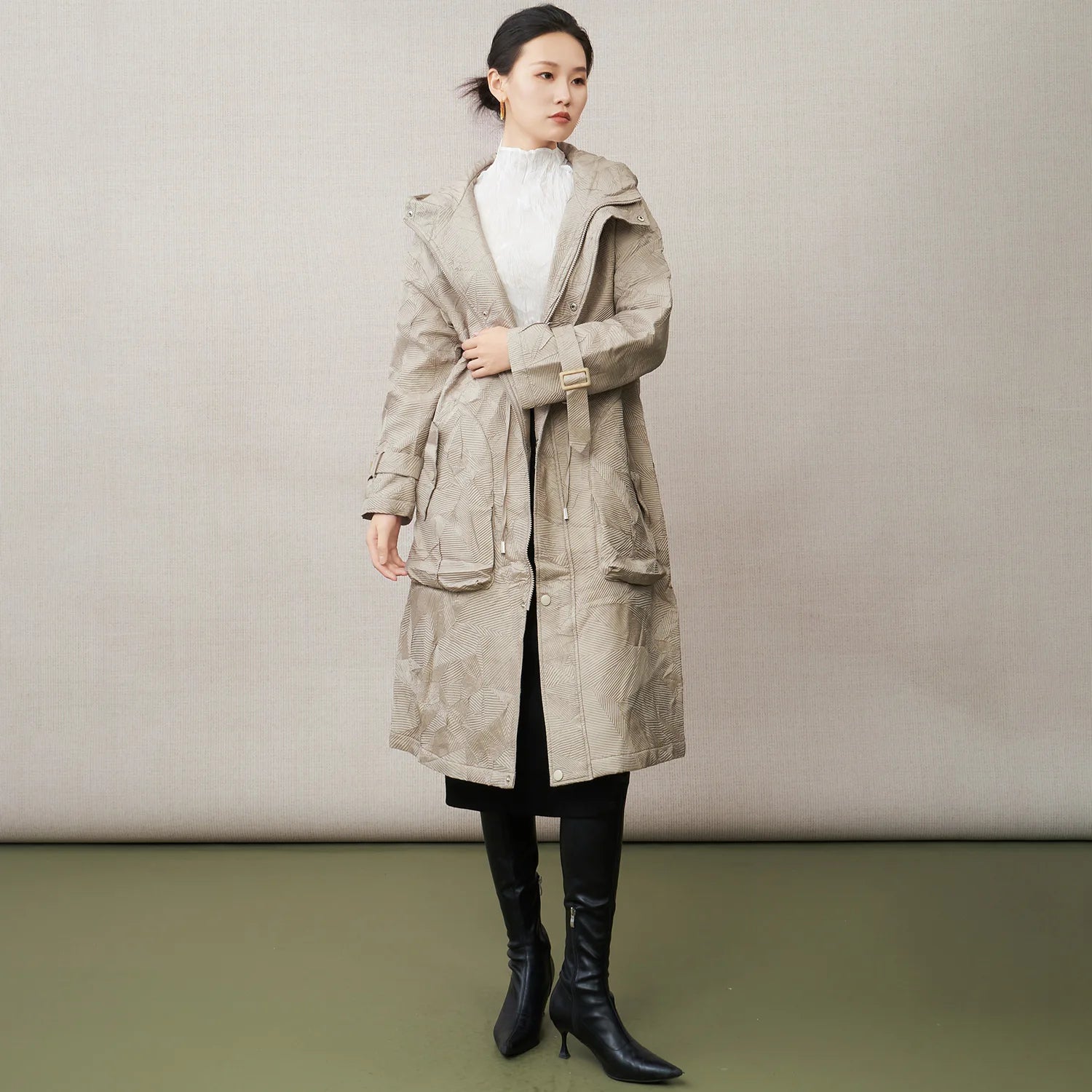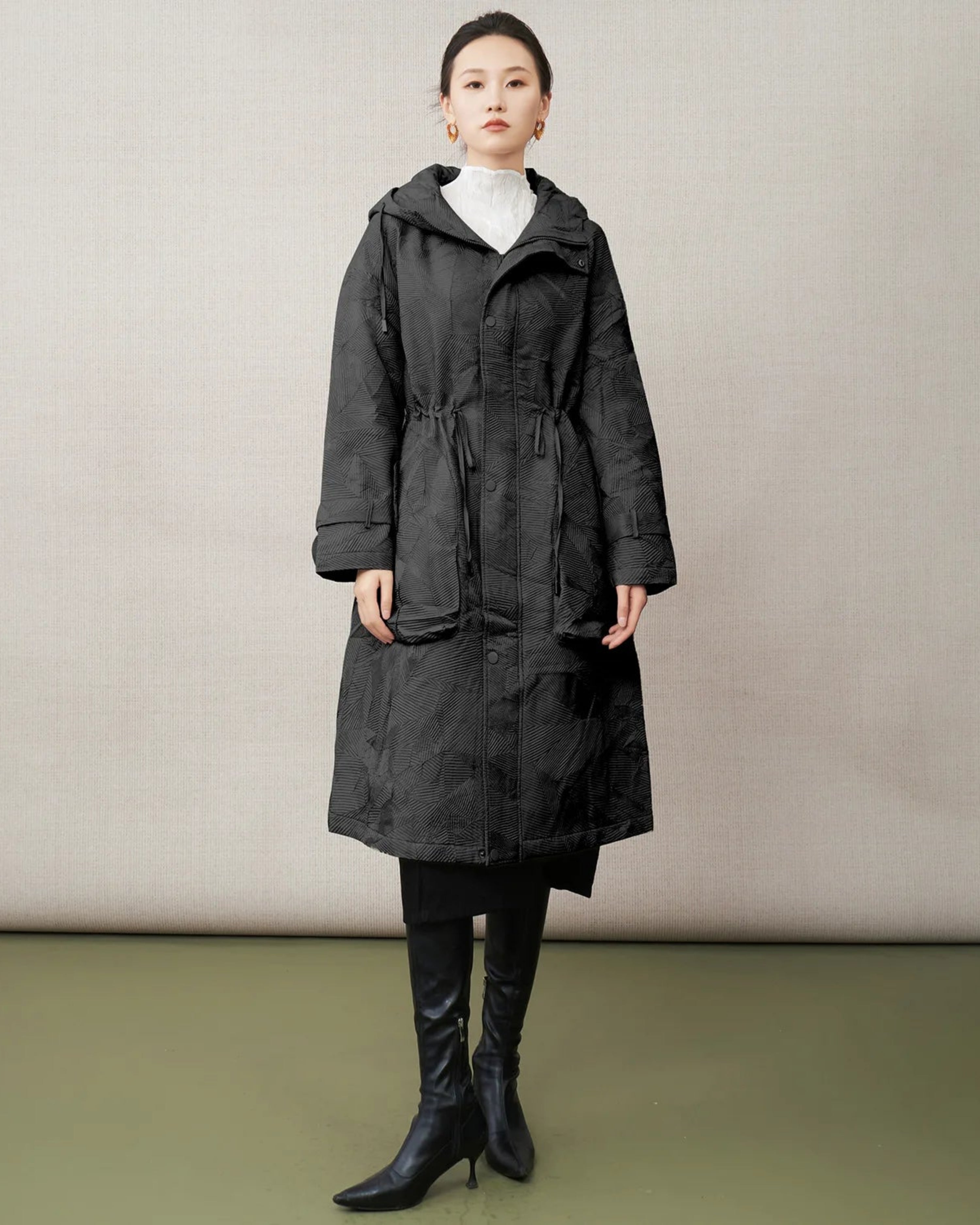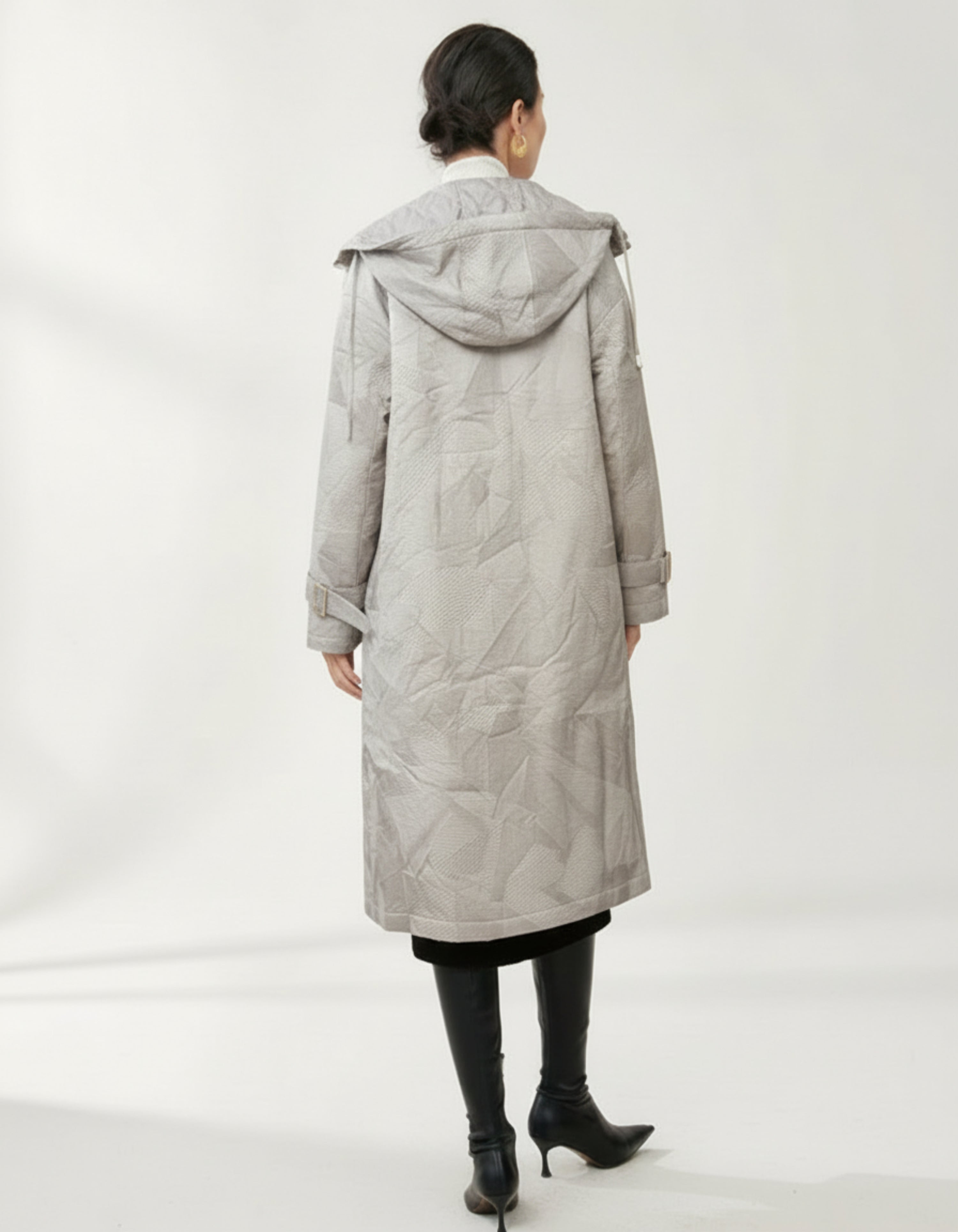 This longline coat is made from premium Japanese pleated cotton padded quilted fabric, featuring thick plissé quilting, a hood, and high neck for style and warmth.