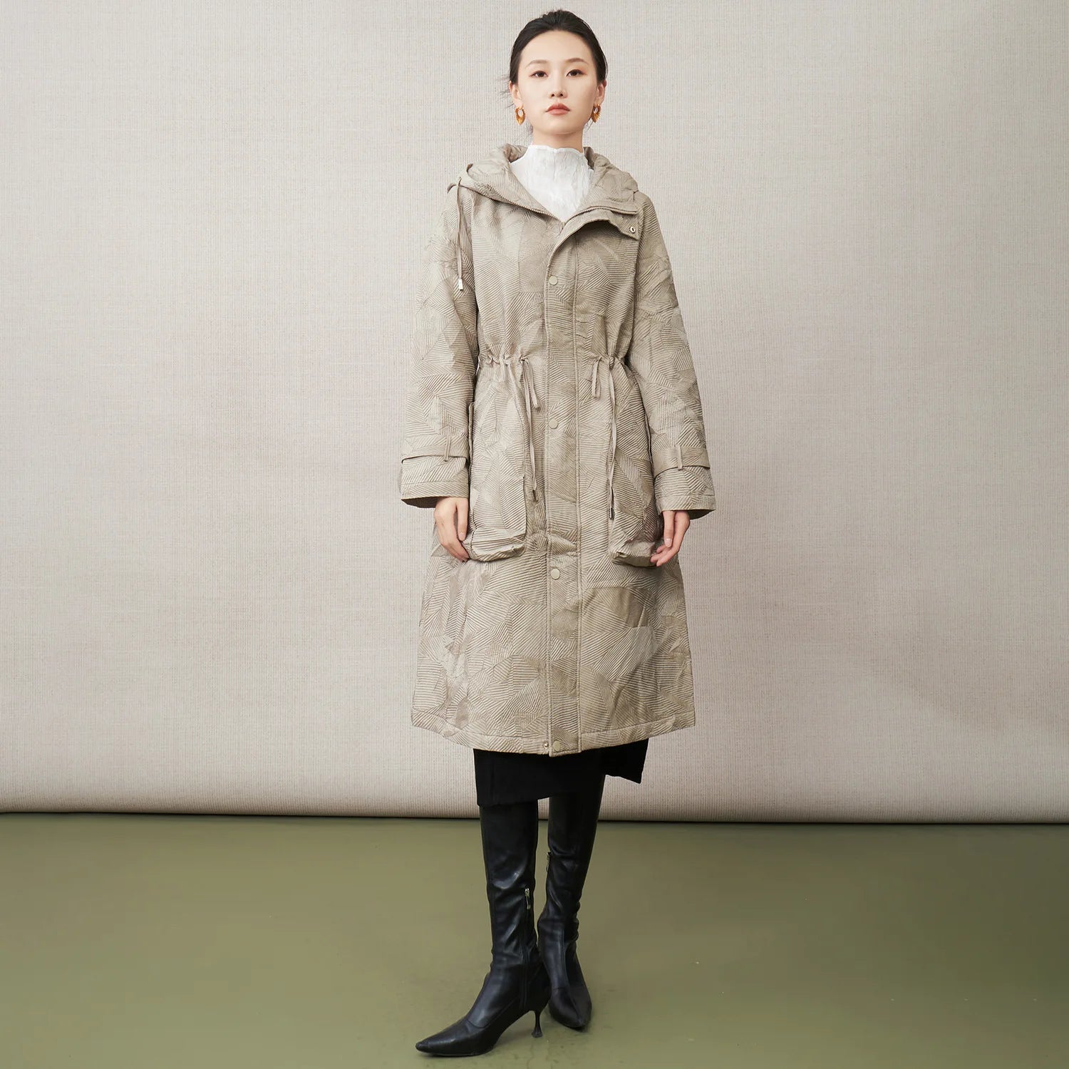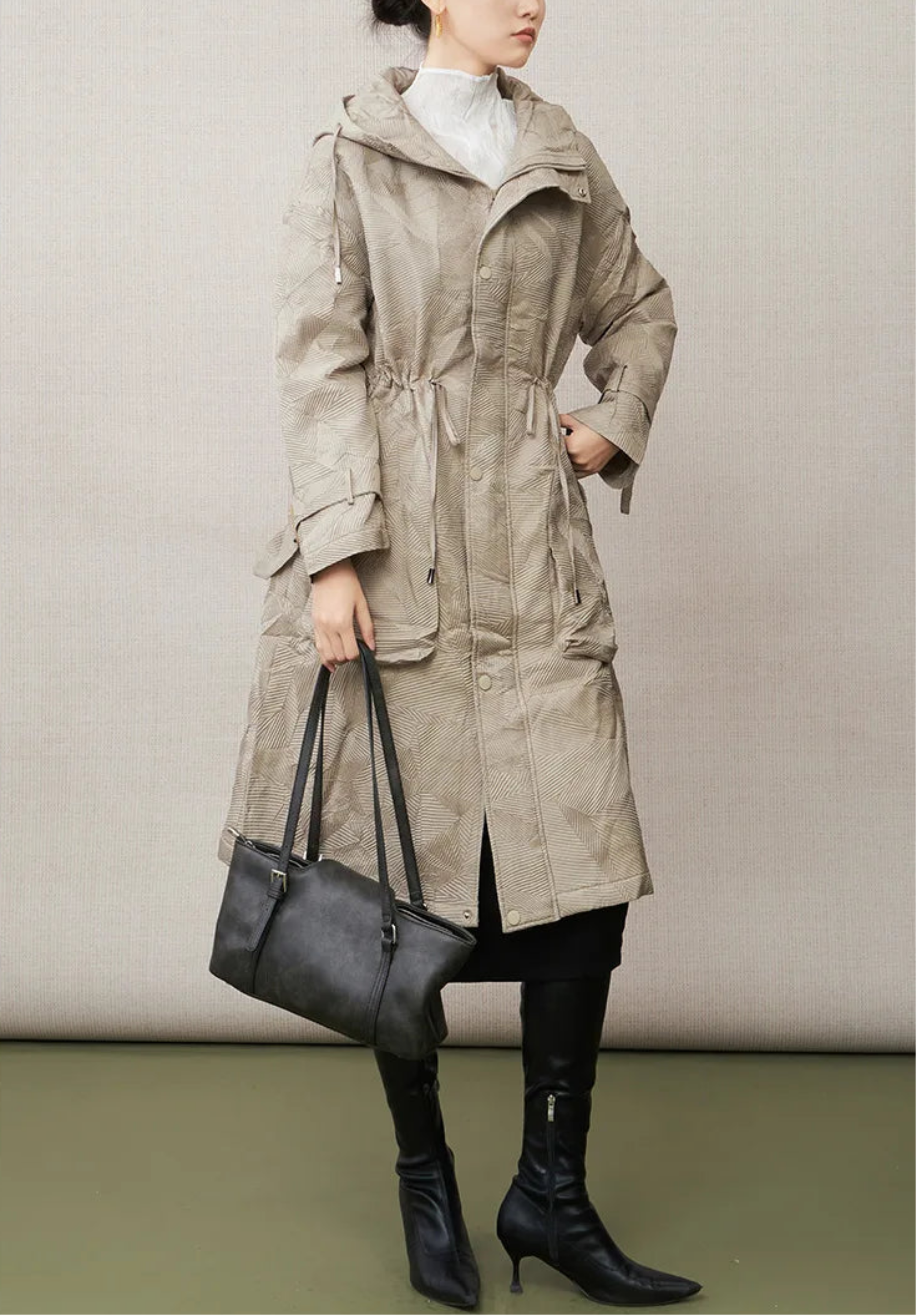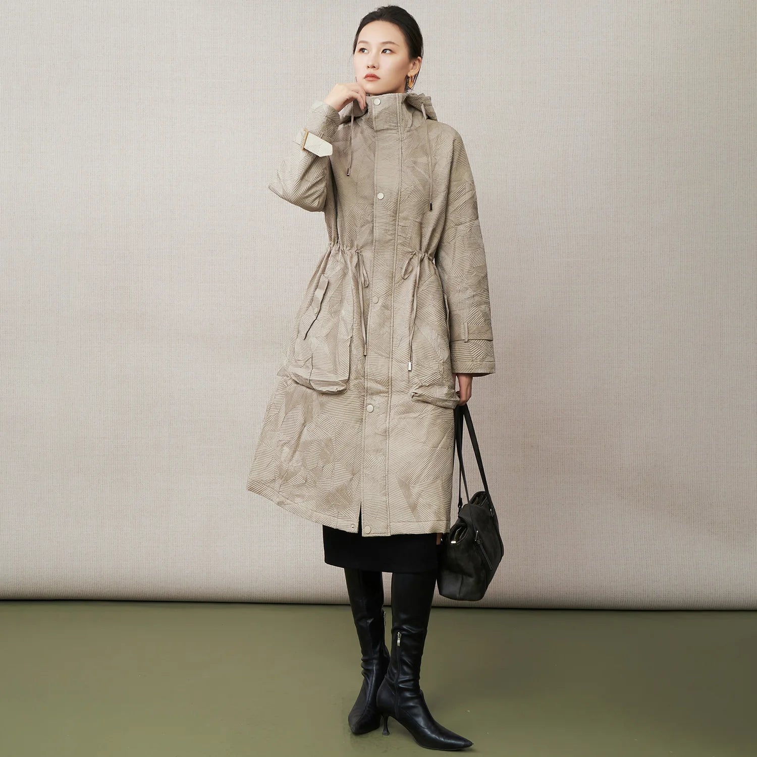This longline coat is made from premium Japanese pleated cotton padded quilted fabric, featuring thick plissé quilting, a hood, and high neck for style and warmth.