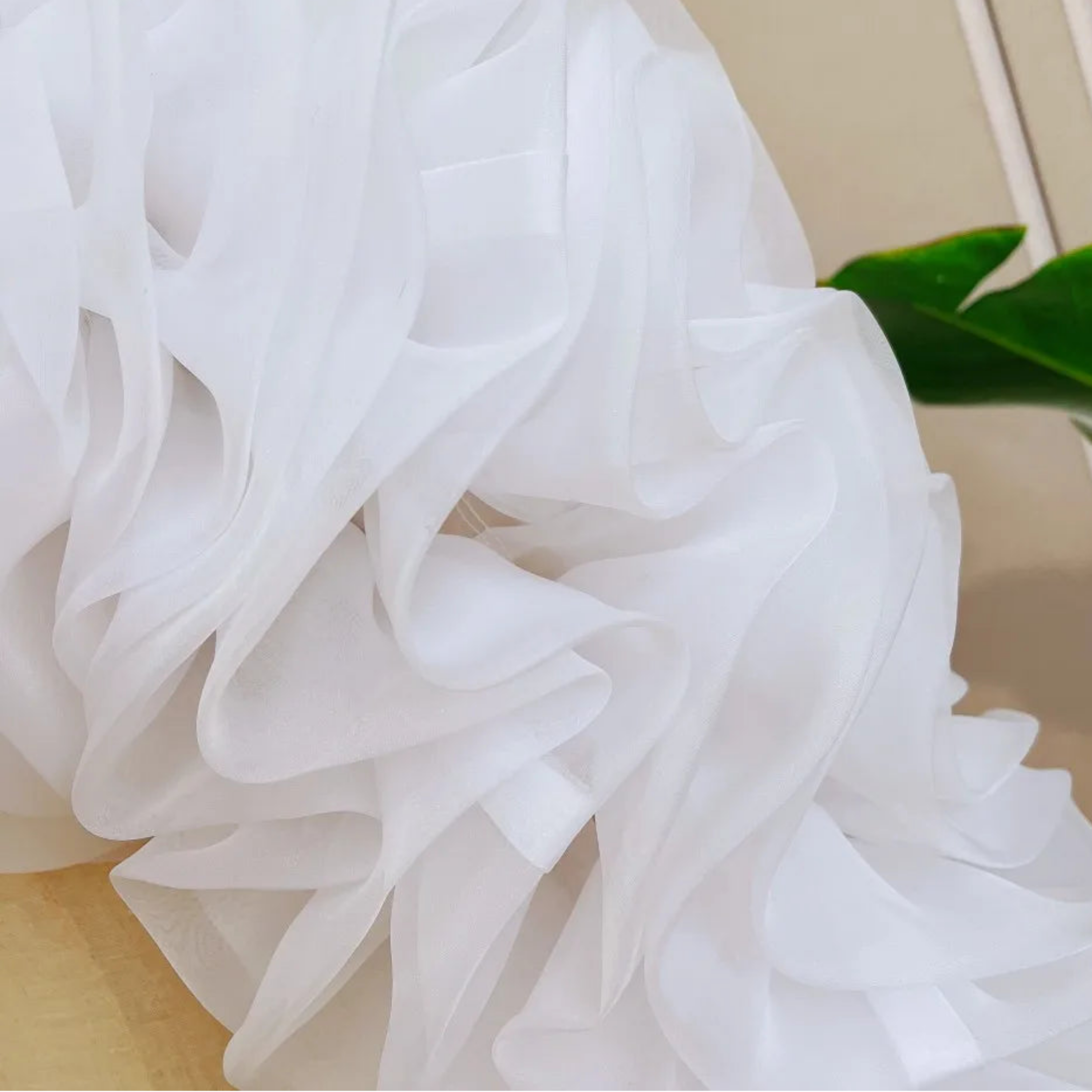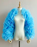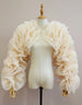Meet your statement evening jacket of the season. This designer bolero features a unique, elegant, and luxurious silhouette with voluminous tulle ruffles and a full-sleeve arm wrap.