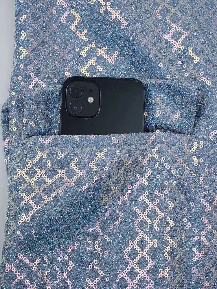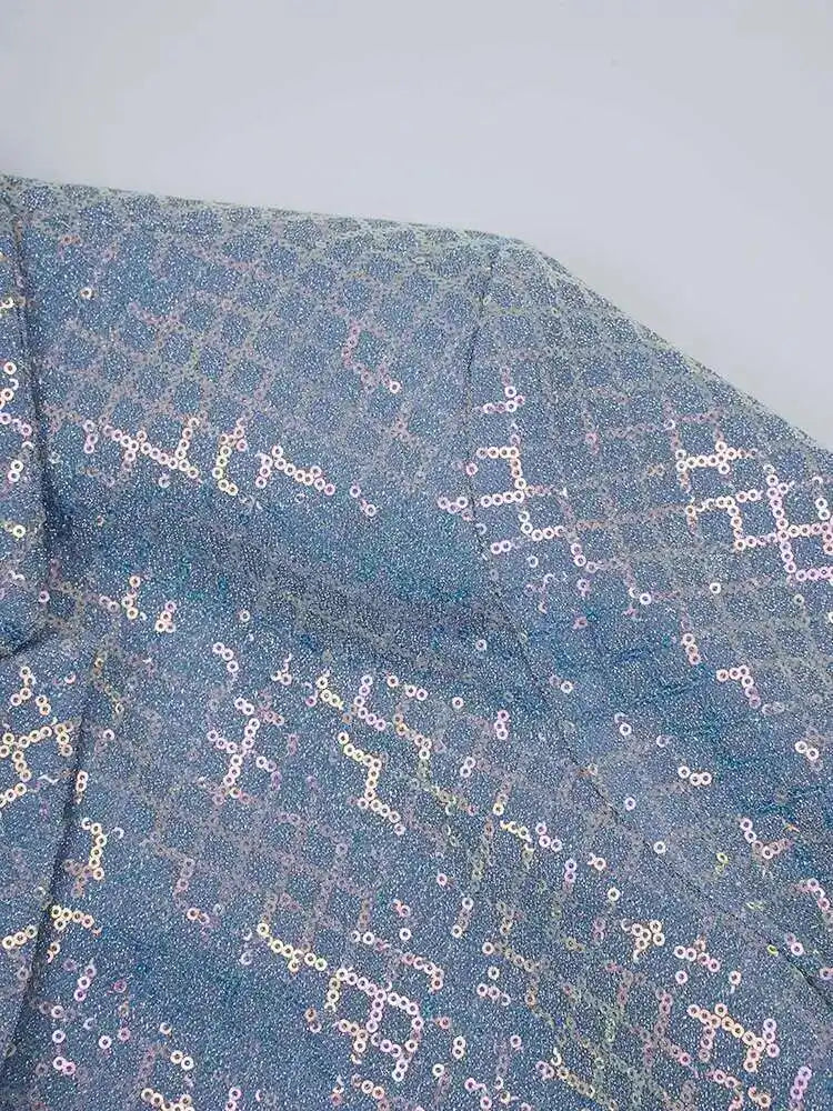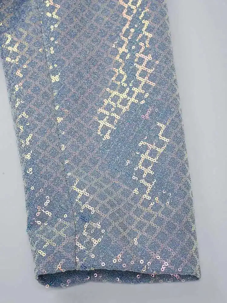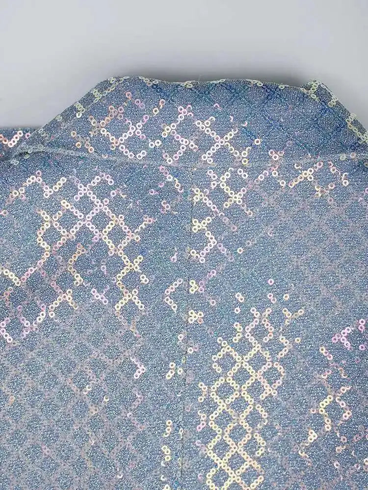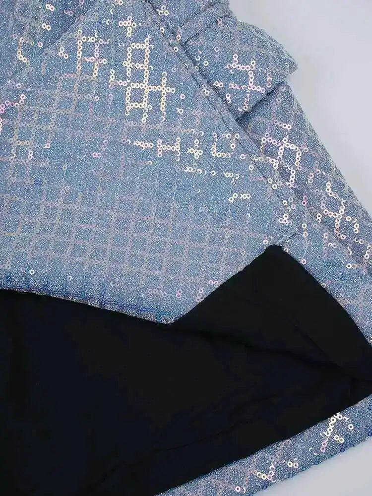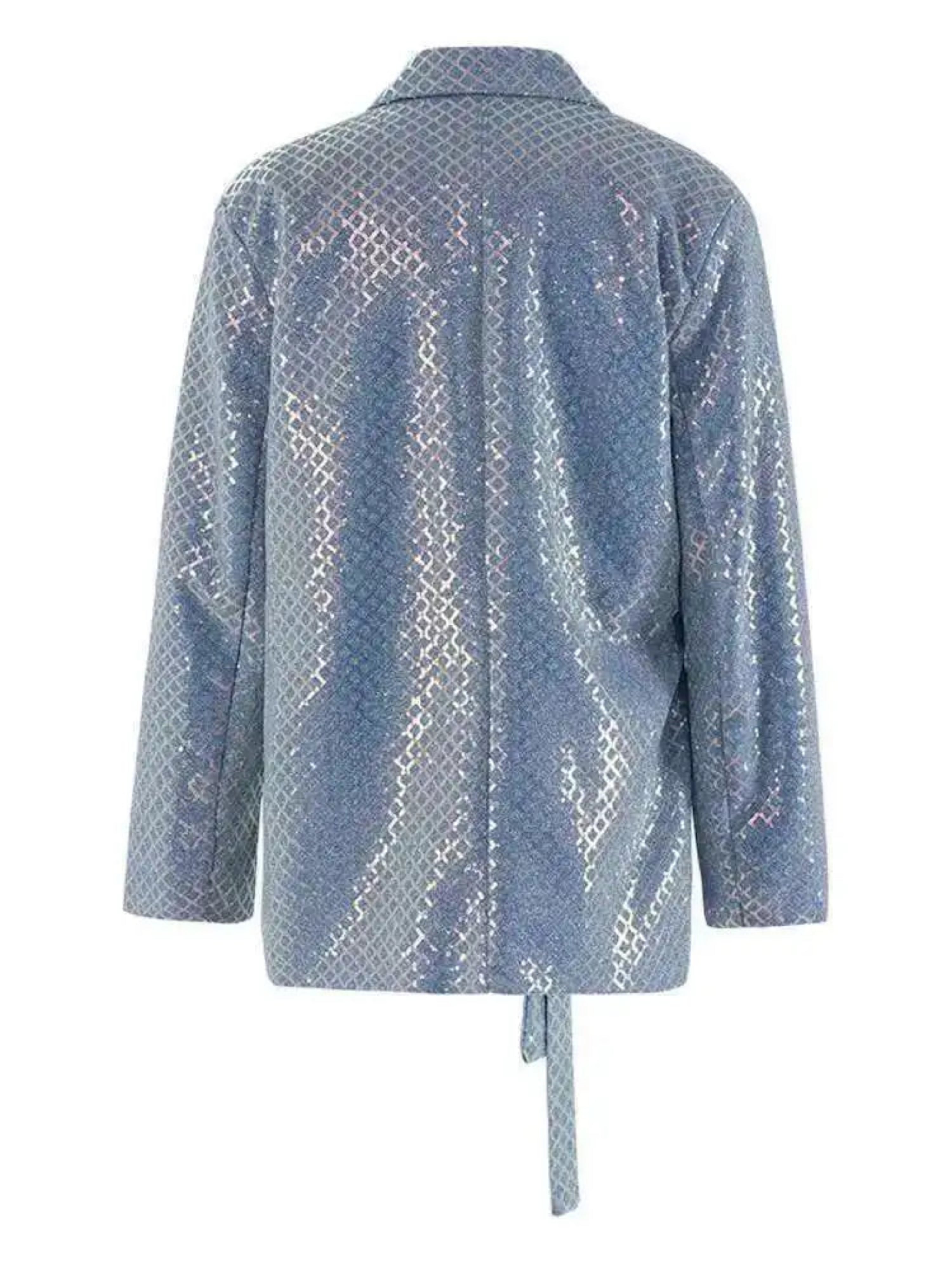 This luxurious wrap blazer features a shimmering geometric sequined texture with an oversized silhouette and wrap-style design. Its bold, sophisticated cut makes it perfect for formal events, business, workwear or elevated everyday wear.