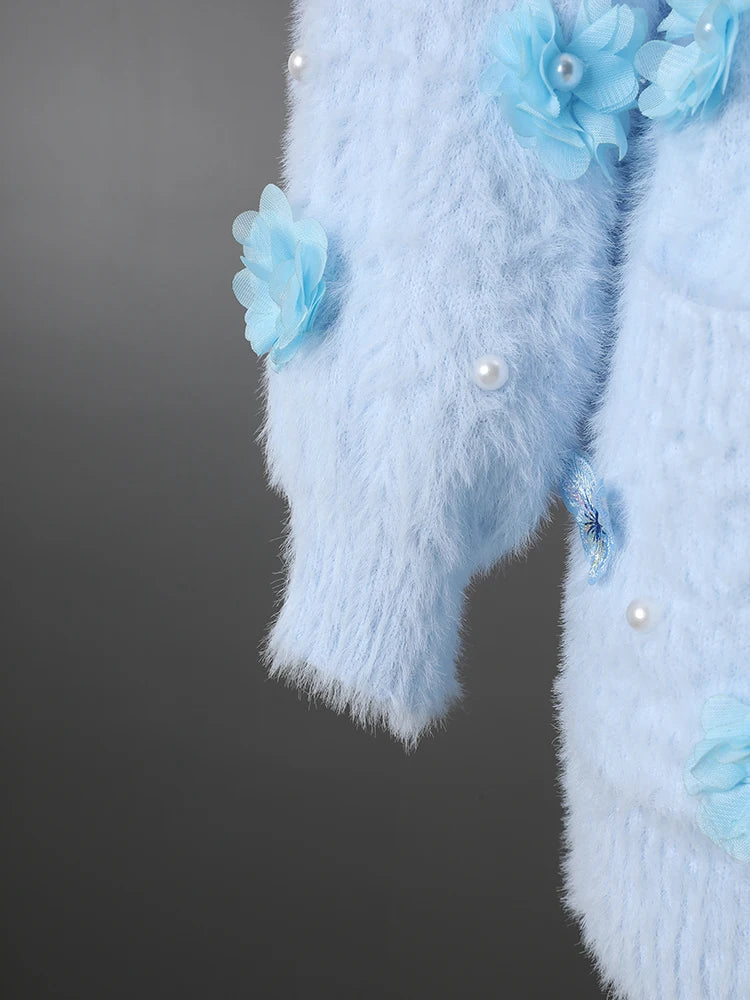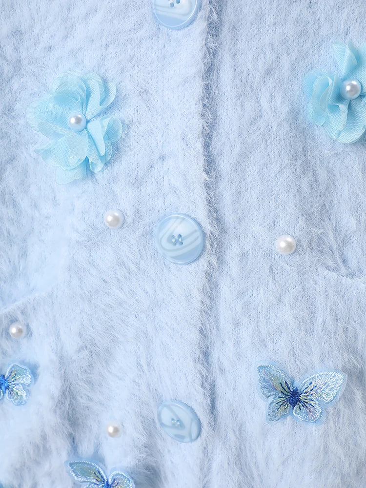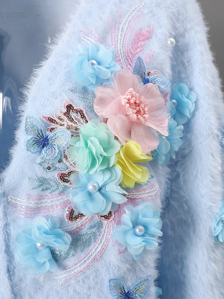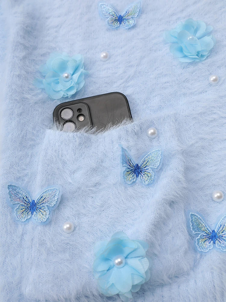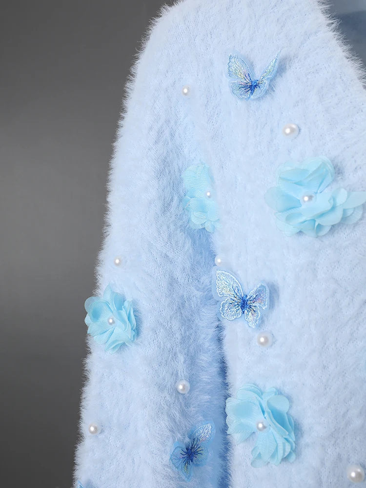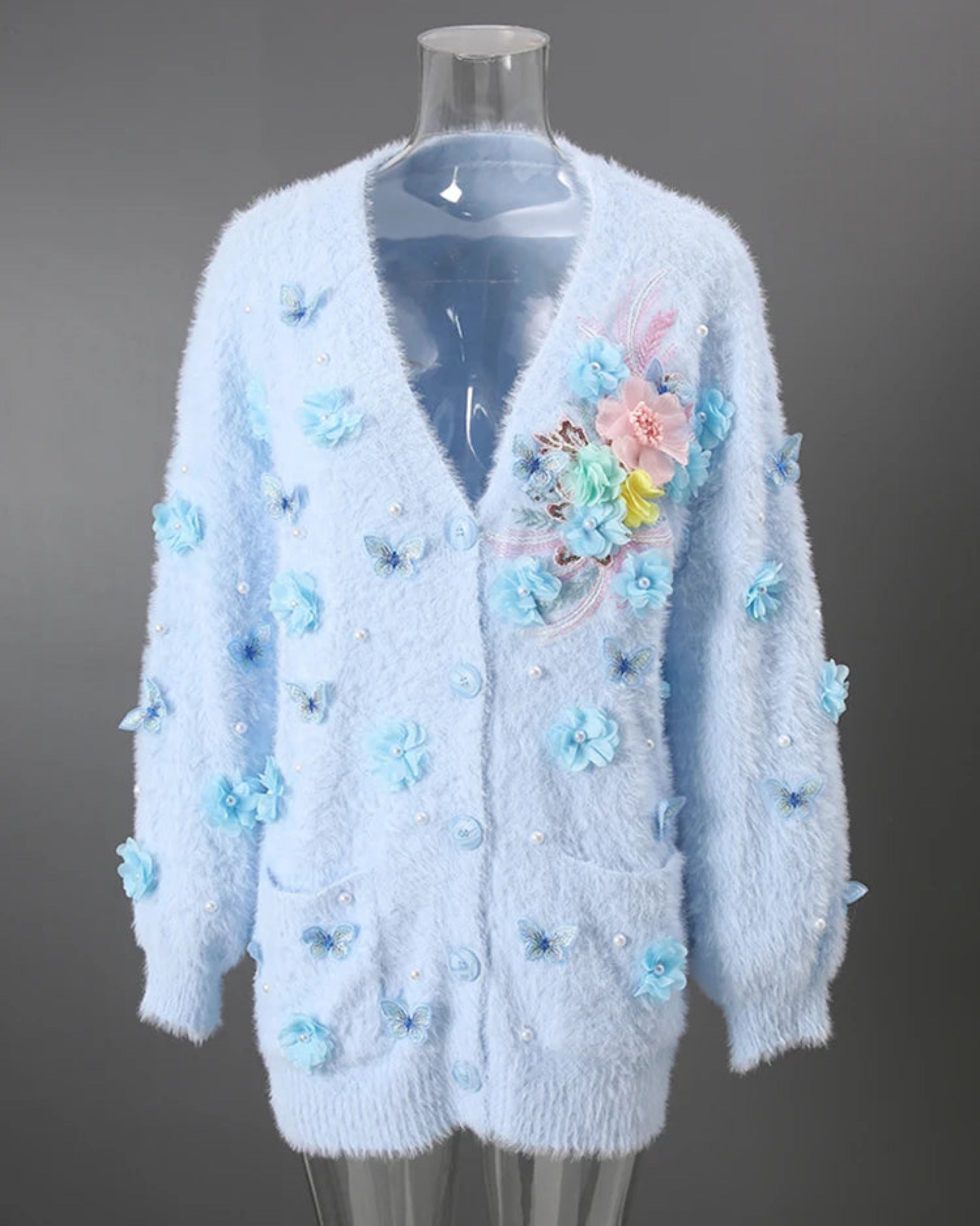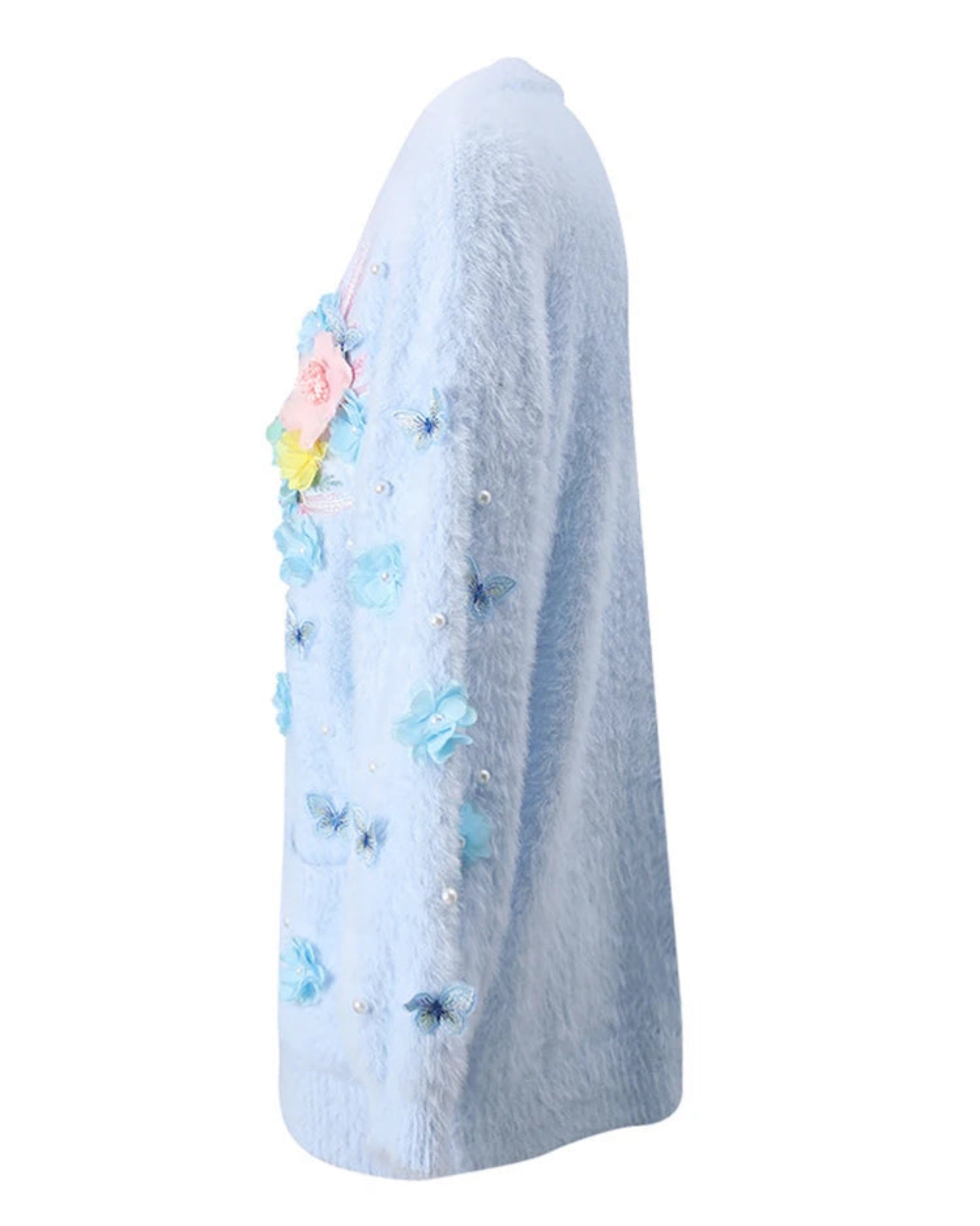 This unique oversized cardigan features sculptural 3D butterfly and floral embellishments that transform a premium knit sweater into a statement piece.