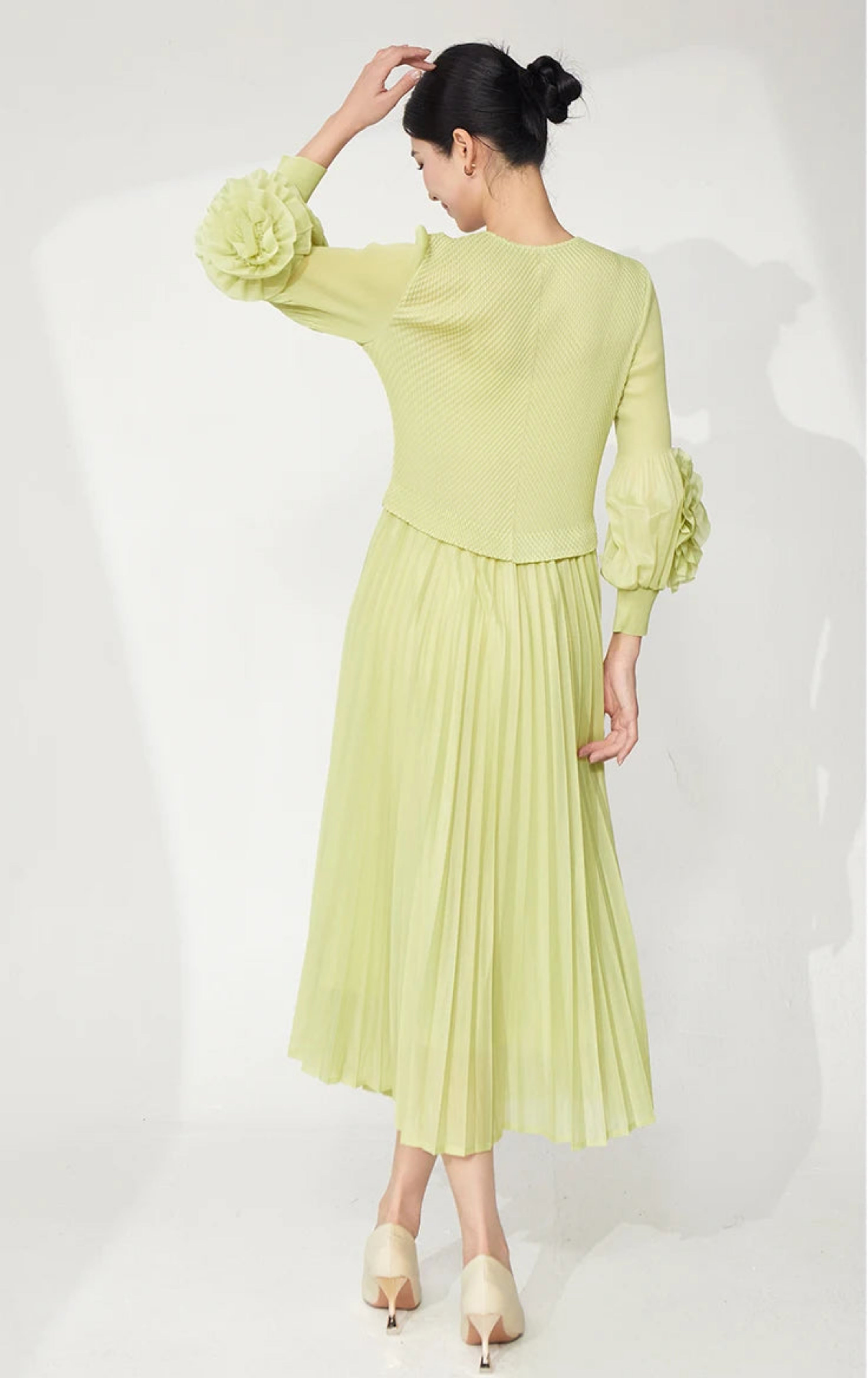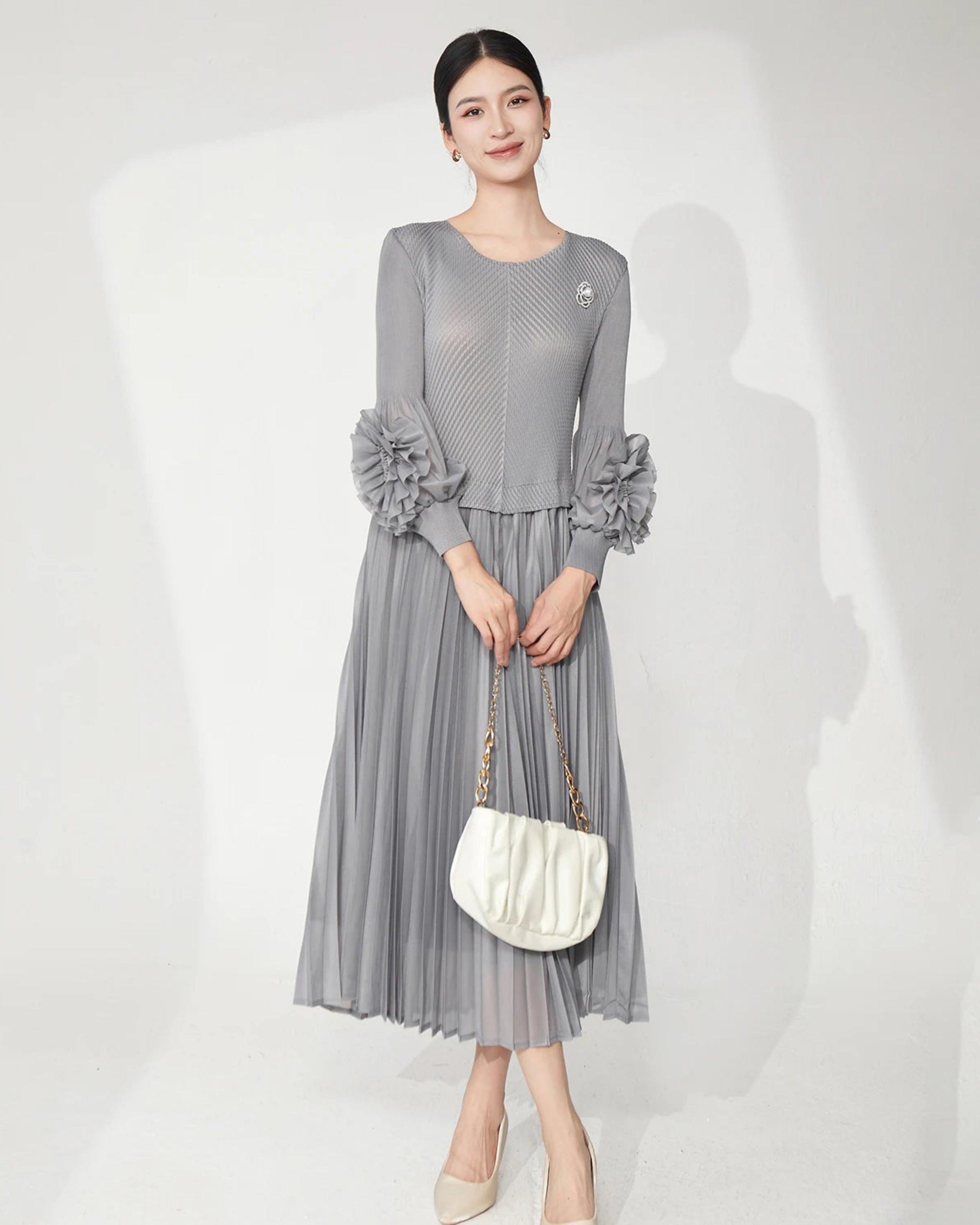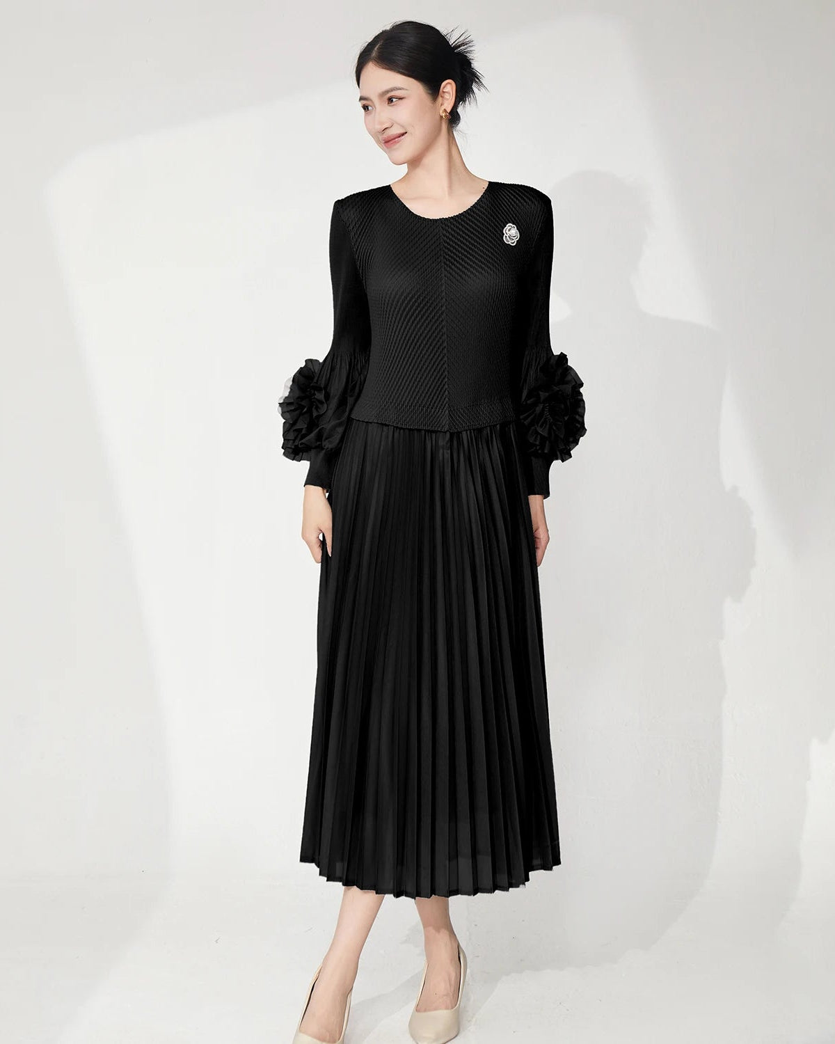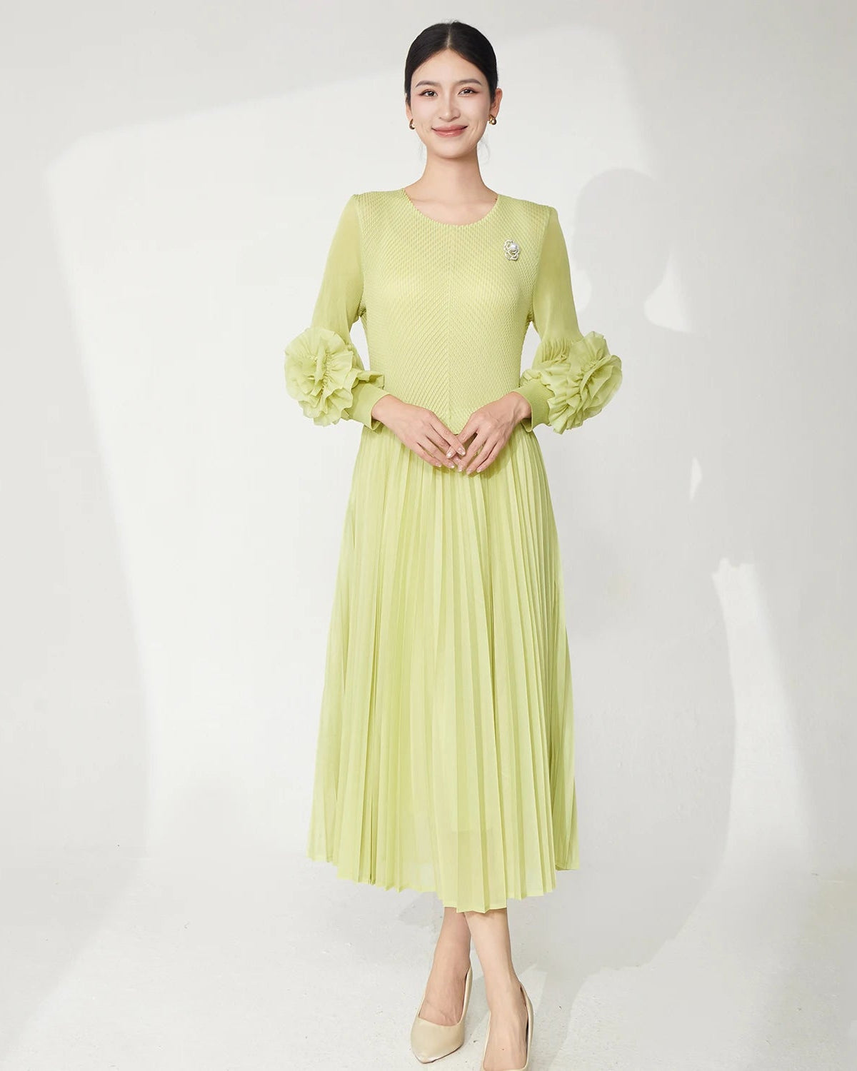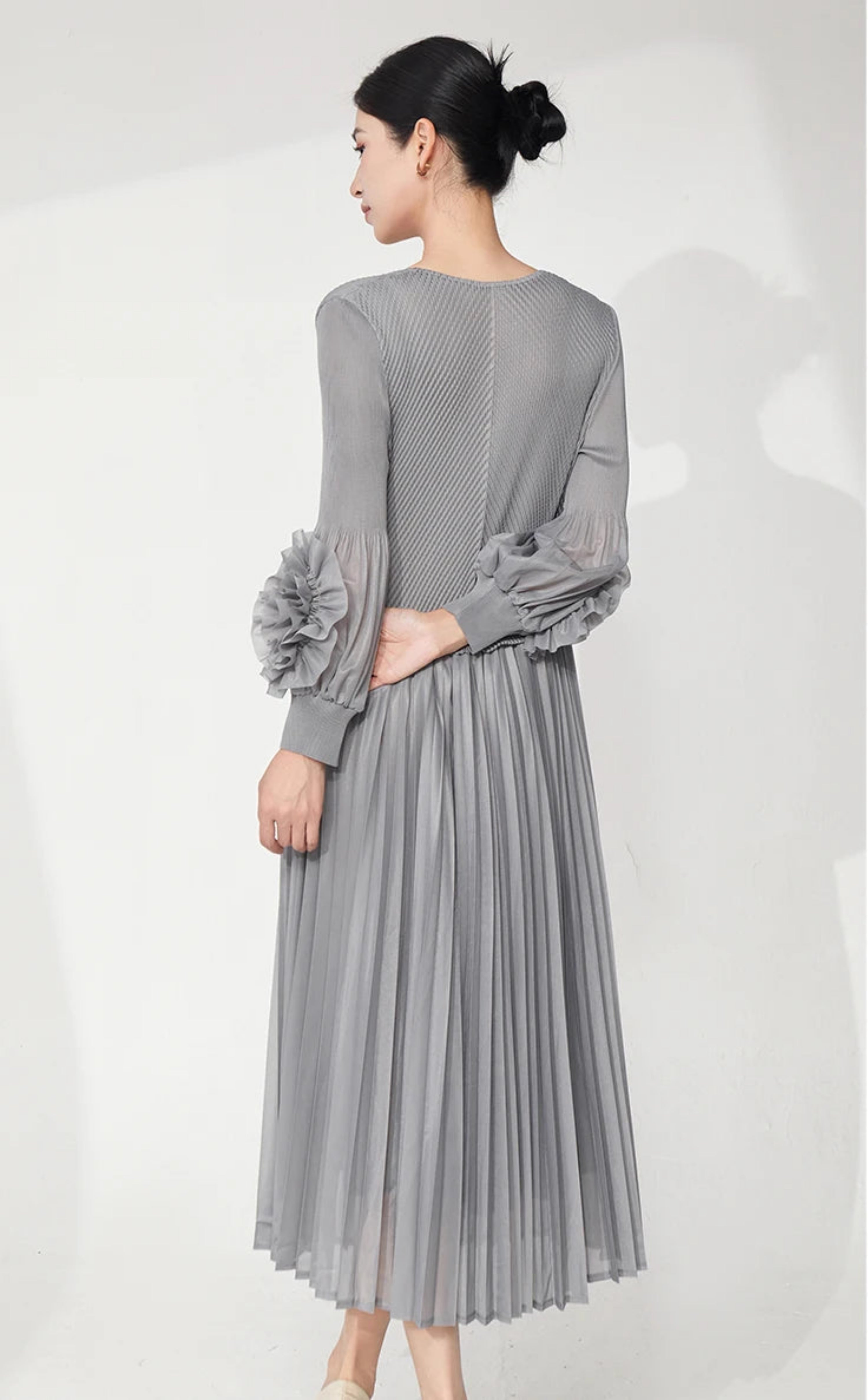 Elegant Japanese pleated midi dress featuring the newest plissé ribbed texture with delicate ruffle-trim sleeves.