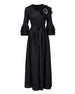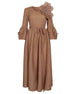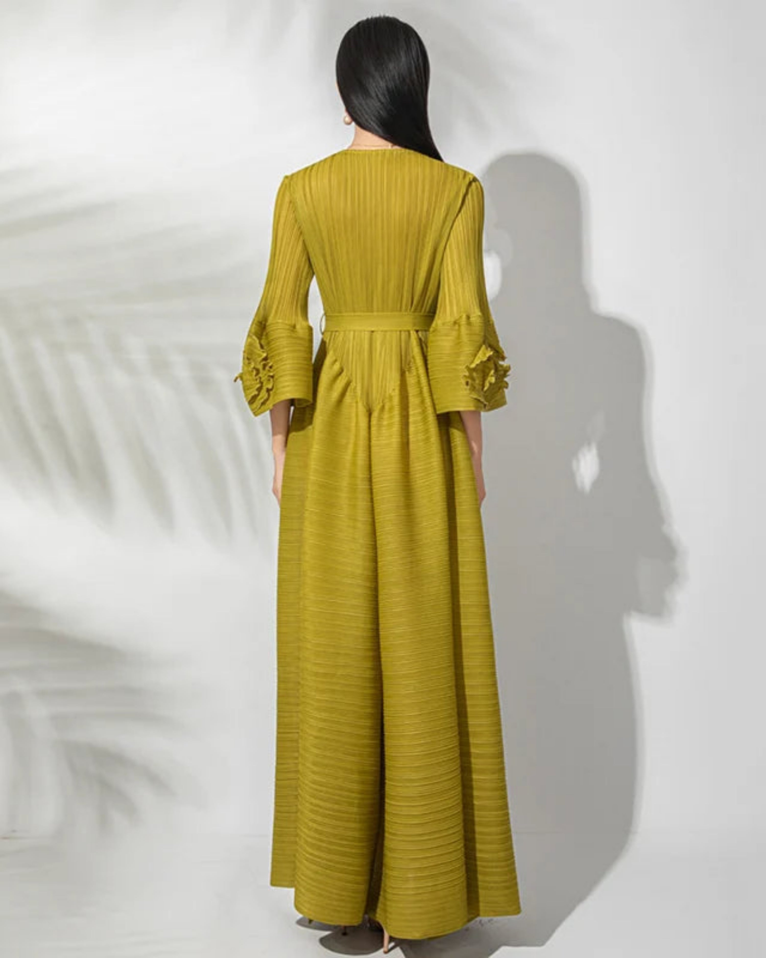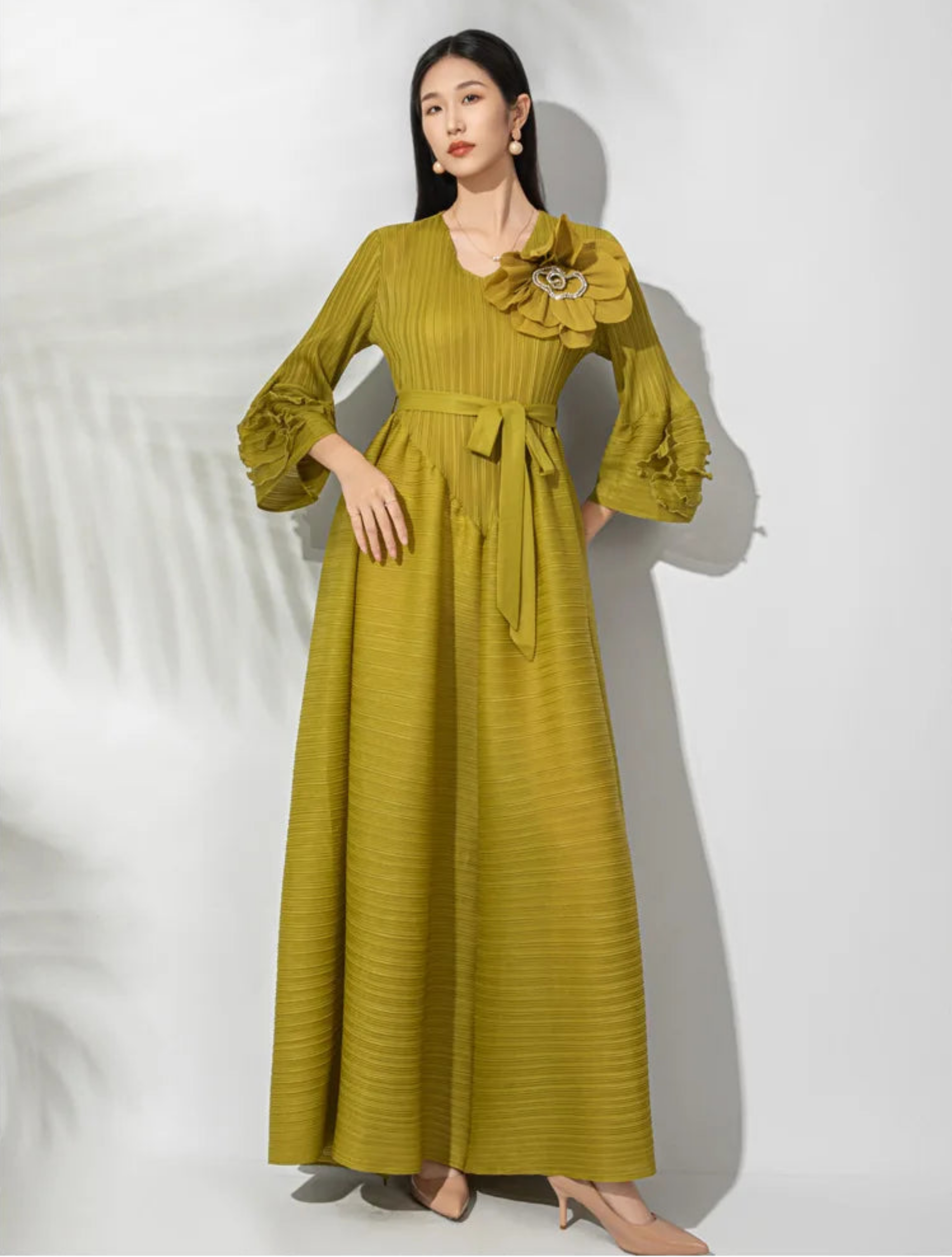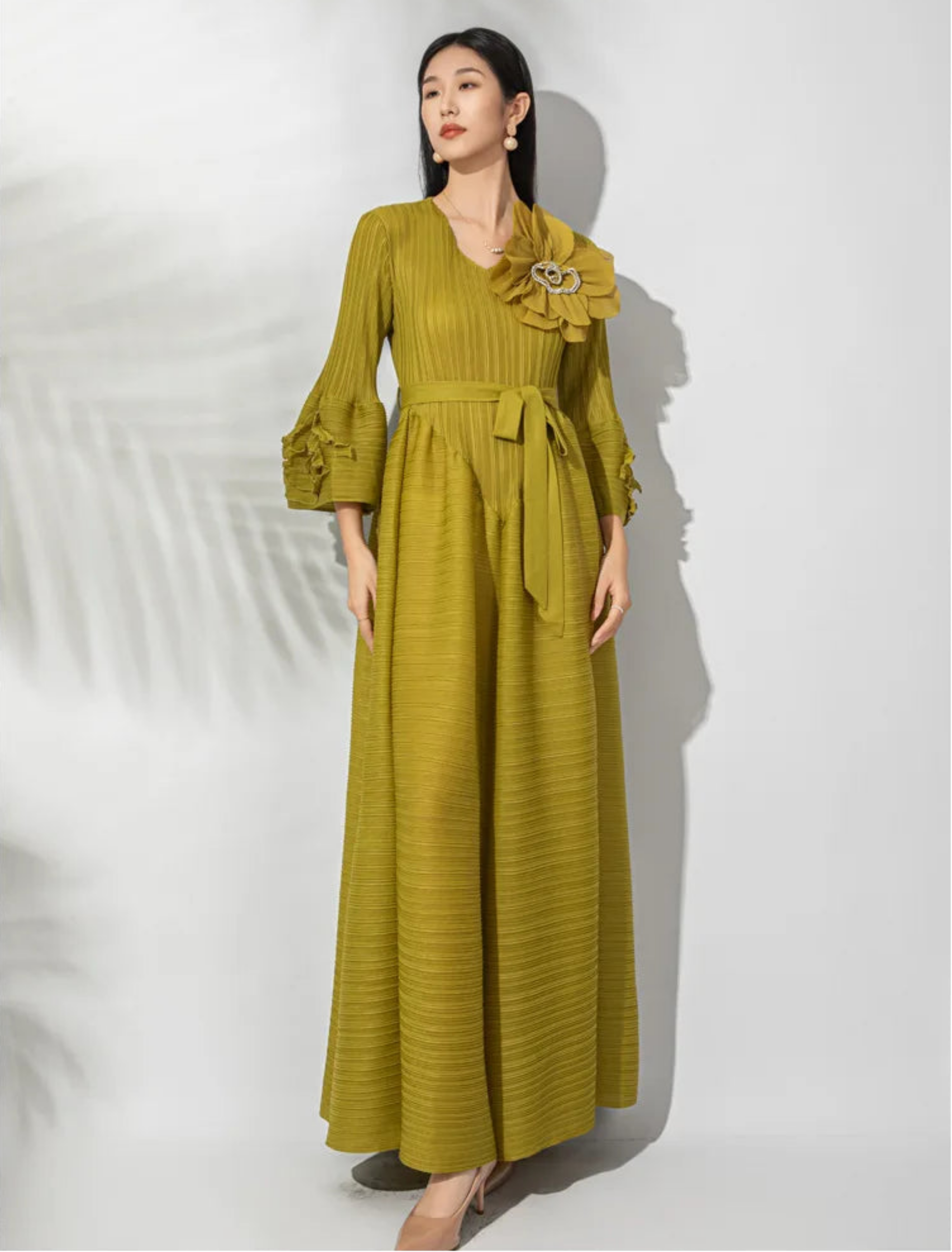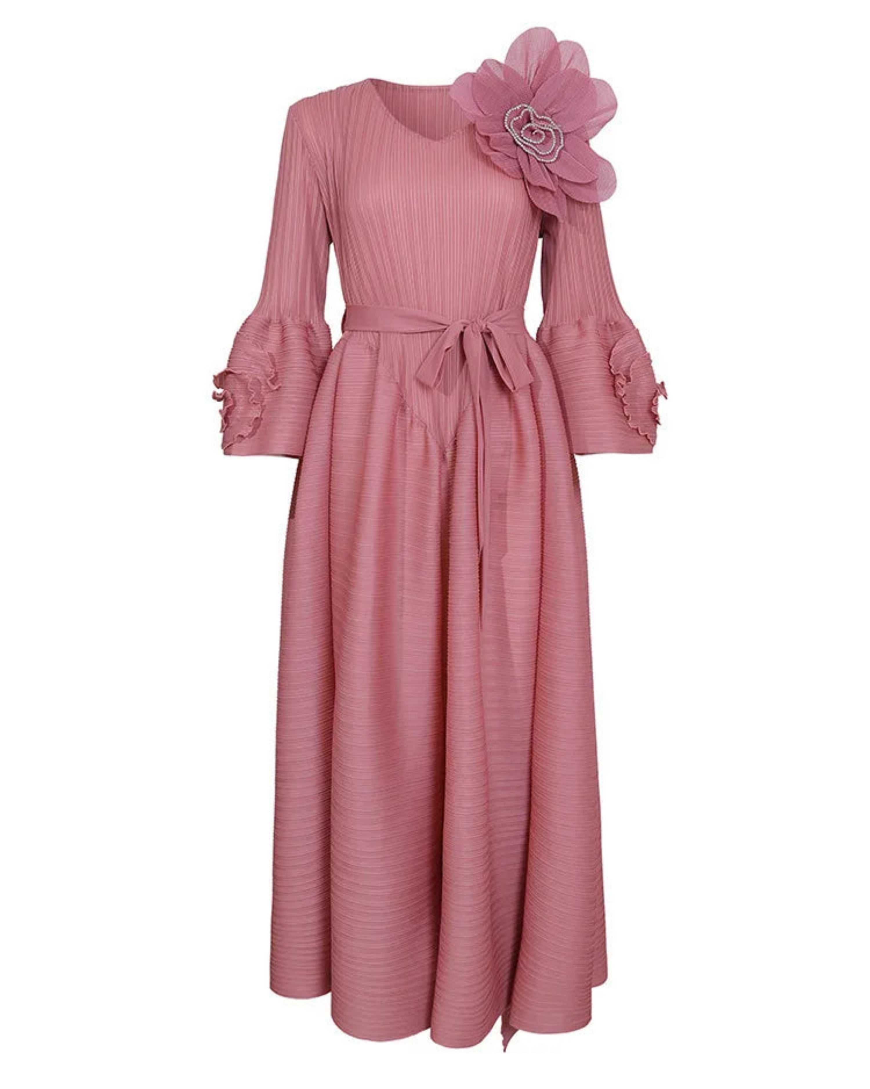This gorgeous, luxurious midi dress features Japanese micro-pleated fabric with ruffle floral bell sleeves and intricate 3D flower appliqué with a sparkling center on the upper bodice