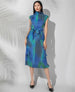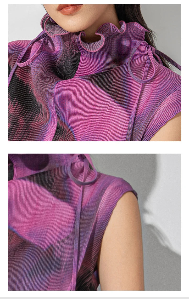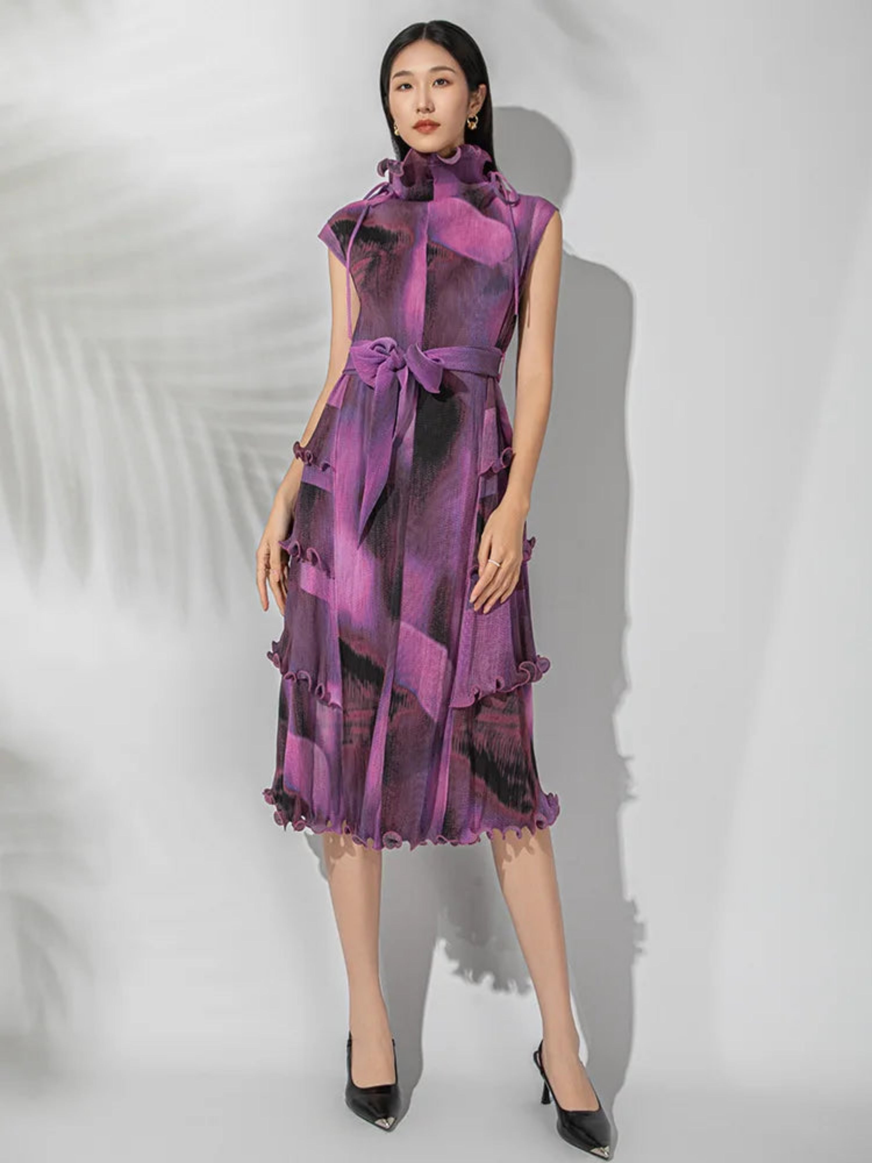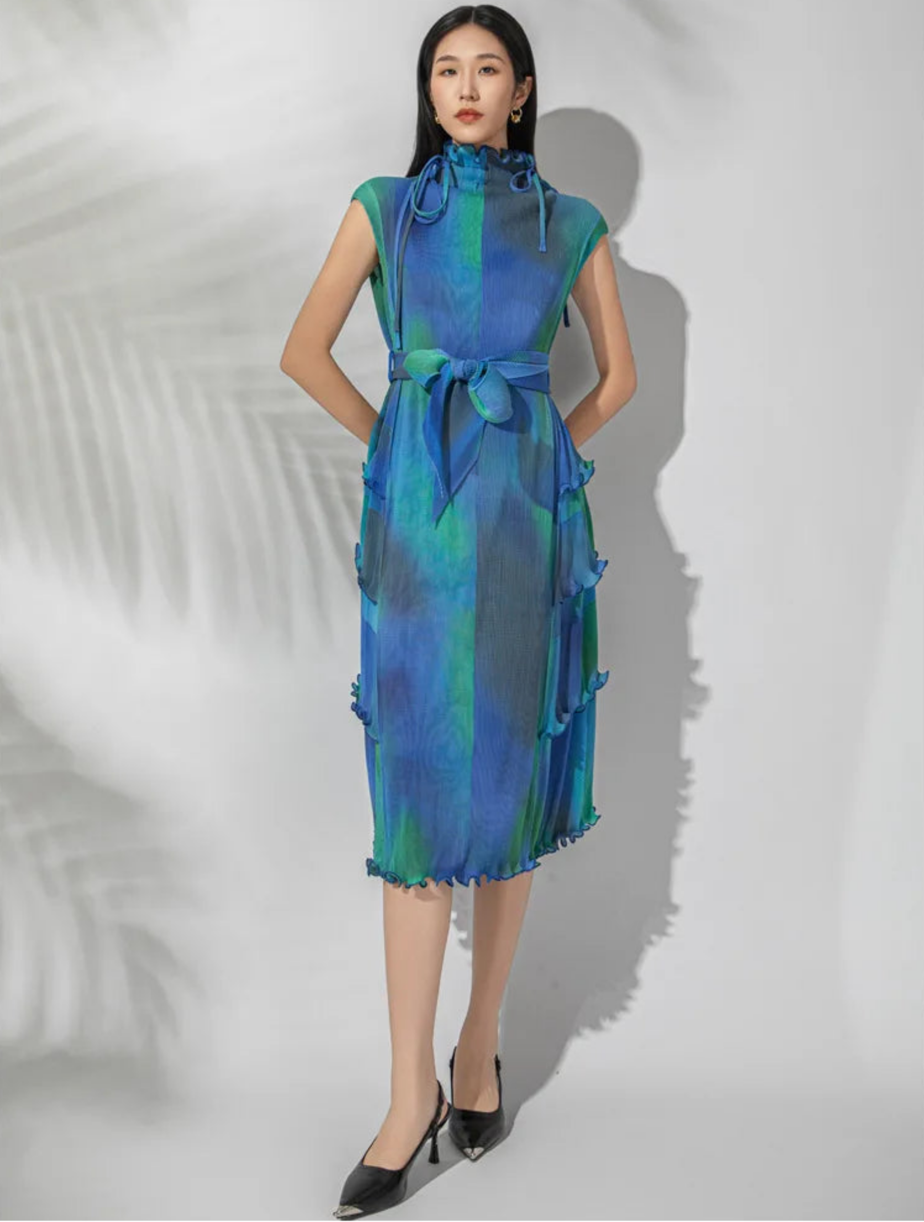 This elegant Japanese micro-pleated tiered plissé midi dress features all-over micro-pleating, a clean high neckline, soft cap sleeves, and a flowing tiered hem.