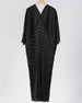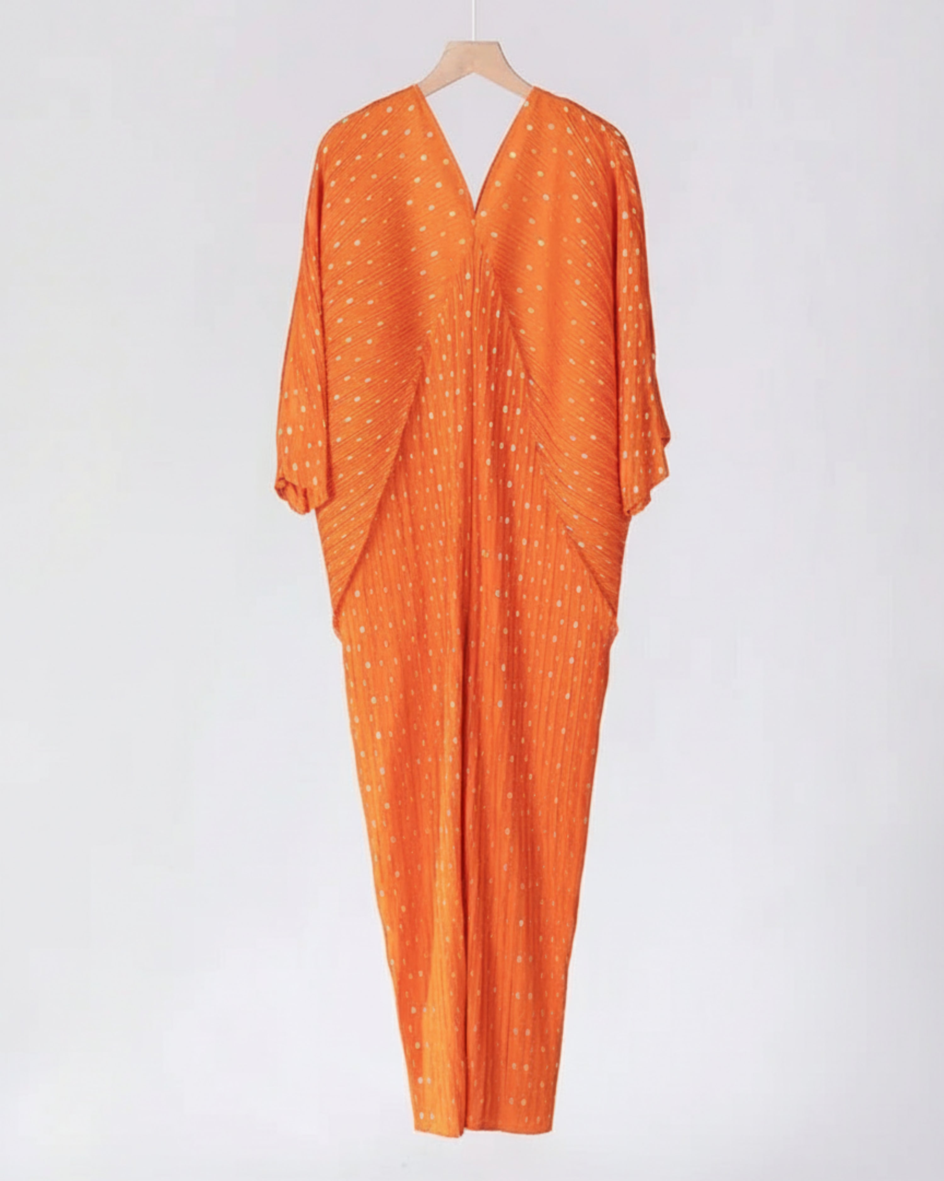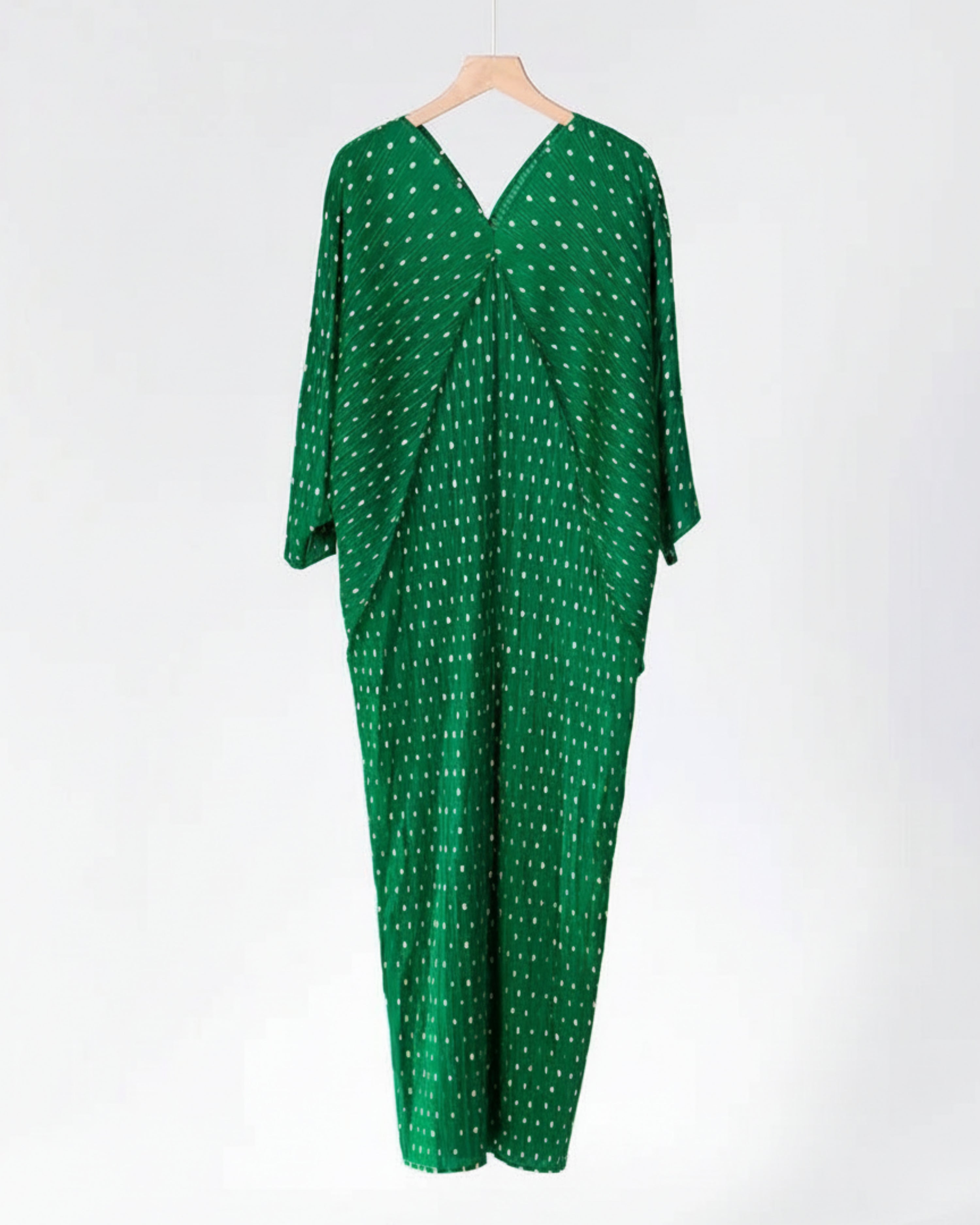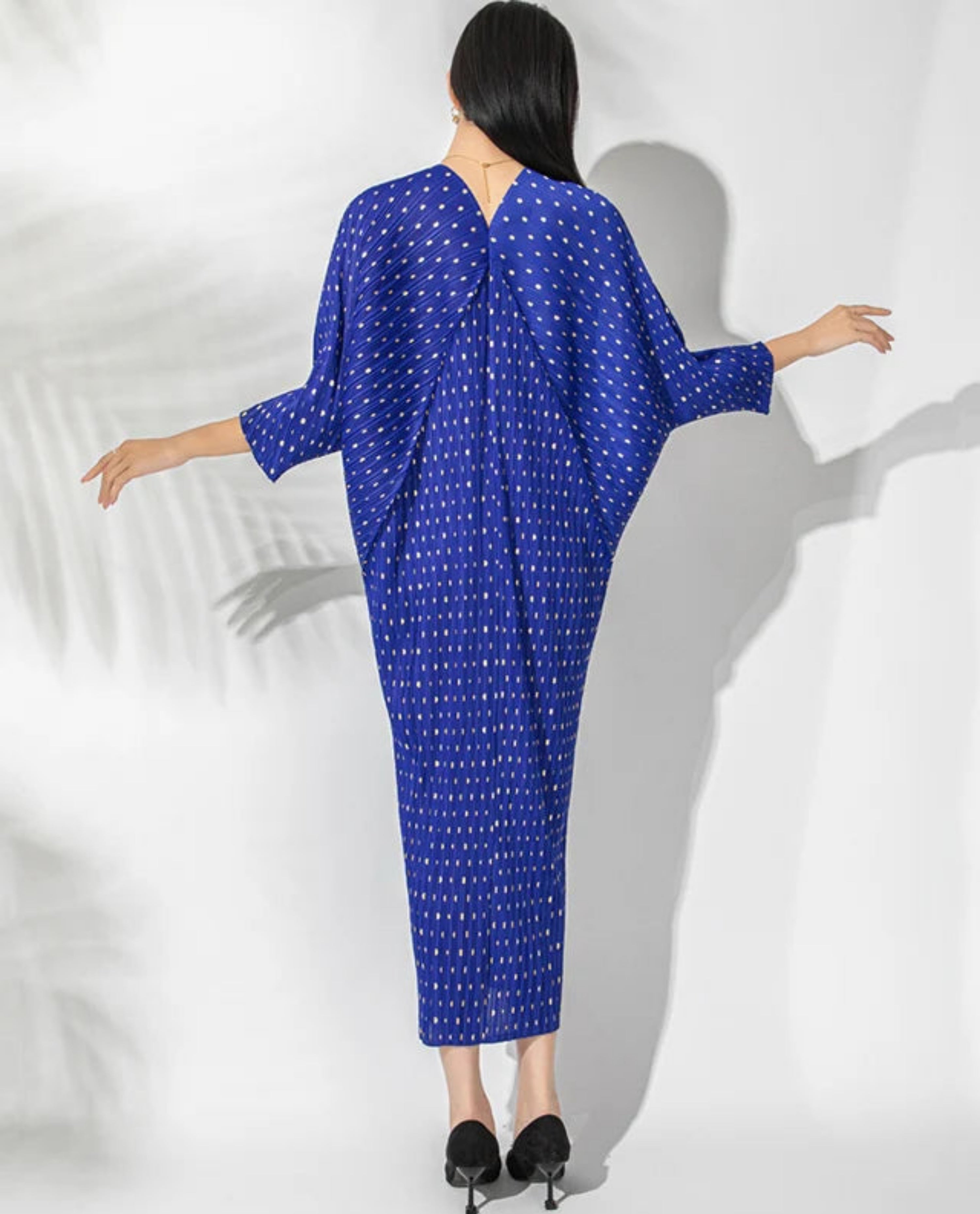 This elegant Japanese plissé micro-dot midi dress features a soft V-neckline, three-quarter dolman sleeves, and fluid pleating that creates a modern, polished silhouette.