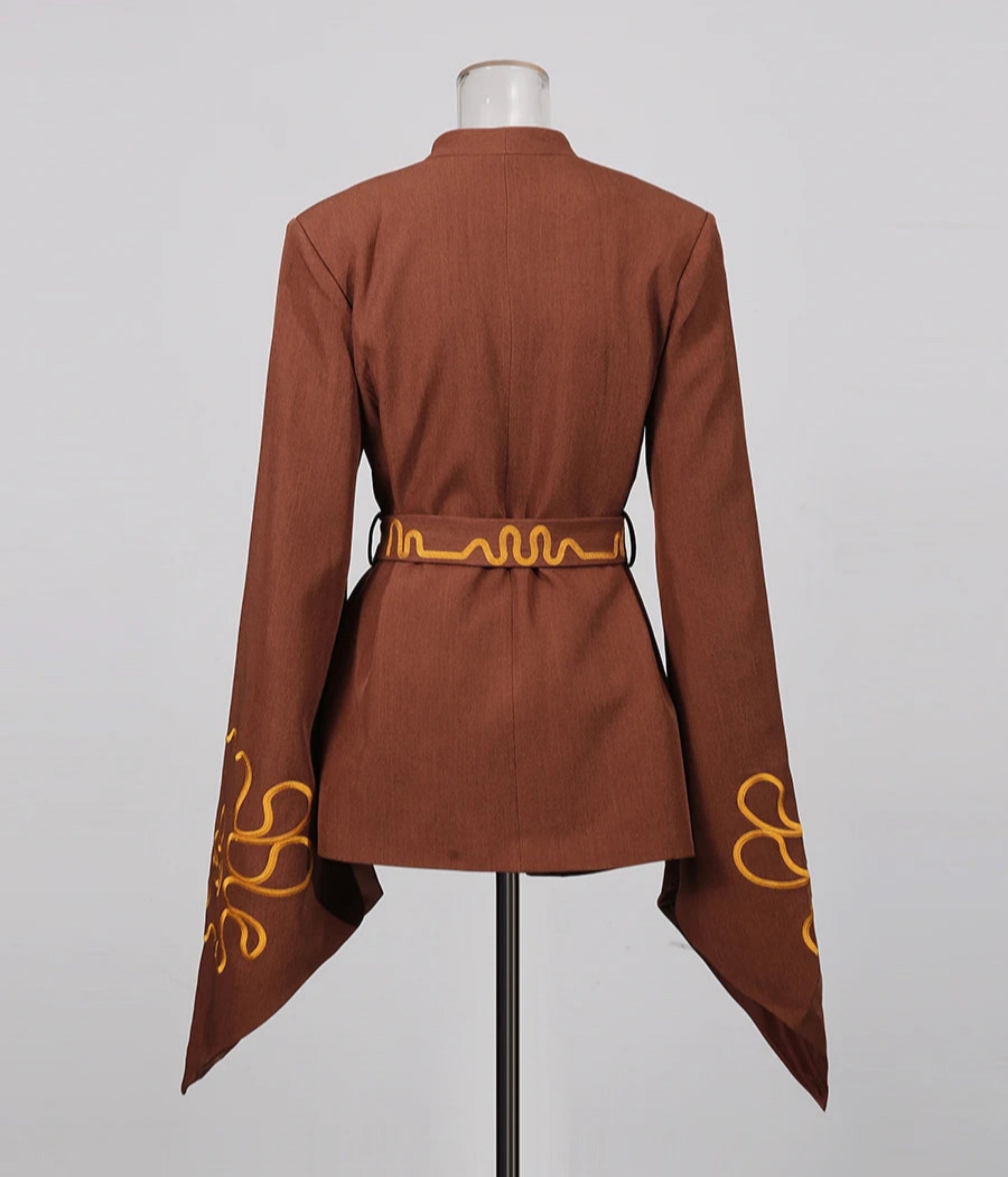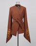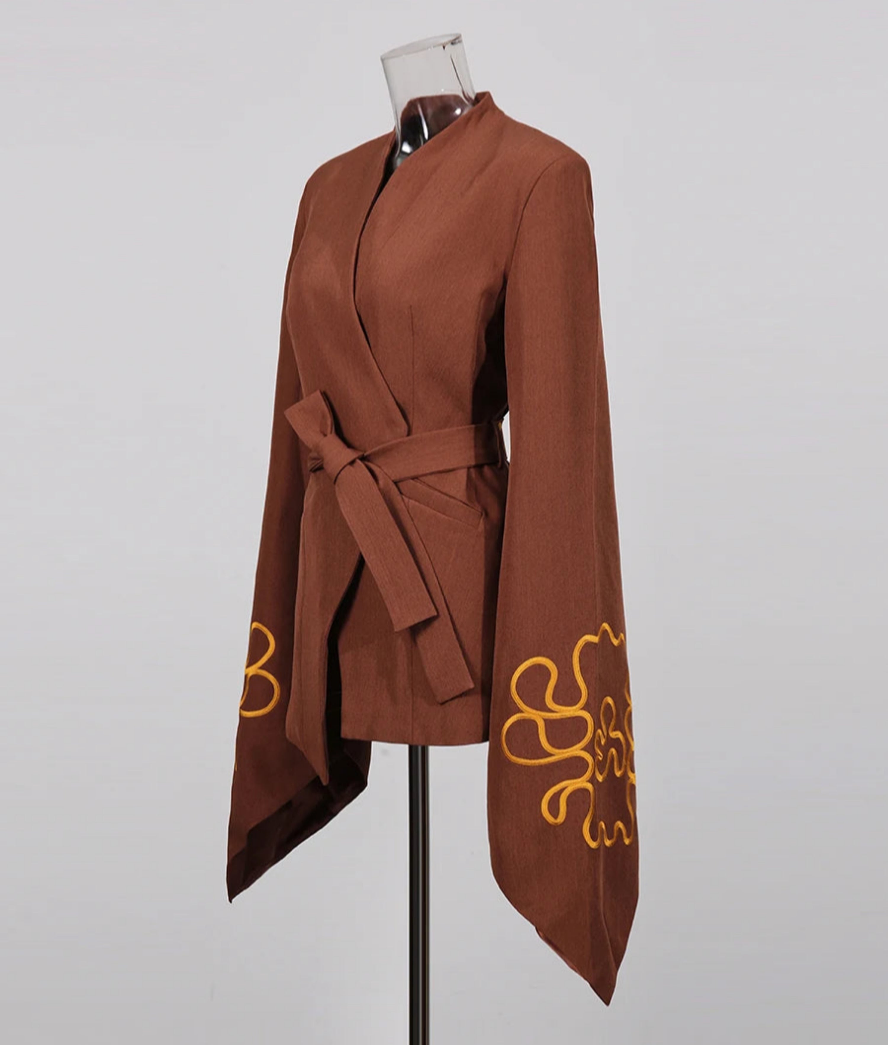 This kimono wrap blazer features premium embroidery and an asymmetric hem.