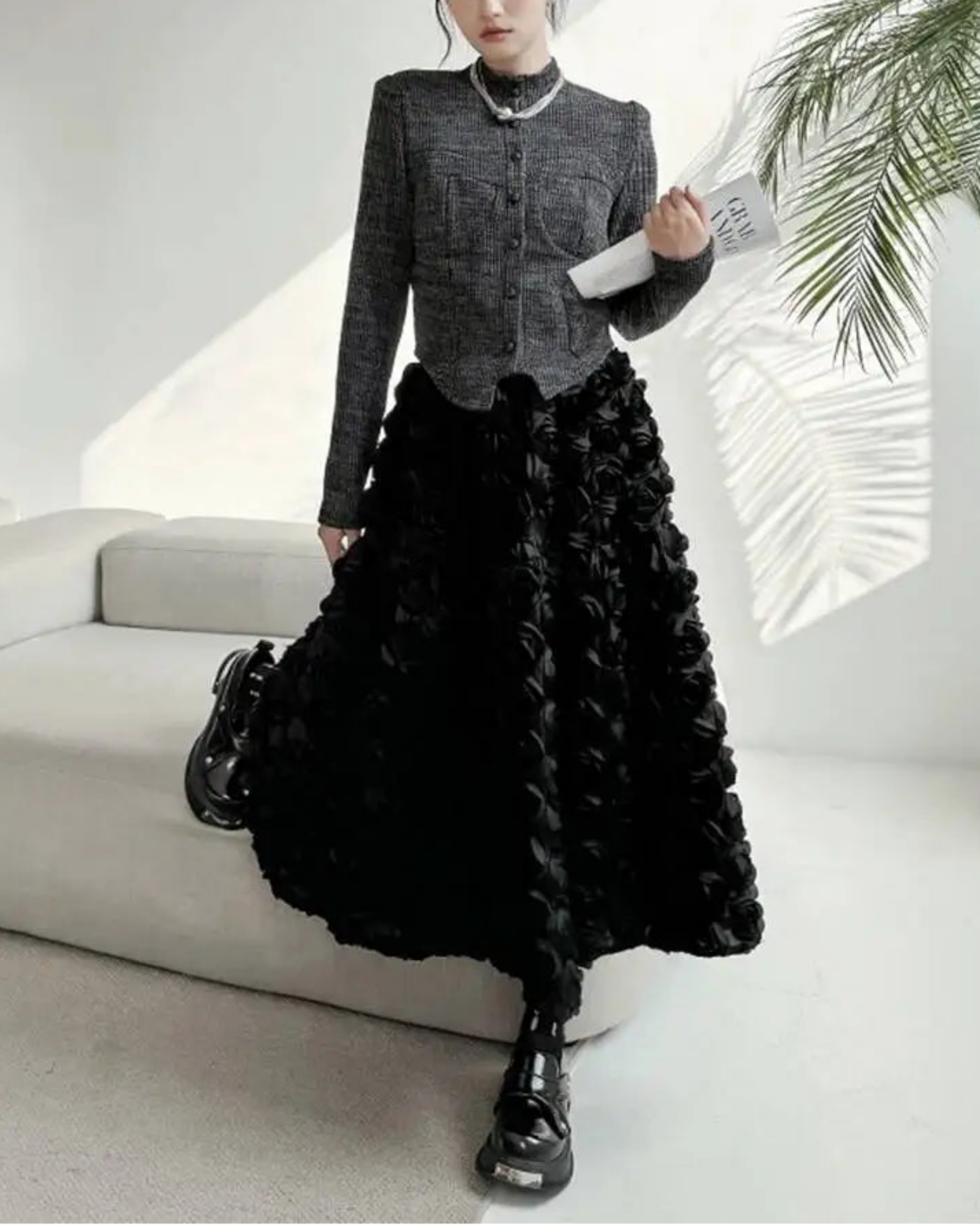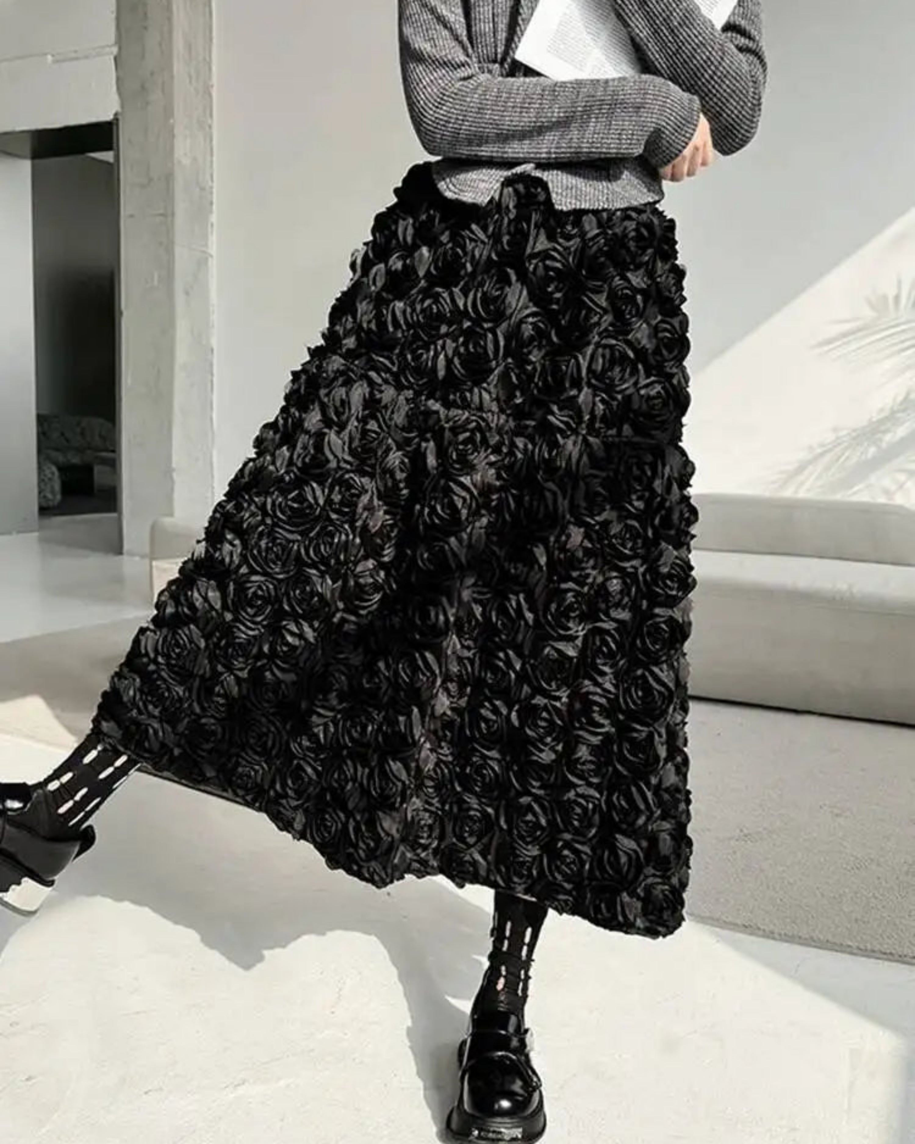 A high-waist A-line midi skirt with dramatic 3D floral appliqués.