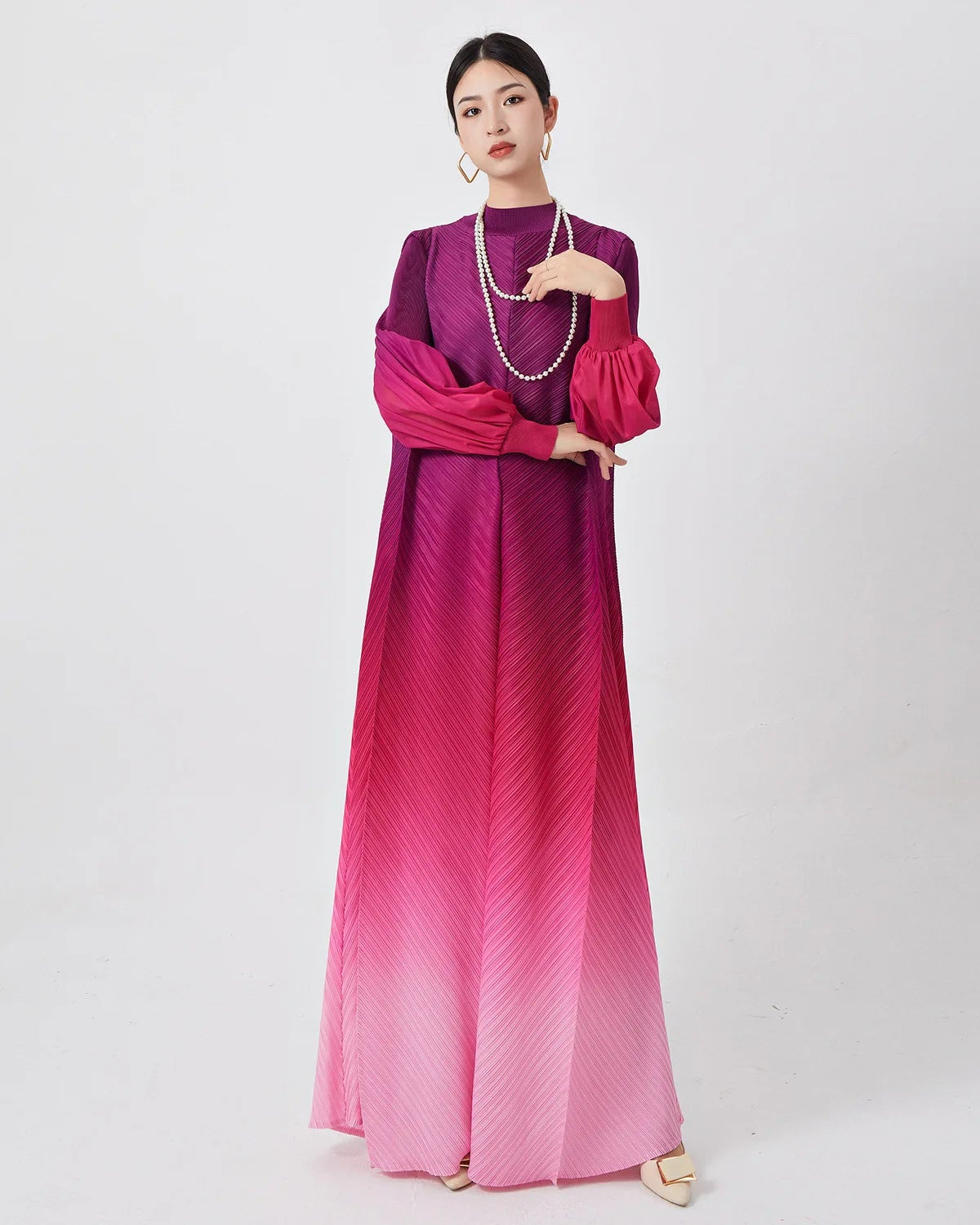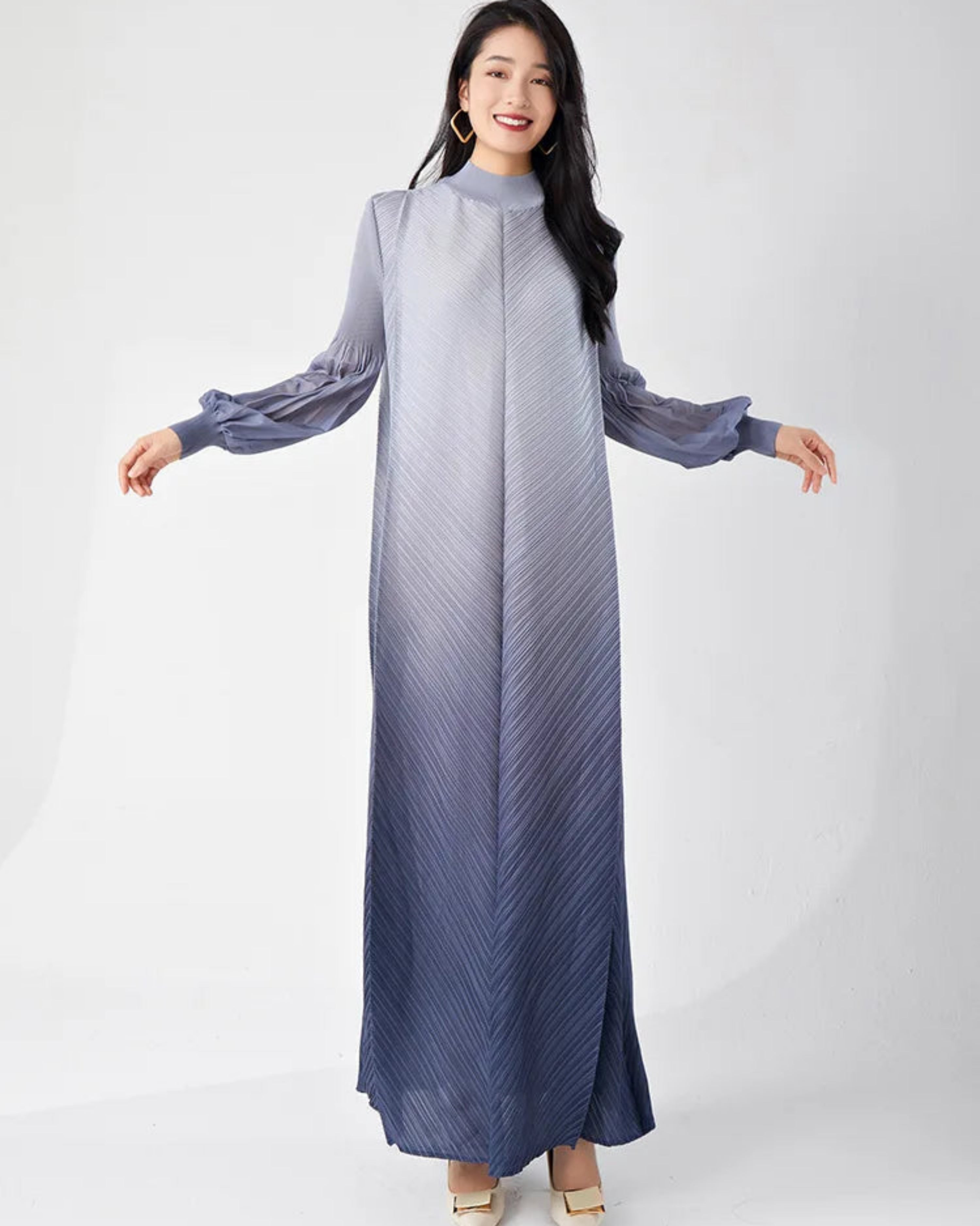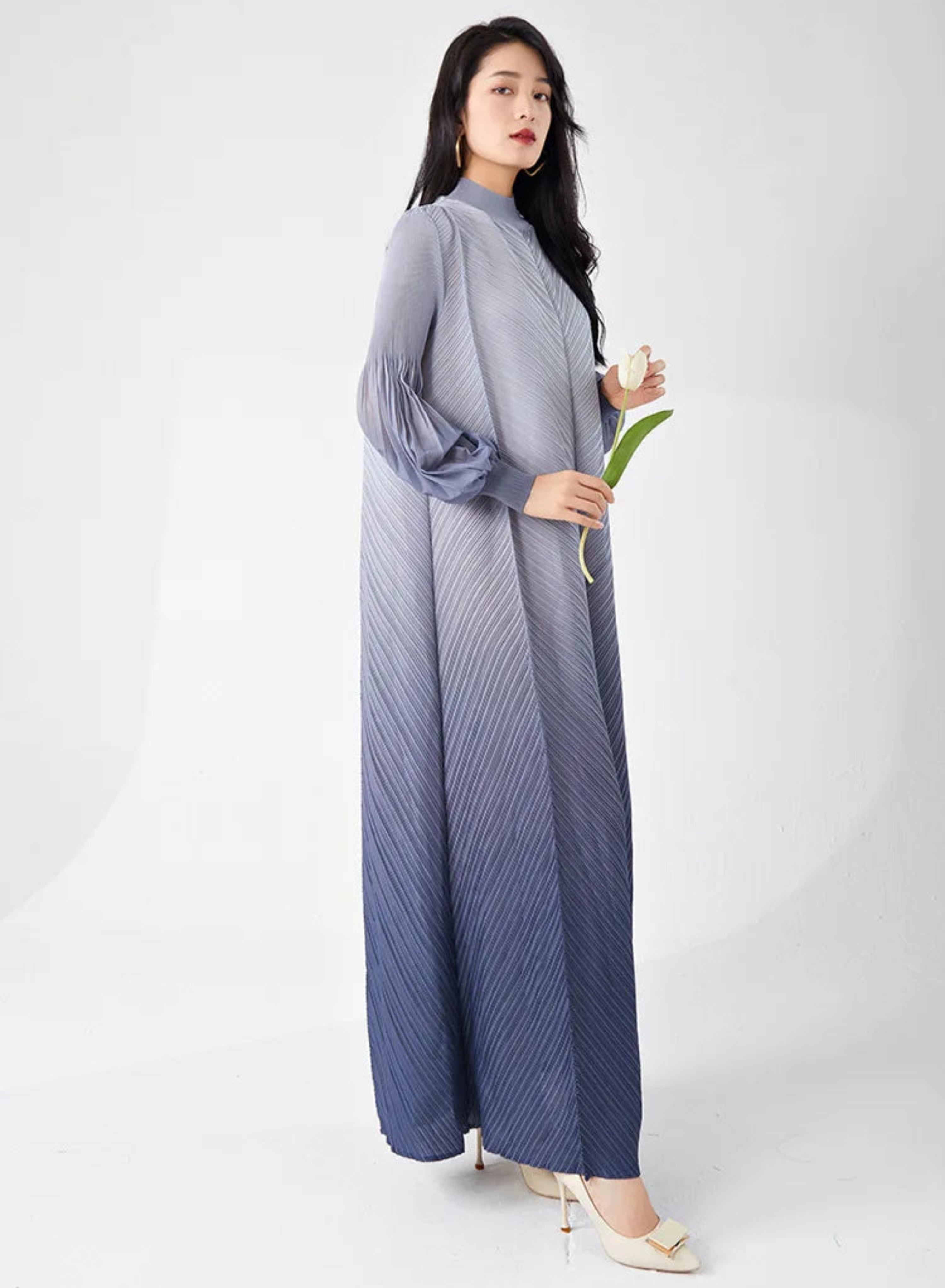 This ombre maxi dress features flowing Japanese pleats that drape beautifully for a flattering, fluid fit.
