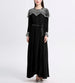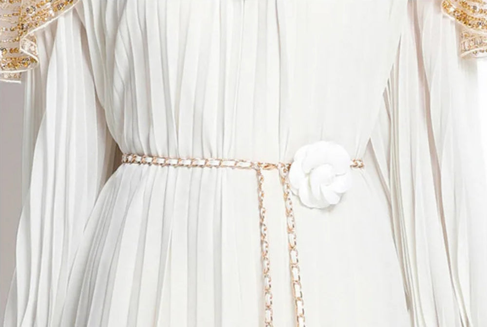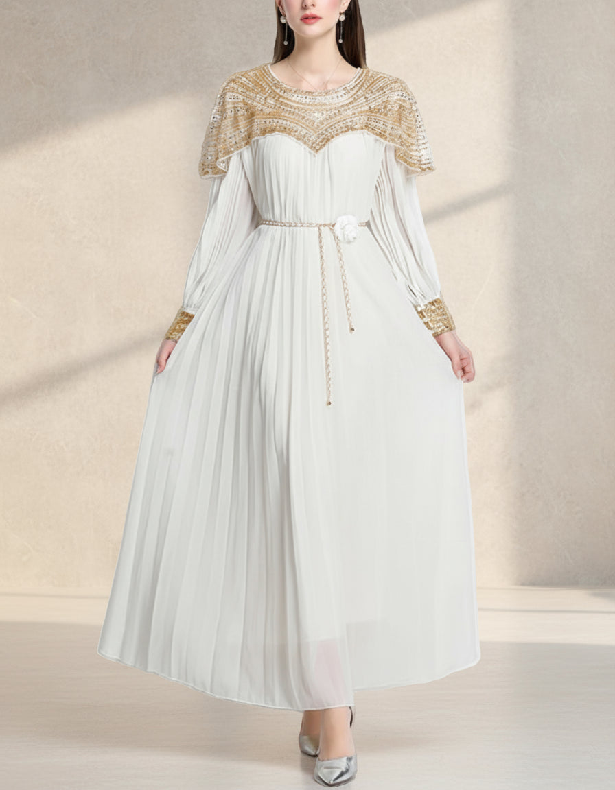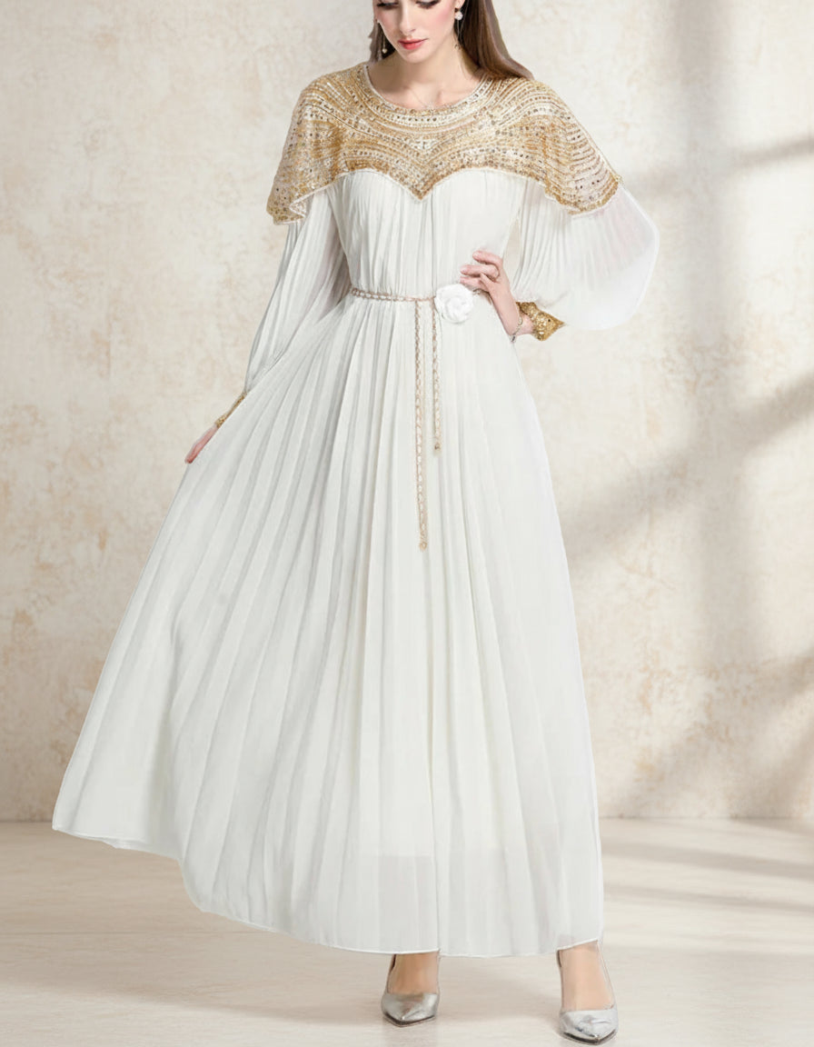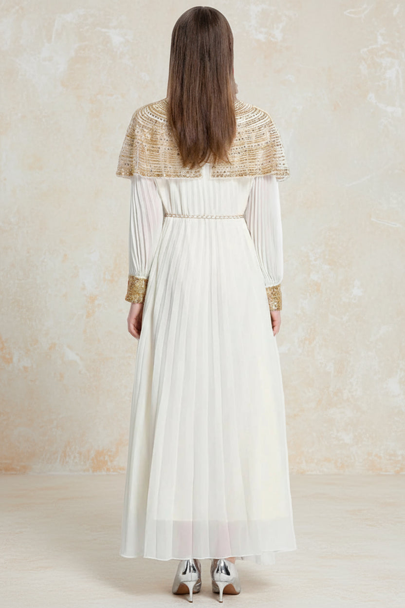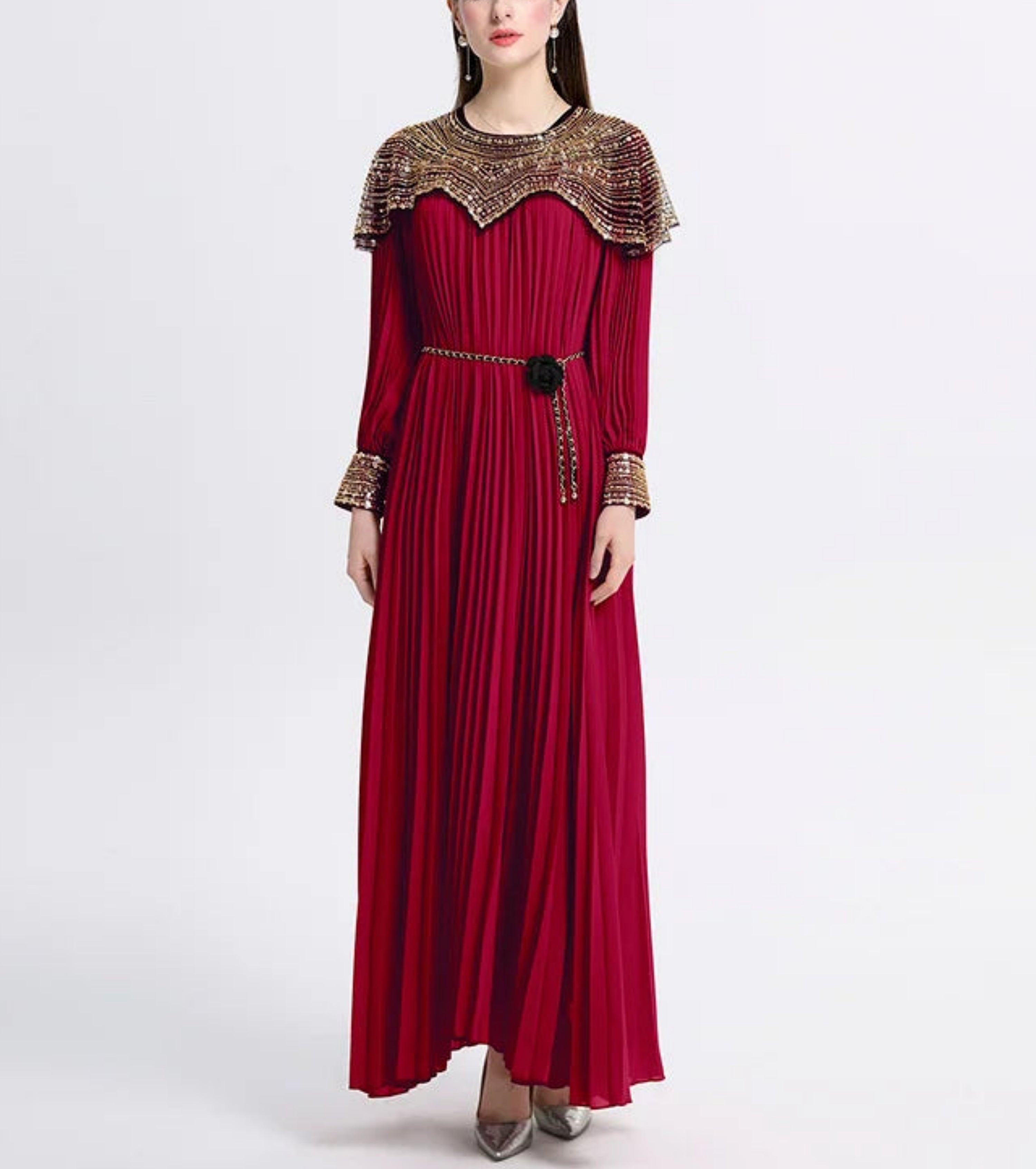The lightweight fabric drapes in a flowing, loose-fit silhouette. Long blouson sleeves and a gold sequined capelet create a luxurious, dramatic statement. Perfect for formal events, cruise evenings, and special occasions where elegance is essential.