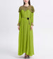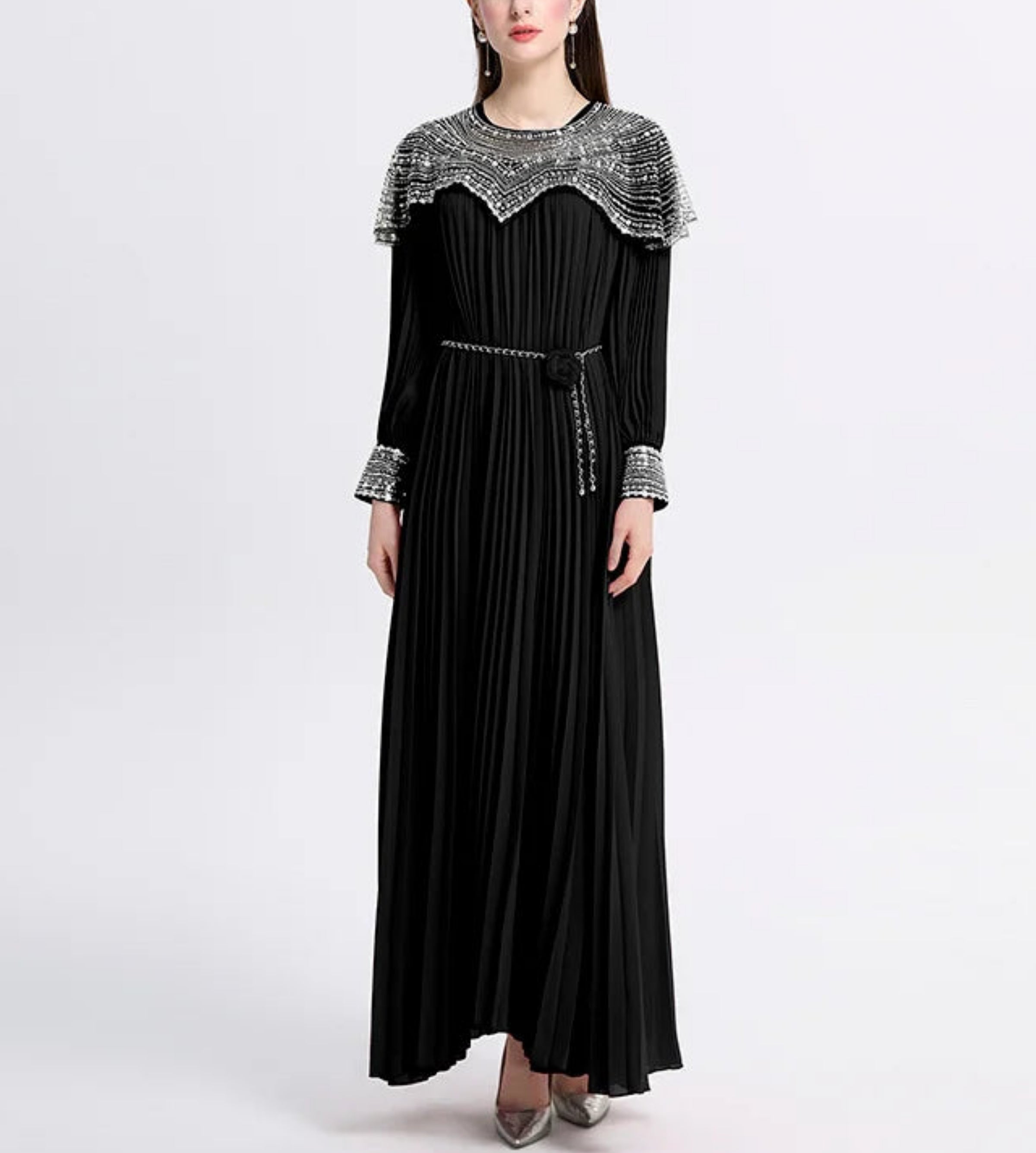 A full-length gown in premium Japanese plissé that is wrinkle-resistant, stretchy, and requires no ironing.