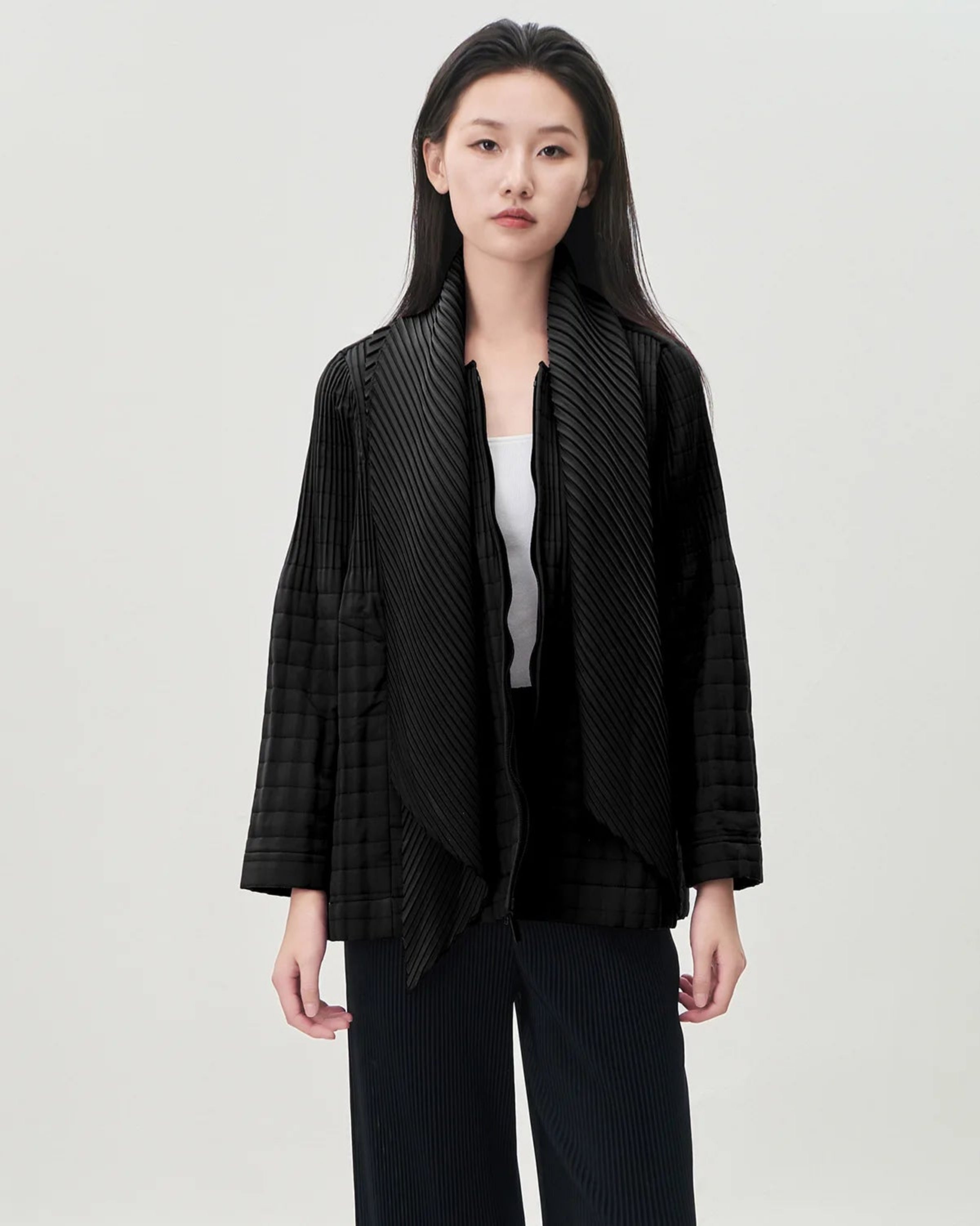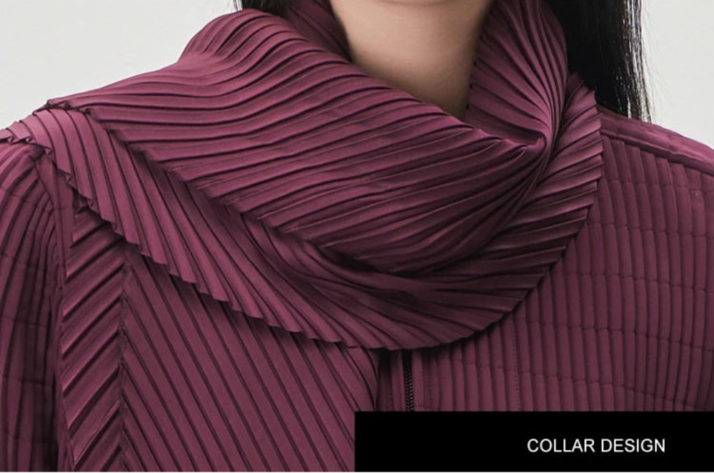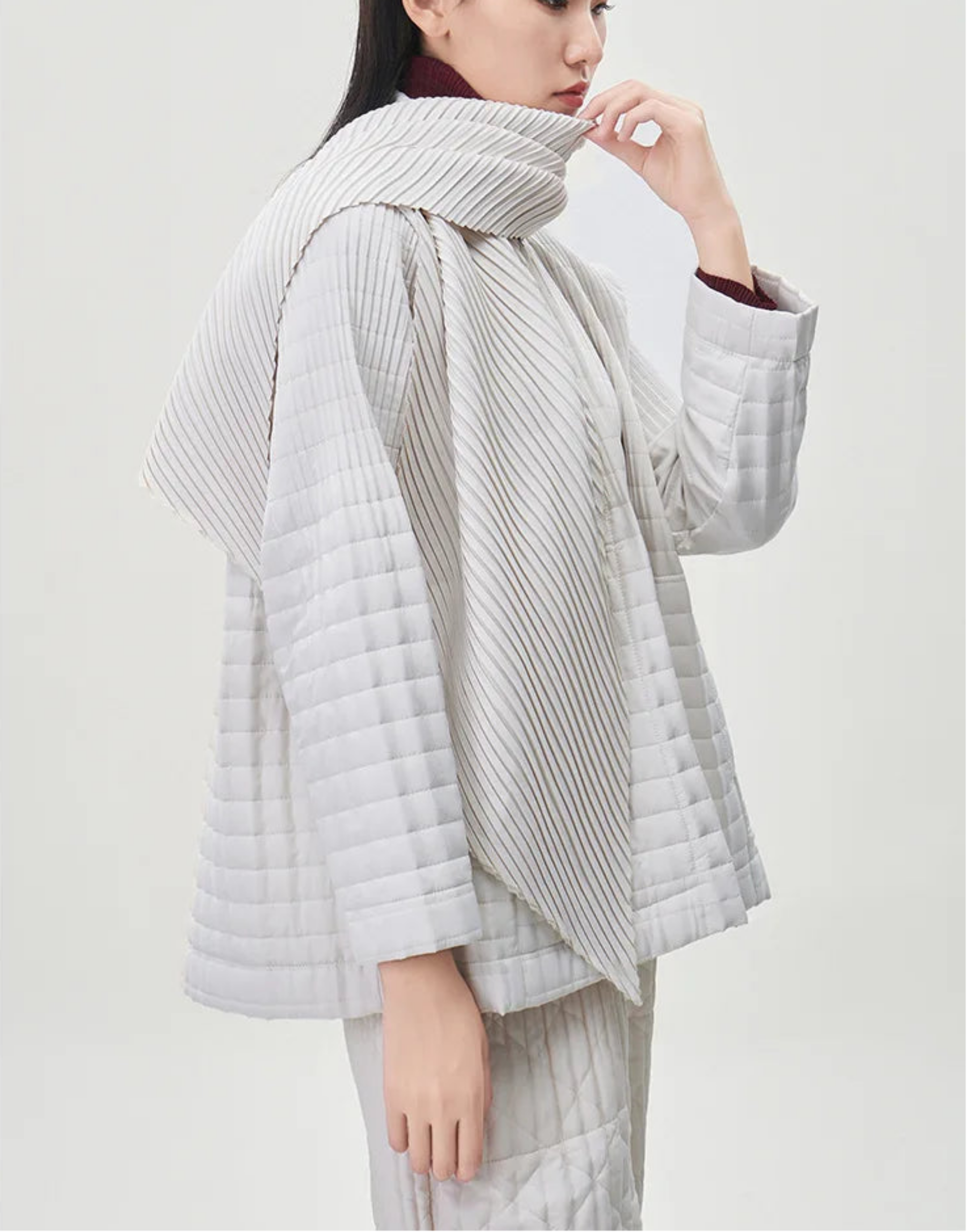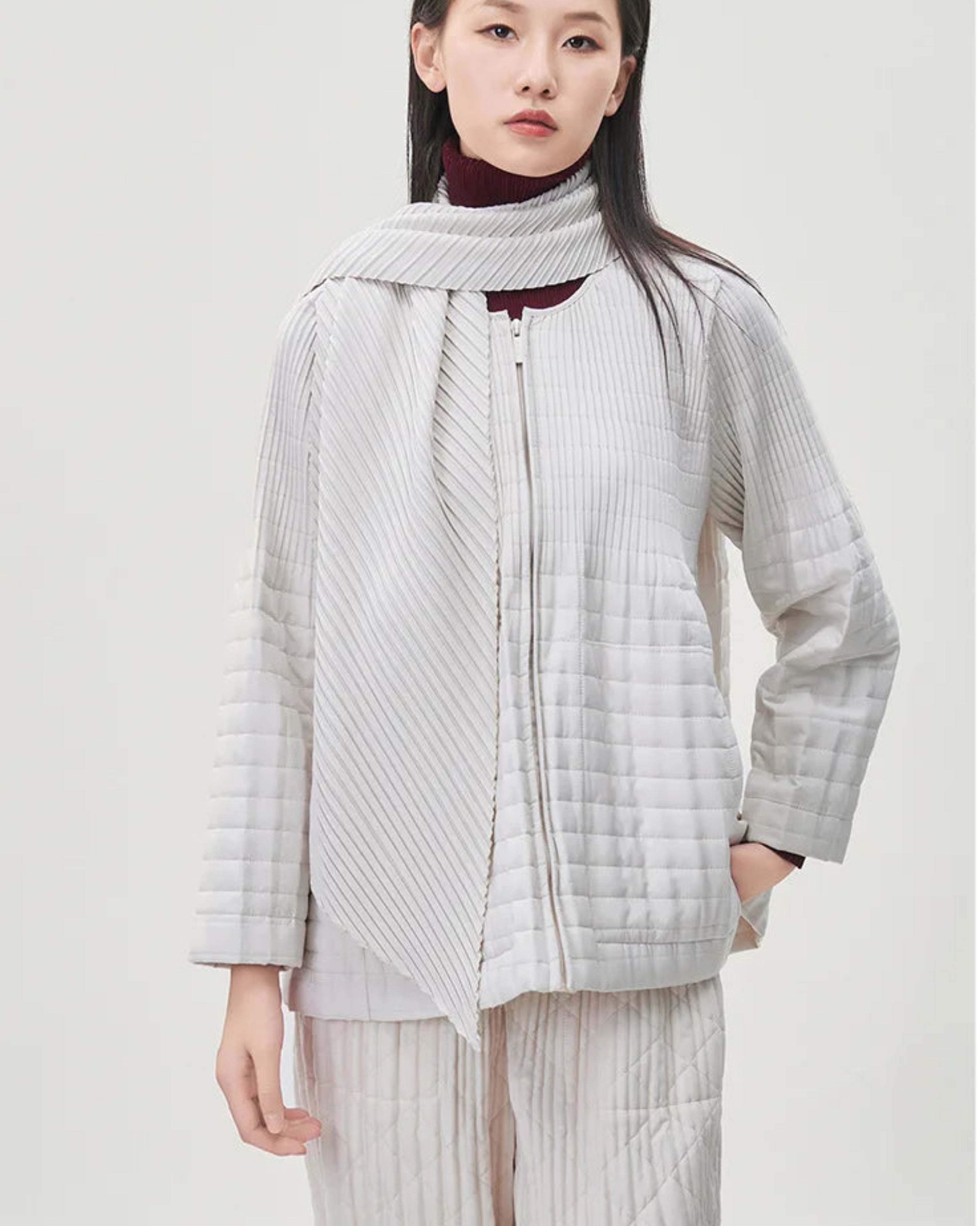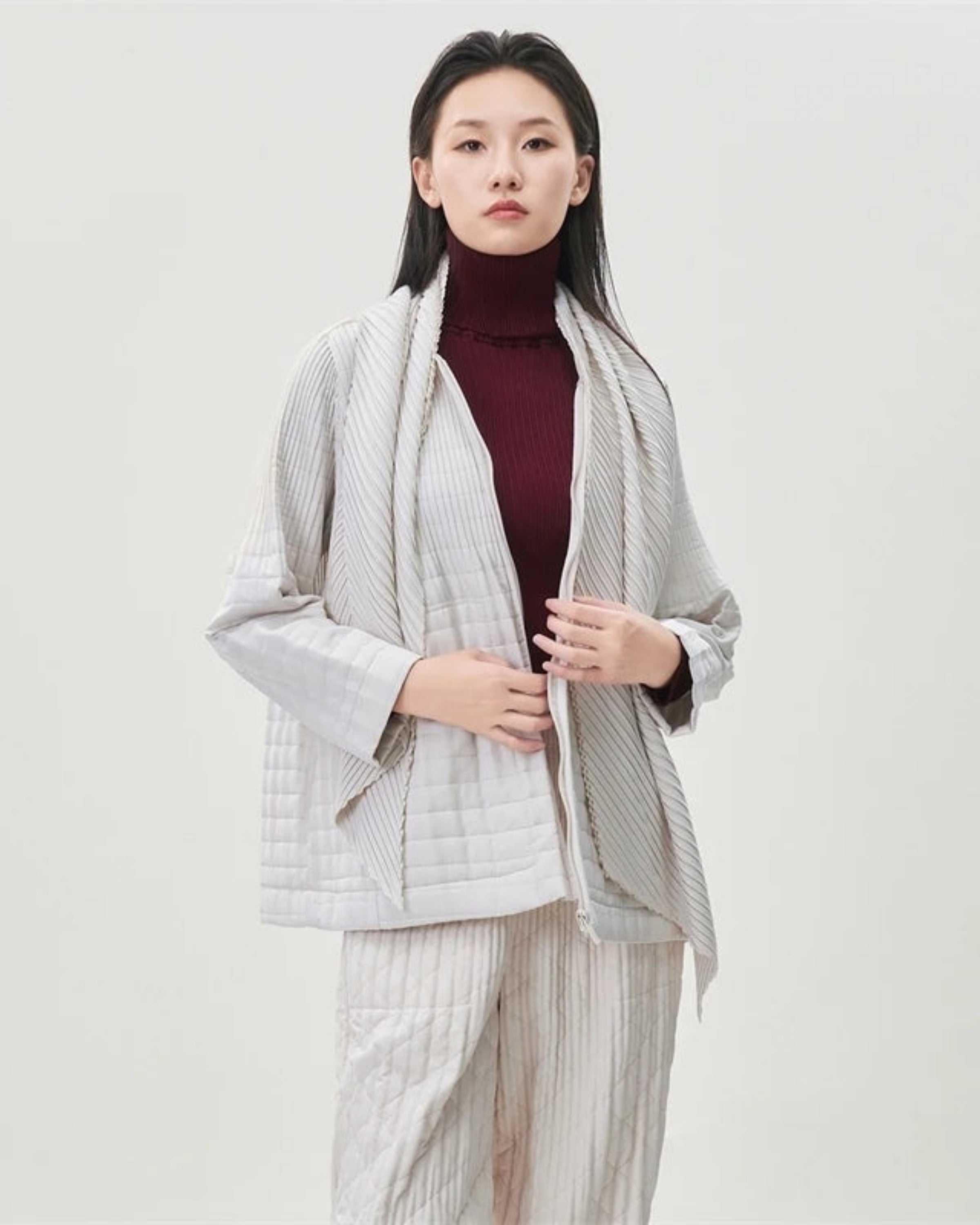 This designer jacket set features a collarless zip-up top with signature Japanese pleats and a matching travel-ready scarf.