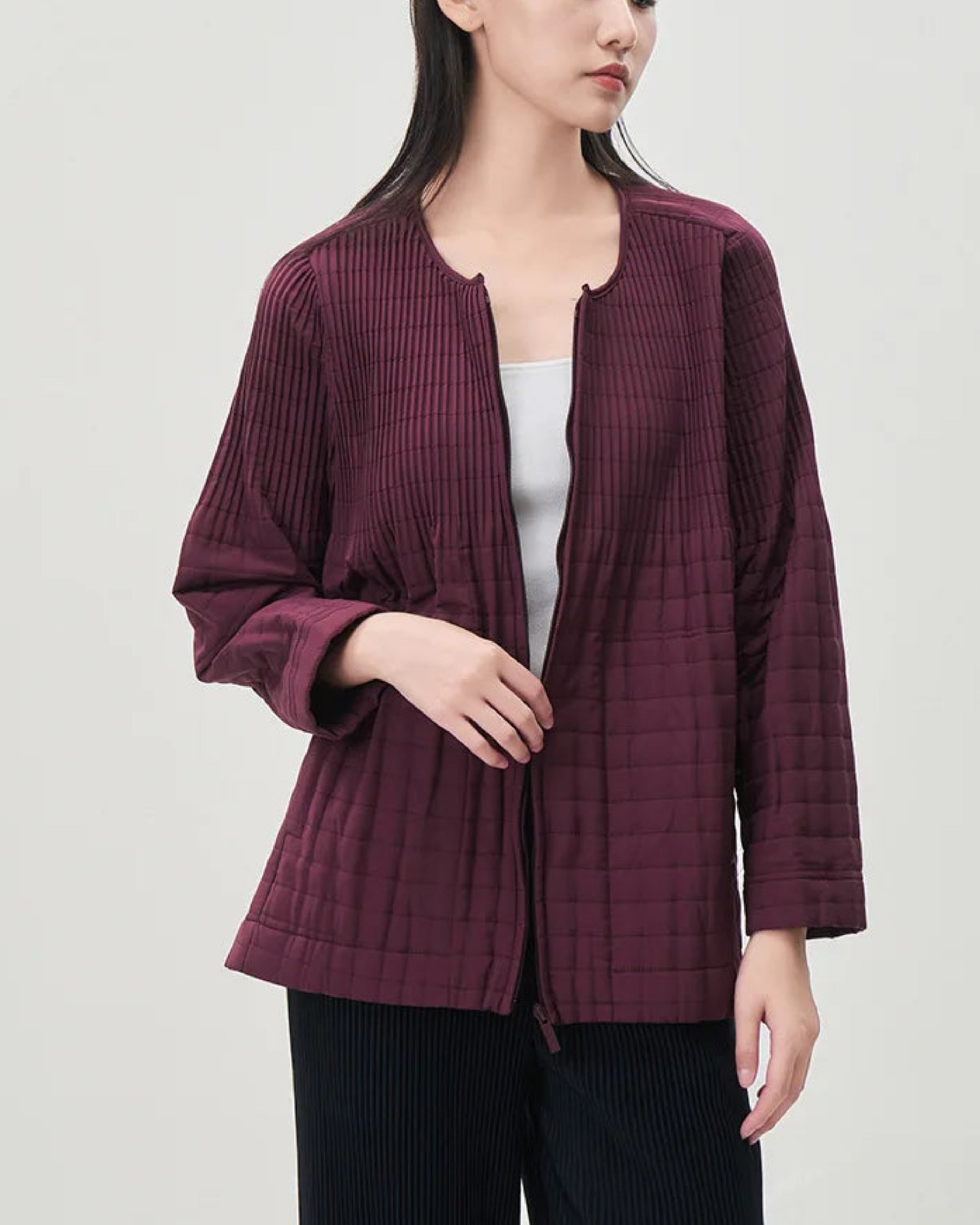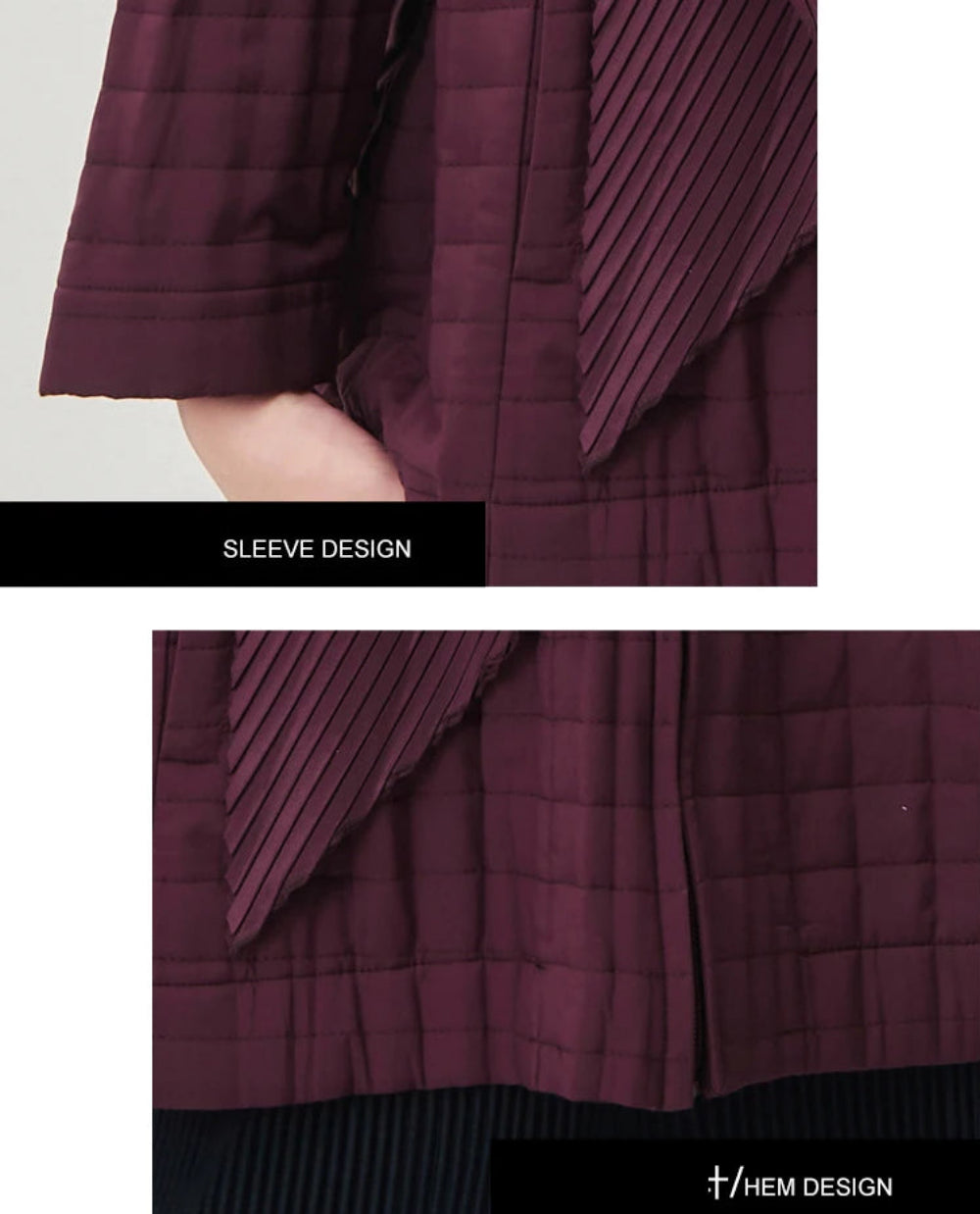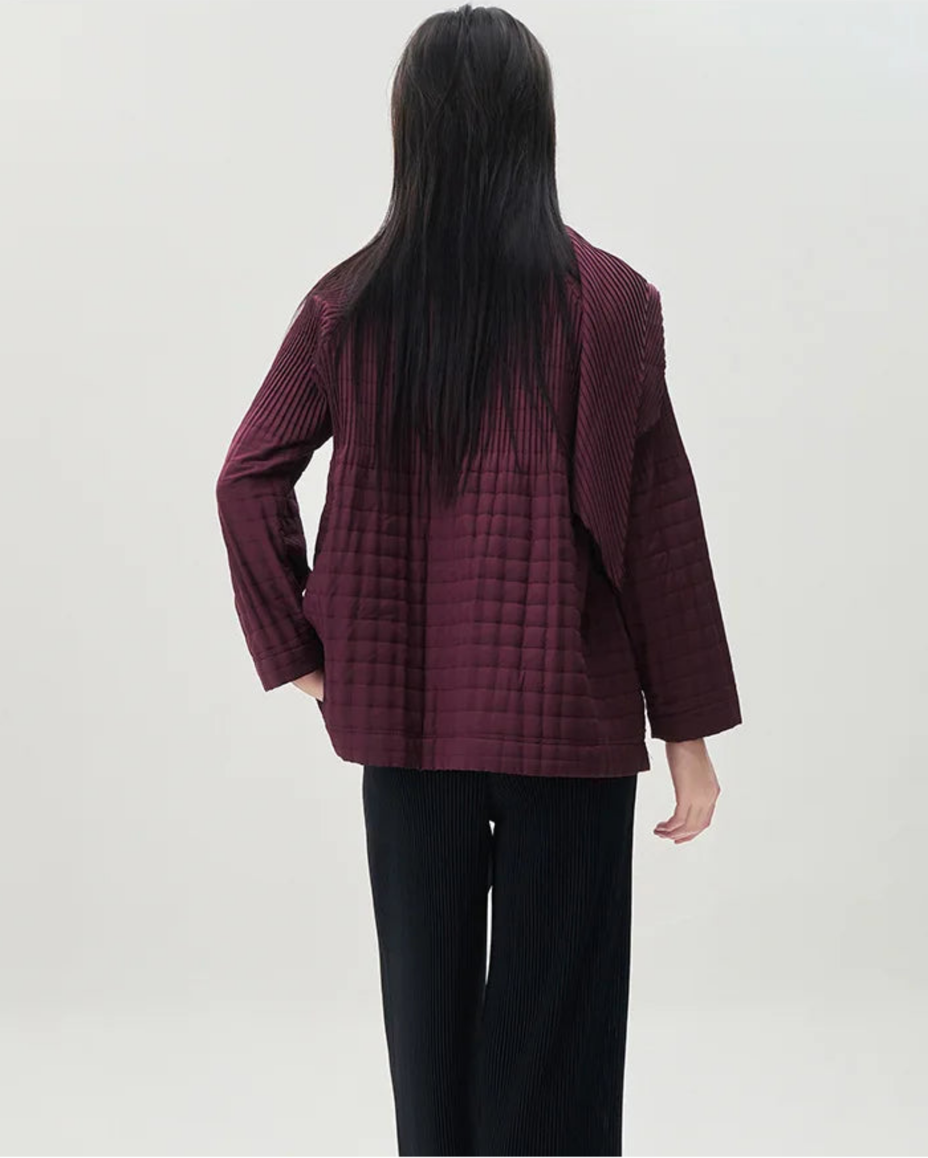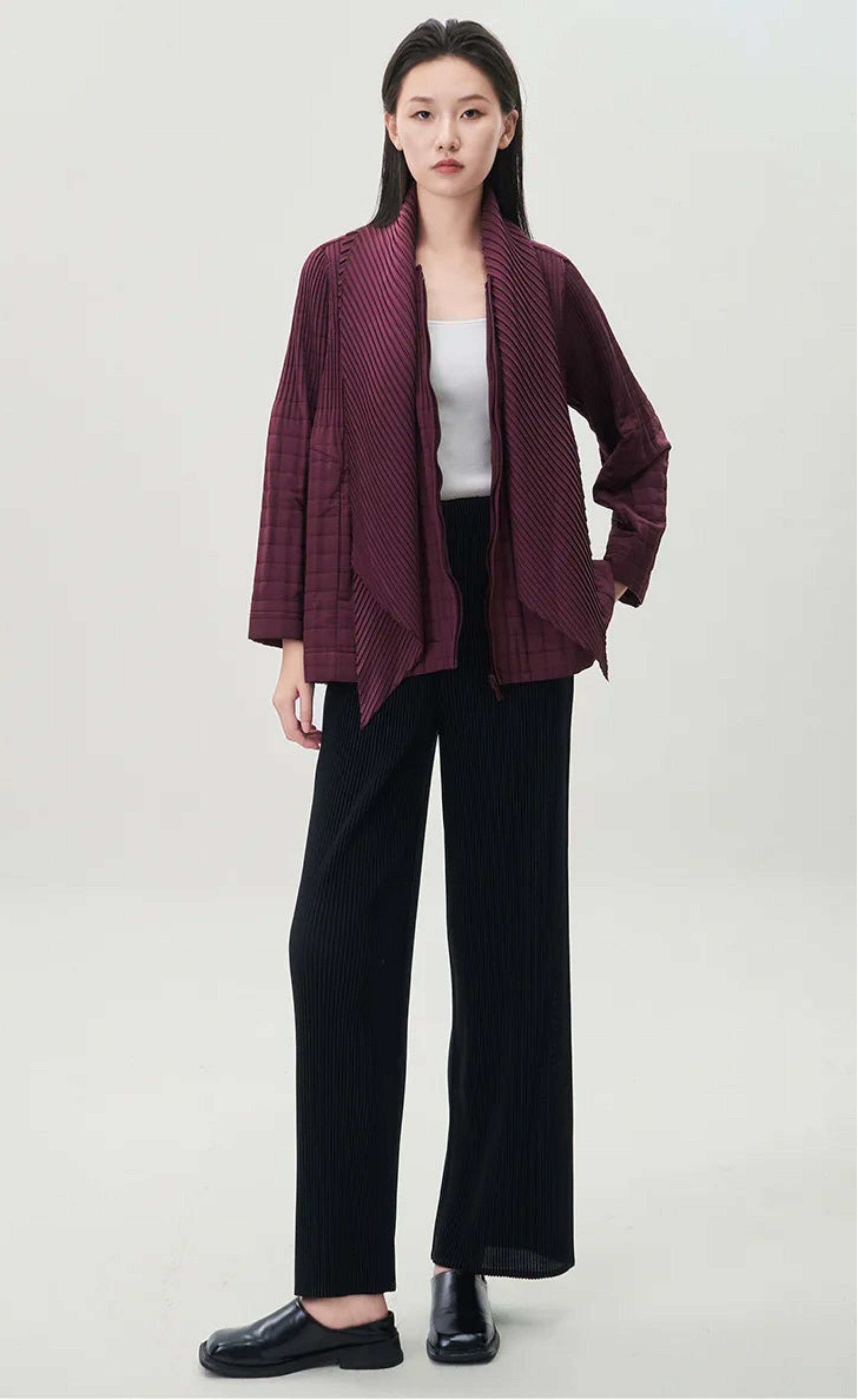 This designer jacket set features a collarless zip-up top with signature Japanese pleats and a matching travel-ready scarf.