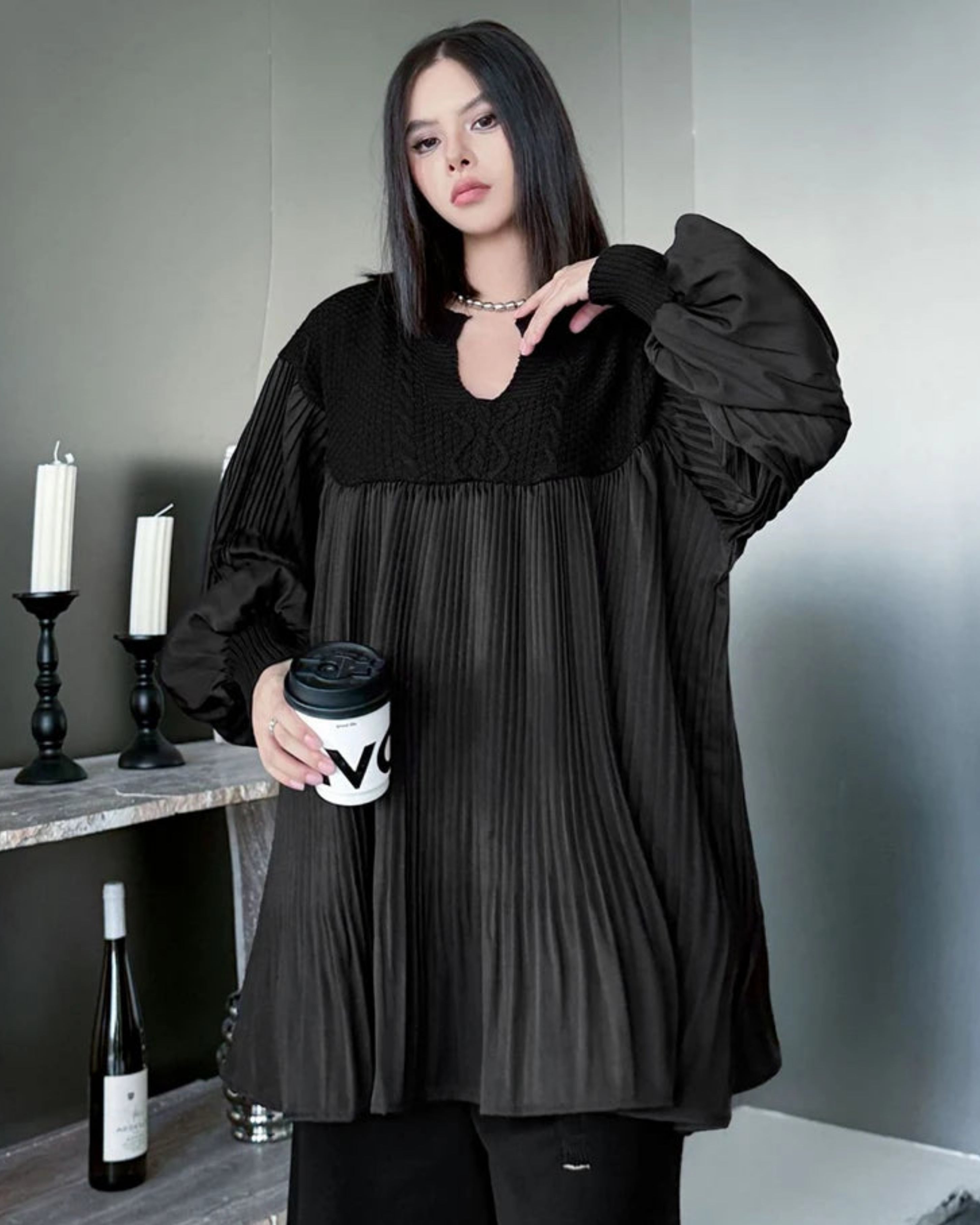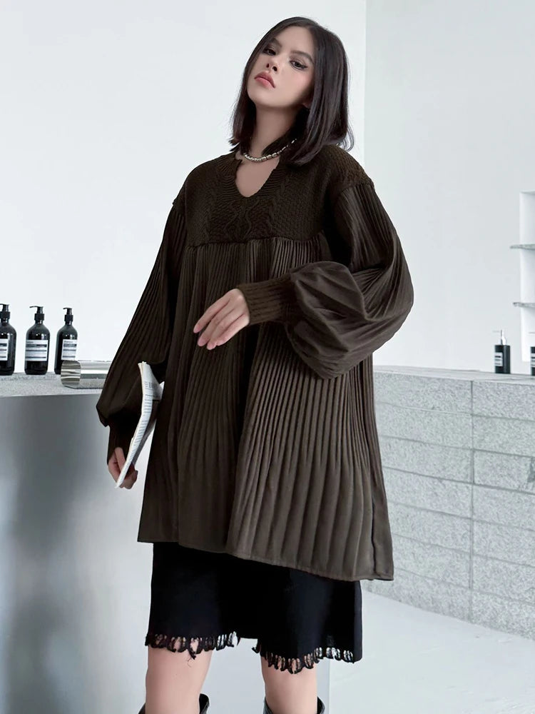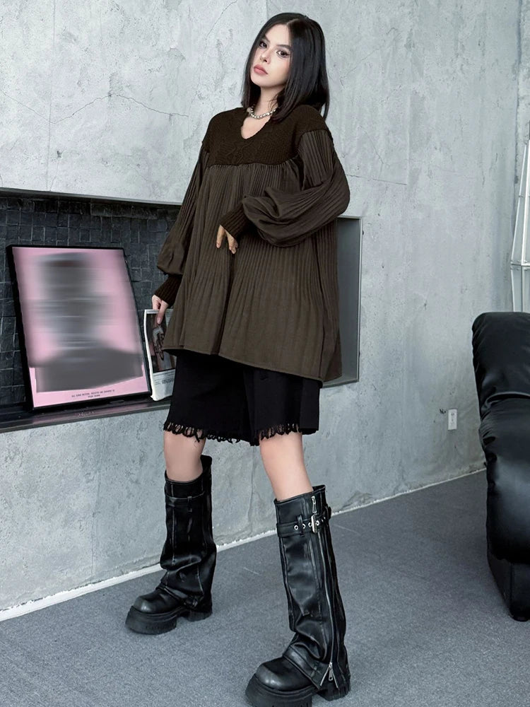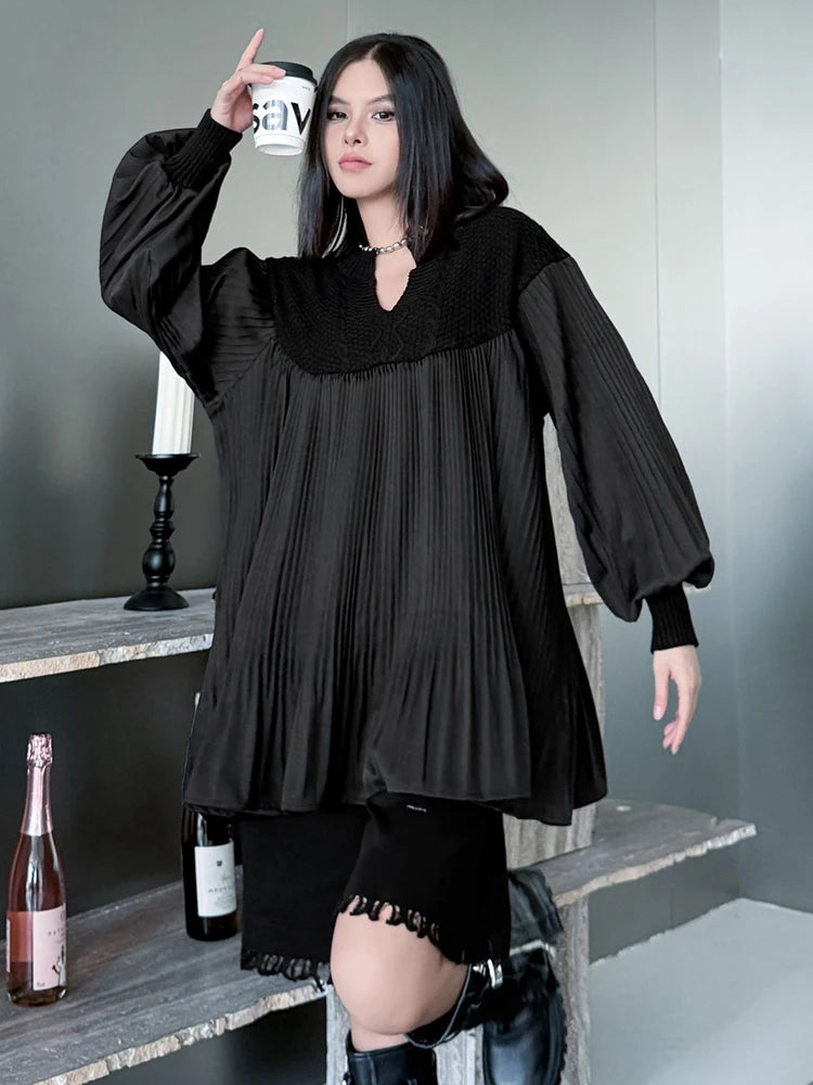 This modern oversized sweater top combines premium Japanese pleated fabric with soft knit detailing, creating a look that’s both stylish and avant-garde.