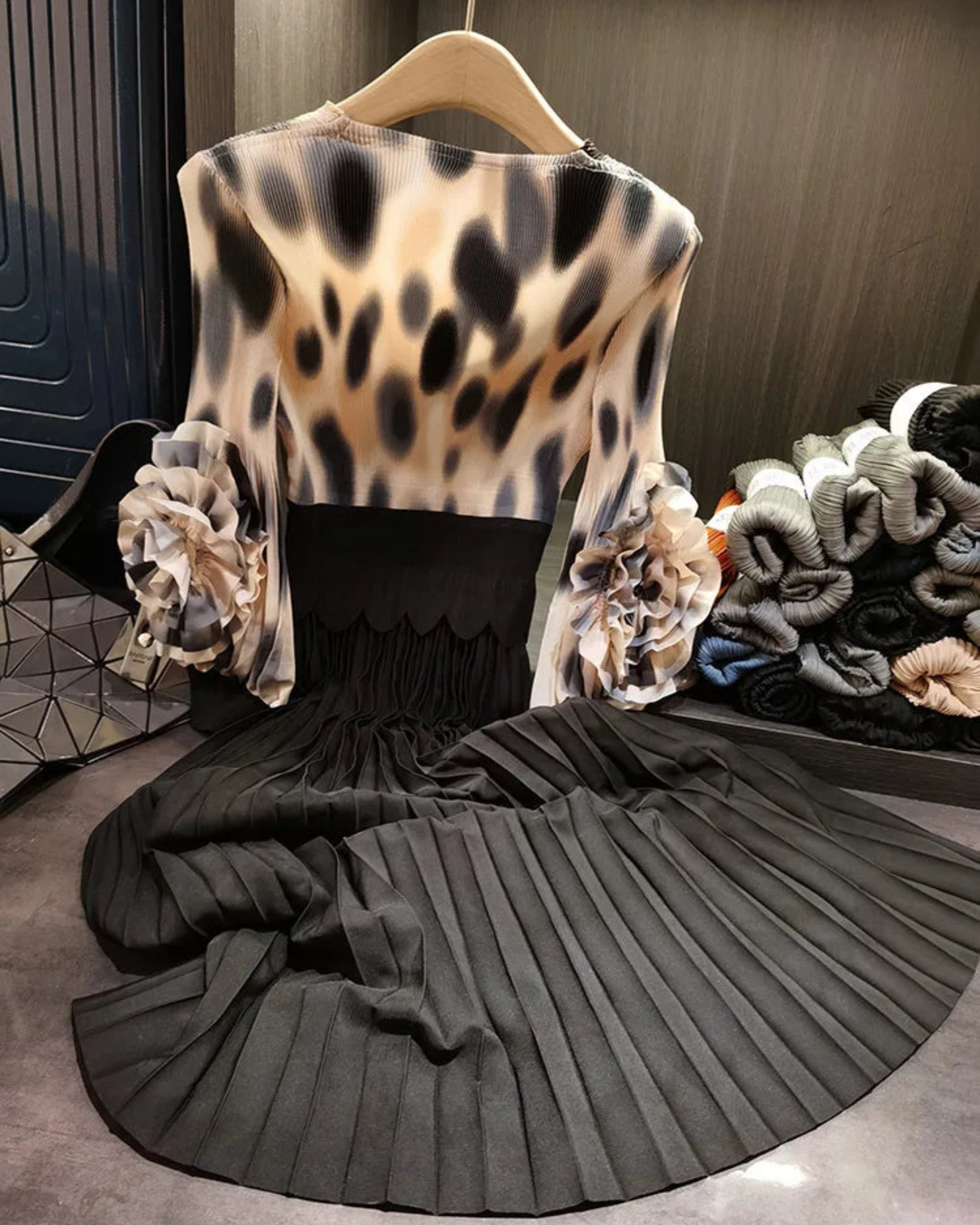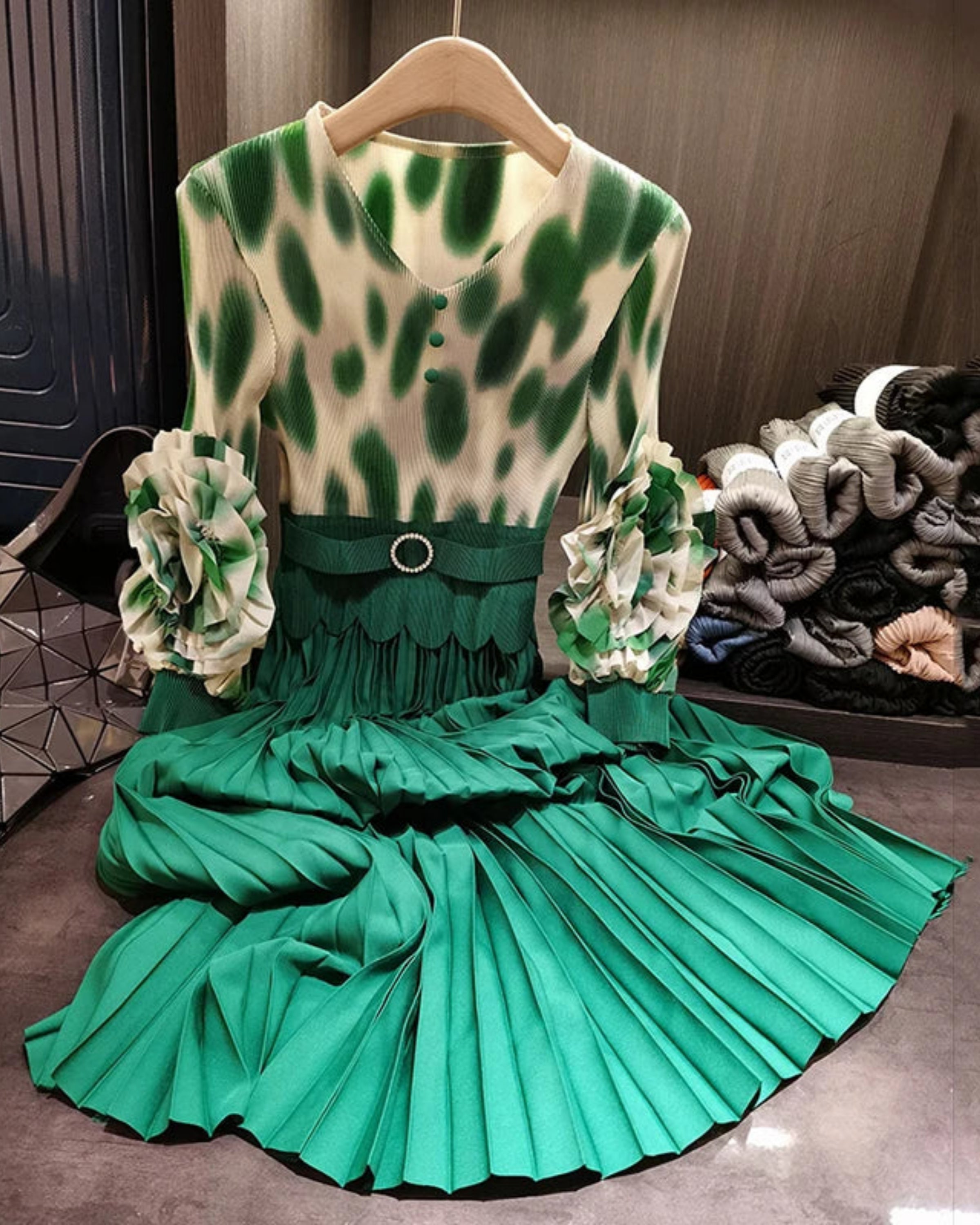 This couture pleated midi dress combines a flattering A-line silhouette with delicate ruffle sleeves for a graceful, feminine look.