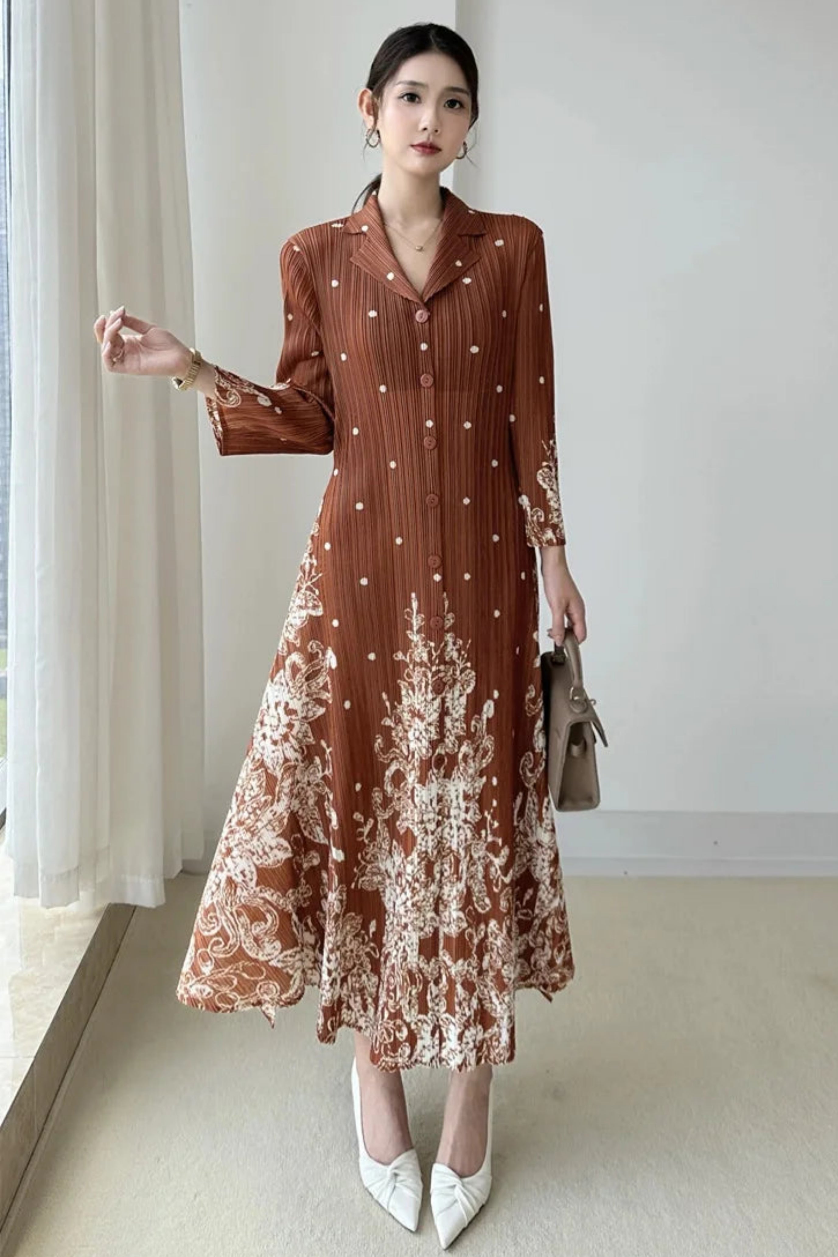 This elegant midi dress combines sophistication with comfort. Made from premium Japanese pleats, the stretchy, wrinkle-resistant fabric requires no ironing and drapes beautifully.