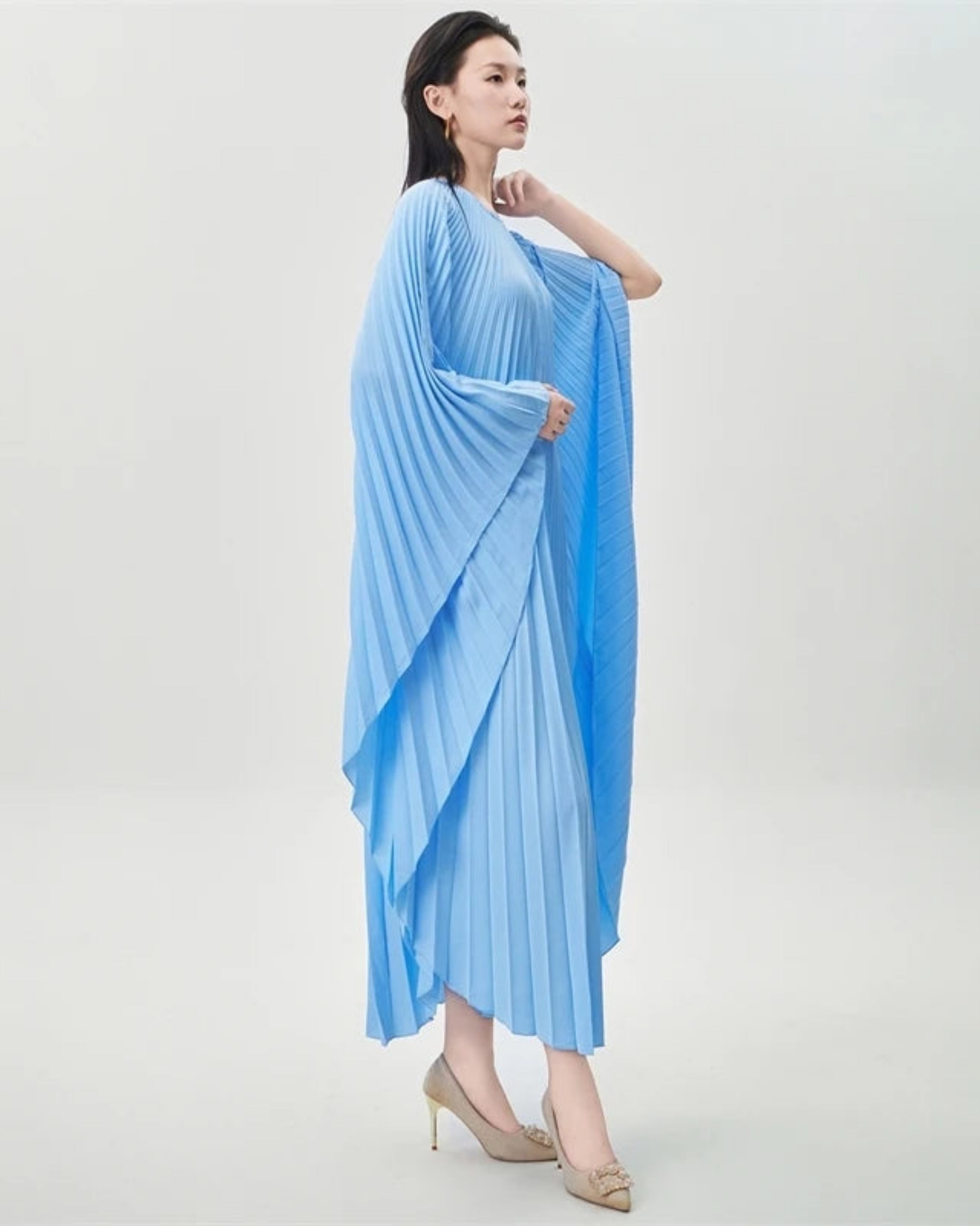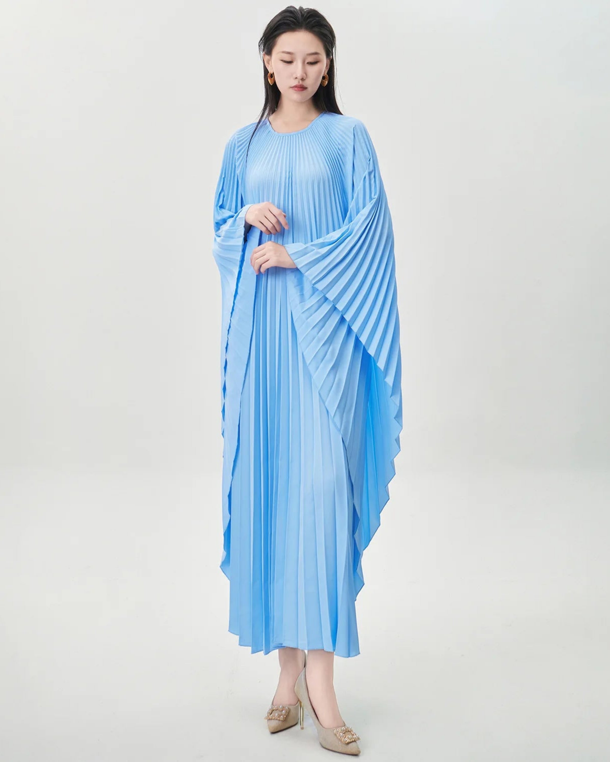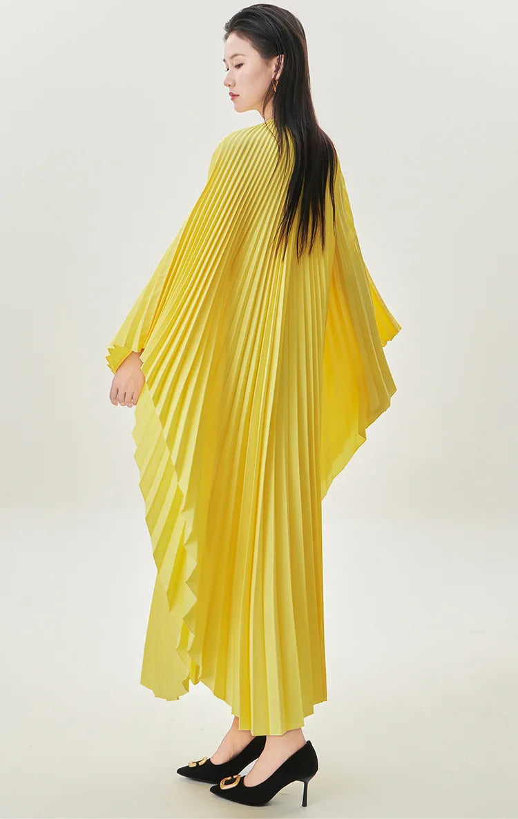 A statement piece crafted from premium Japanese plissé fabric. This flowing cape dress combines elegant movement with sculpted pleats that hold their shape beautifully.